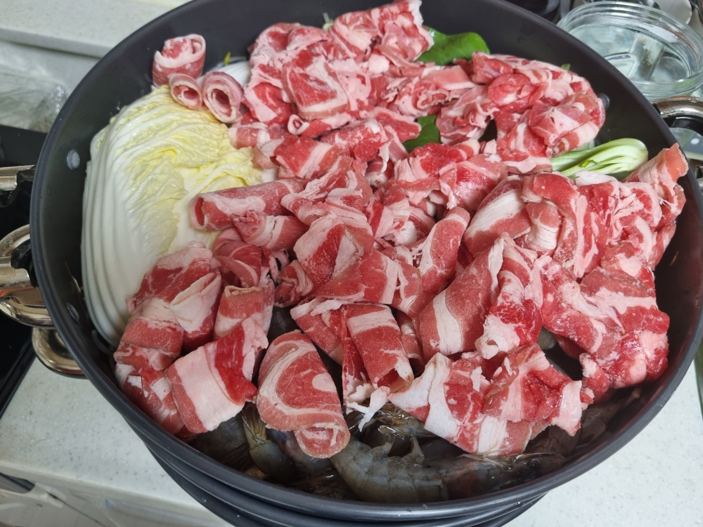 2번째 판에는 숙주 깔고, 알배기, 청경채 넣고 새우 조금, 우겹살을 넣었어요. 사실 차돌도 샀는데 차돌이 좋아 보이지 않아서 일단 우겹살만 넣었어요. 20분 동안 쪄요.