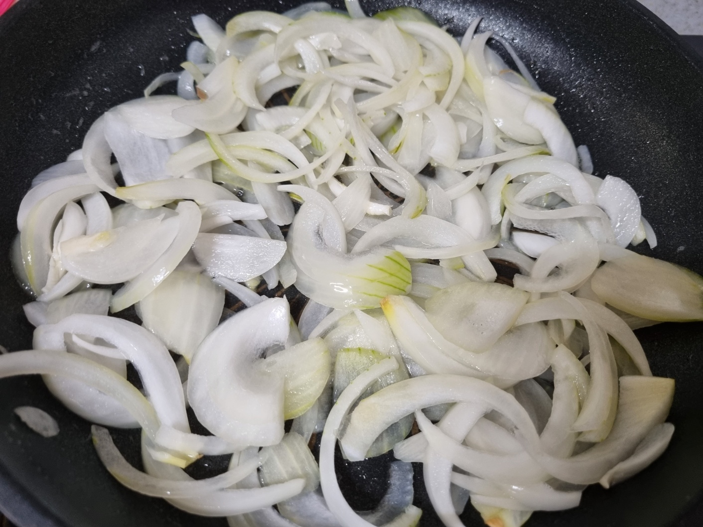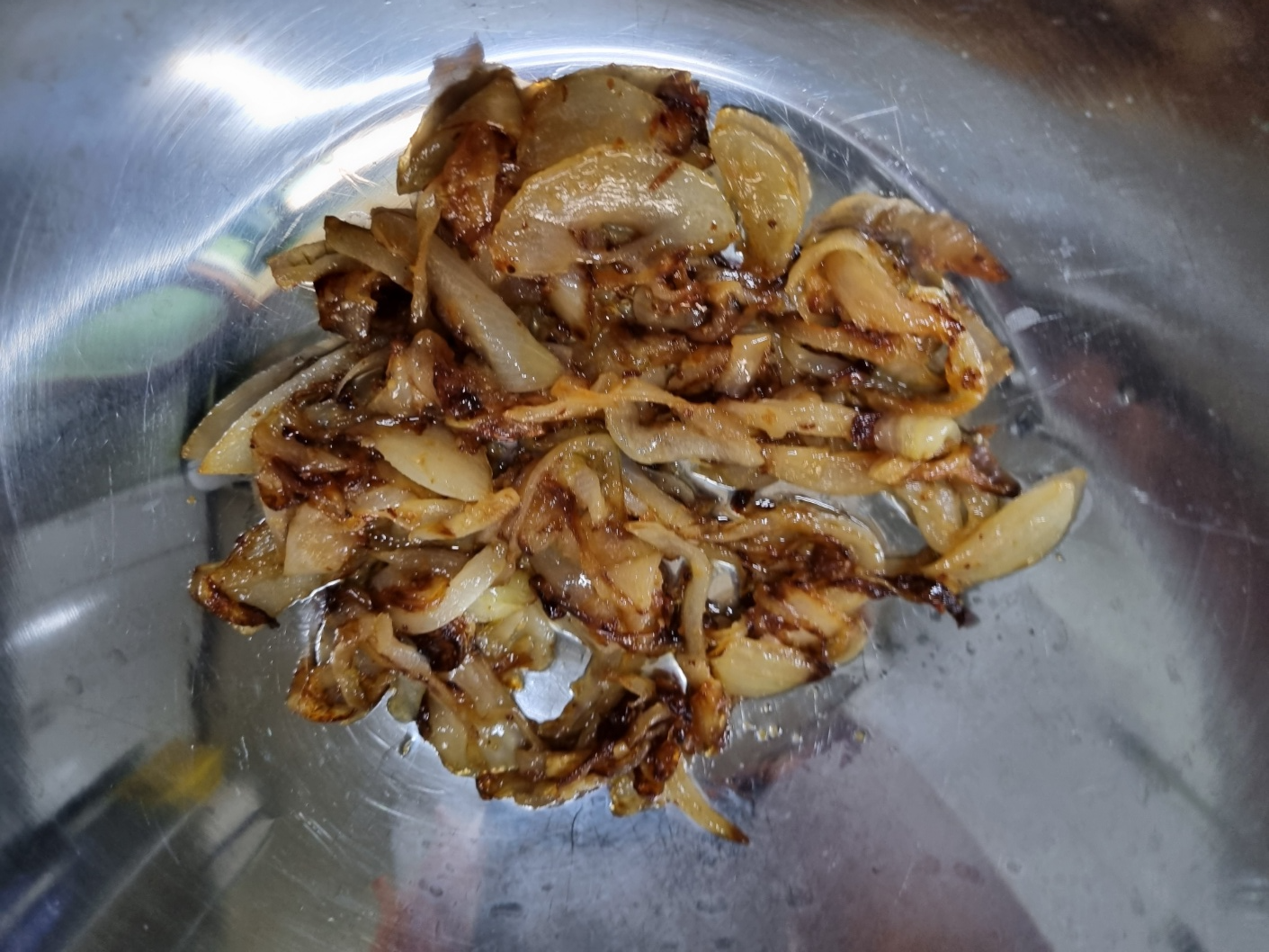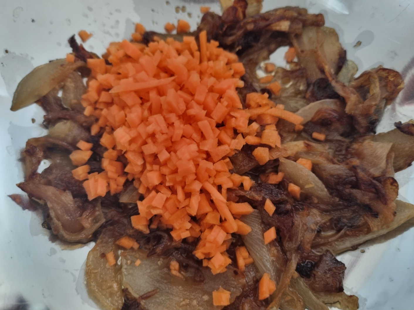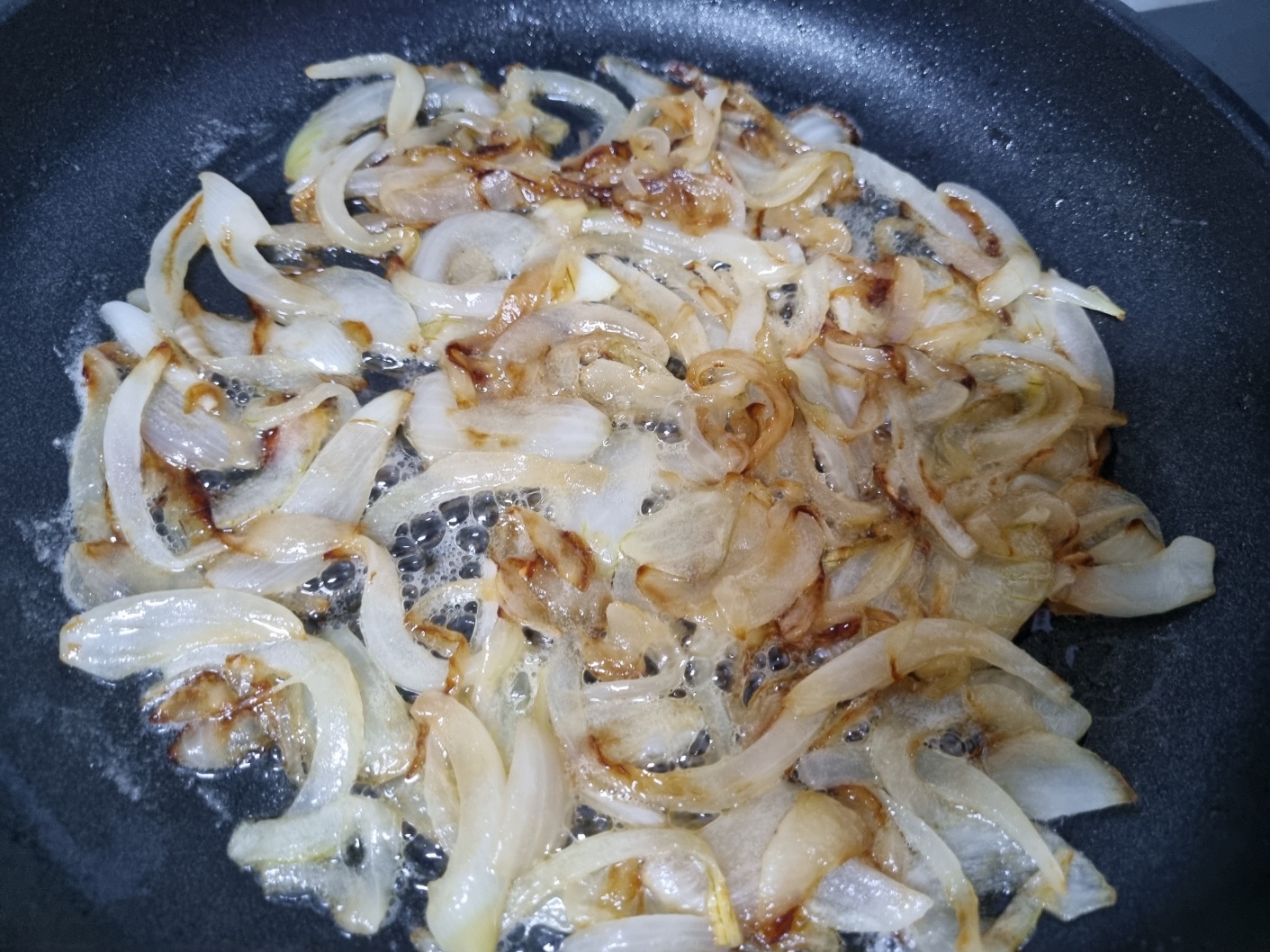 일단 양파는 생양파를 사용하면 물이 나와서 반죽하기 힘들어져요. 그래서 양파를 잘라서 볶았어요. 전문 용어로 카라멜라이징이라고 한대요. 사실 다졌어야 되는데 칼질이 귀찮아요. 볶고 나서 가위로 잘라도 충분해요.