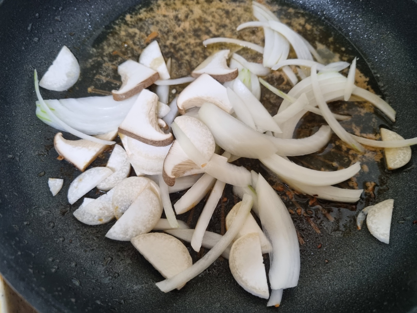 고기 구웠던 팬에 그대로 버섯과 양파를 넣었어요. 구기 구운 팬에 맛있는 거 다 있어요. 설거지 팬도 하나 줄일 수 있어요.