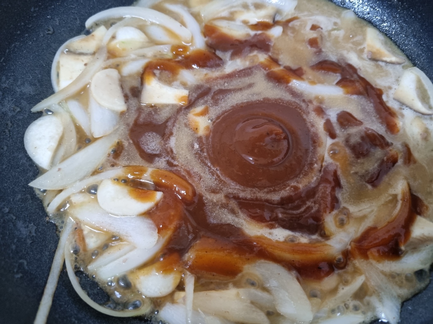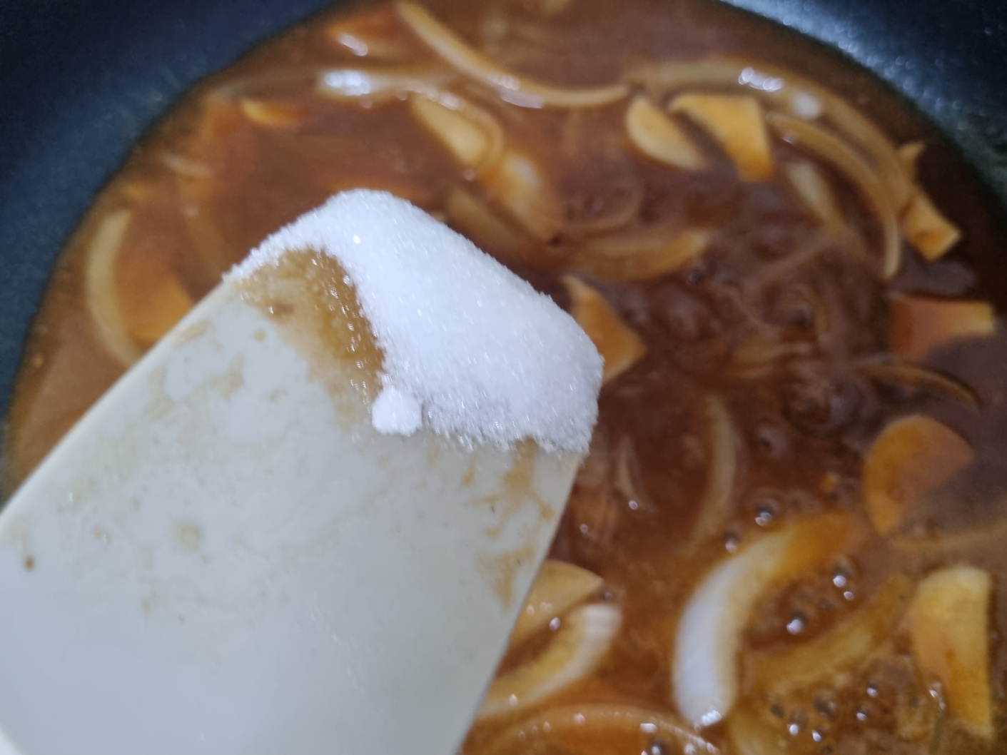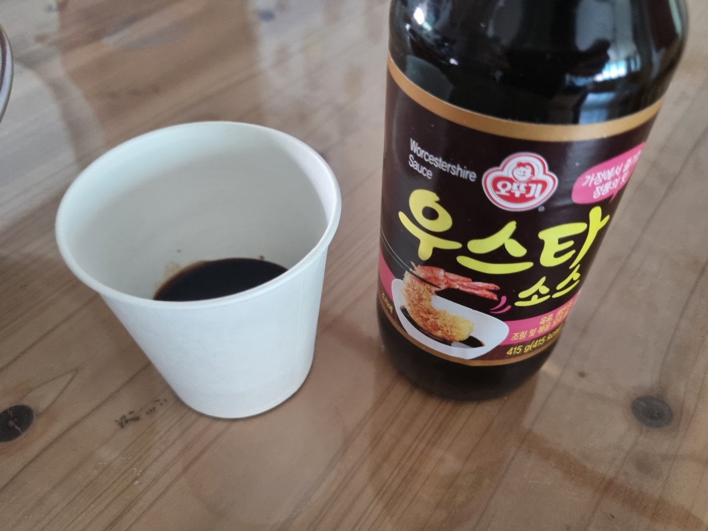 끝나지 않았어요. 맛있는 거 또 넣어요. 설탕을 한 숟가락 정도 더 넣었어요. 그리고 물을 종이컵으로 반컵 넣고 은은한 불에서 끓였어요. 우스타 소스와 돈까스 소스가 없다면 간장과 케찹을 사용하라고 했어요. 하지만 그만큼 맛이 좀 떨어지긴 한다고 했어요.