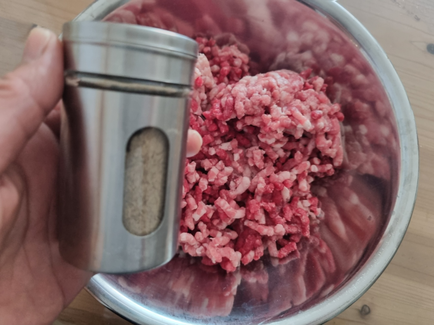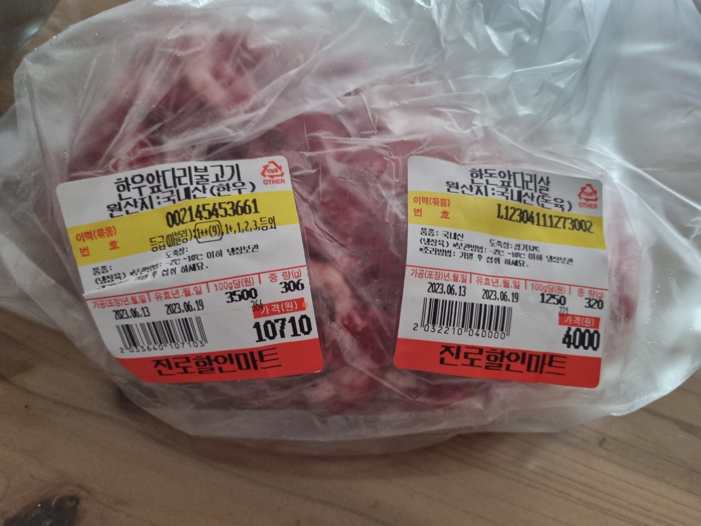 양파가 식는 동안 마트에 갔어요. 다진 소고기 반 근, 다진 돼지고기 반그늘 샀어요. 정확히는 306g, 320g이네요. 집에 와서 중량 확인하려고 봤는데 한우 투뿔 넘버 나인이네요. 정말 미련한 짓 했어요. 백종원 선생님이 다짐육은 제일 싼 거 사라고 했는데...