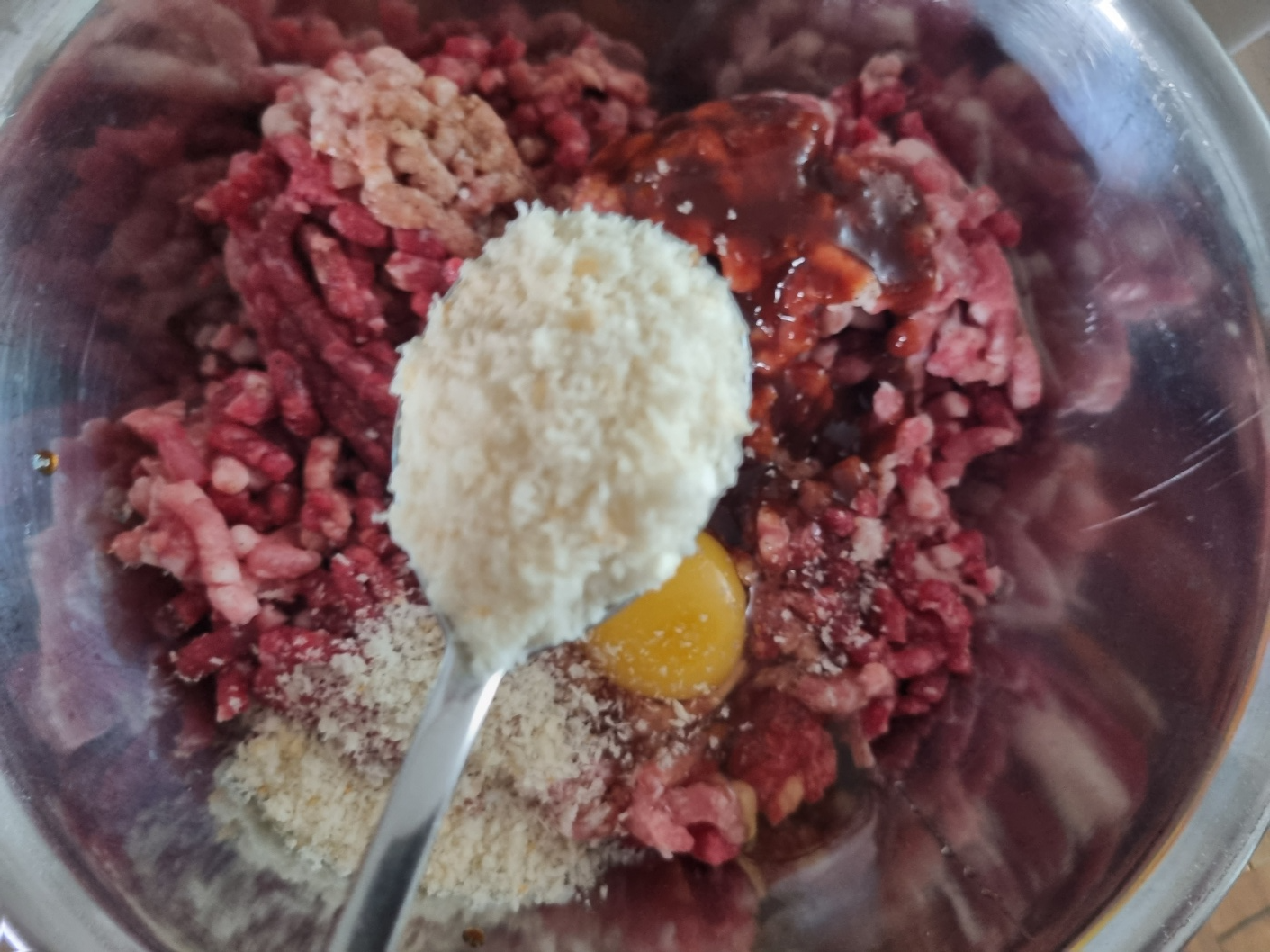 우스타 소스를 종이컵으로 1/4 넣었어요. 그리고 케찹을 넣어야 되는데 케첩보다 스테이크 소스를 넣으면 더 고급진 맛이 날 것 같아요. 그래서 케찹 대신 스테이크 소스 한 숟가락을 넣었어요. 그리고 빵가루를 2숟가락 넣었어요. 빵가루 안 넣으면 함박 스테이크 맛이 나지 않는다고 해요.