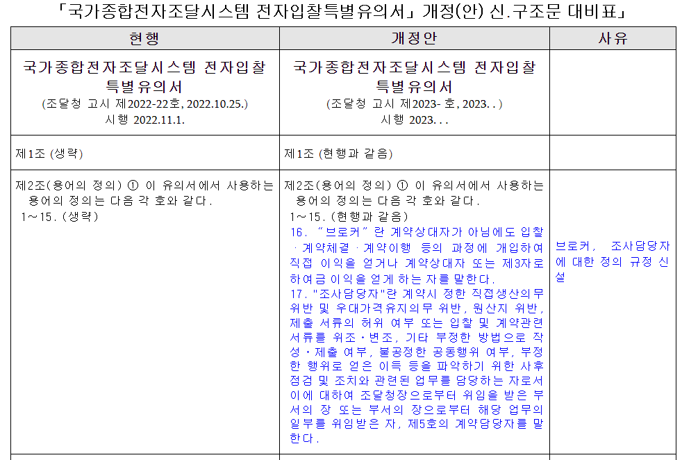 『국가종합전자조달시스템 전자입찰특별유의서』 개정안을 보면 제 2조 용어의 정의에 브로커와 조사담당자에 대한 내용을 신설했어요. '브로커란 계약상대자가 아님에도 입찰, 계약체결, 계약이행 등의 과정에 개입하여 직접 이익을 얻거나 계약상대자 또는 제3자로 하여금 이익을 얻게 하는 자를 말한다.'라고 나와요. 한마디로 직접 이행하지 않으면 처벌한다는 얘기예요.