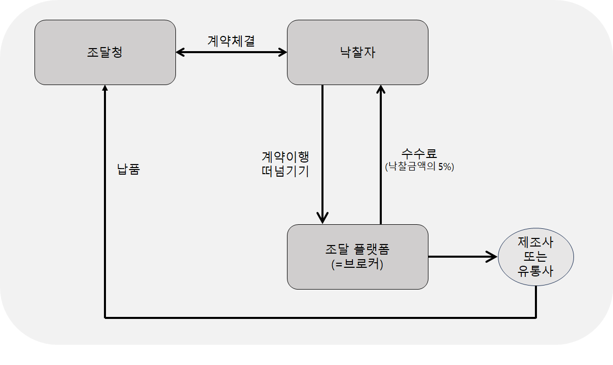 물품 구매 능력이 없는 기업은 조달 플랫폼(=브로커)과 함께 공공입찰에 참여하는 경우가 있어요. 낙찰자는 조달청과 계약체결을 하고 낙찰금액의 5%를 수수료로 챙기고 계약이행은 조달플랫폼에서 시행해요. 이런 경우는 낙찰자가 부당이득을 챙기는 거래요. 부당이득이란 타인의 재무 또는 노무로 이익을 얻는 거니깐 부당이득이라고 할 수 있을 것 같아요.
