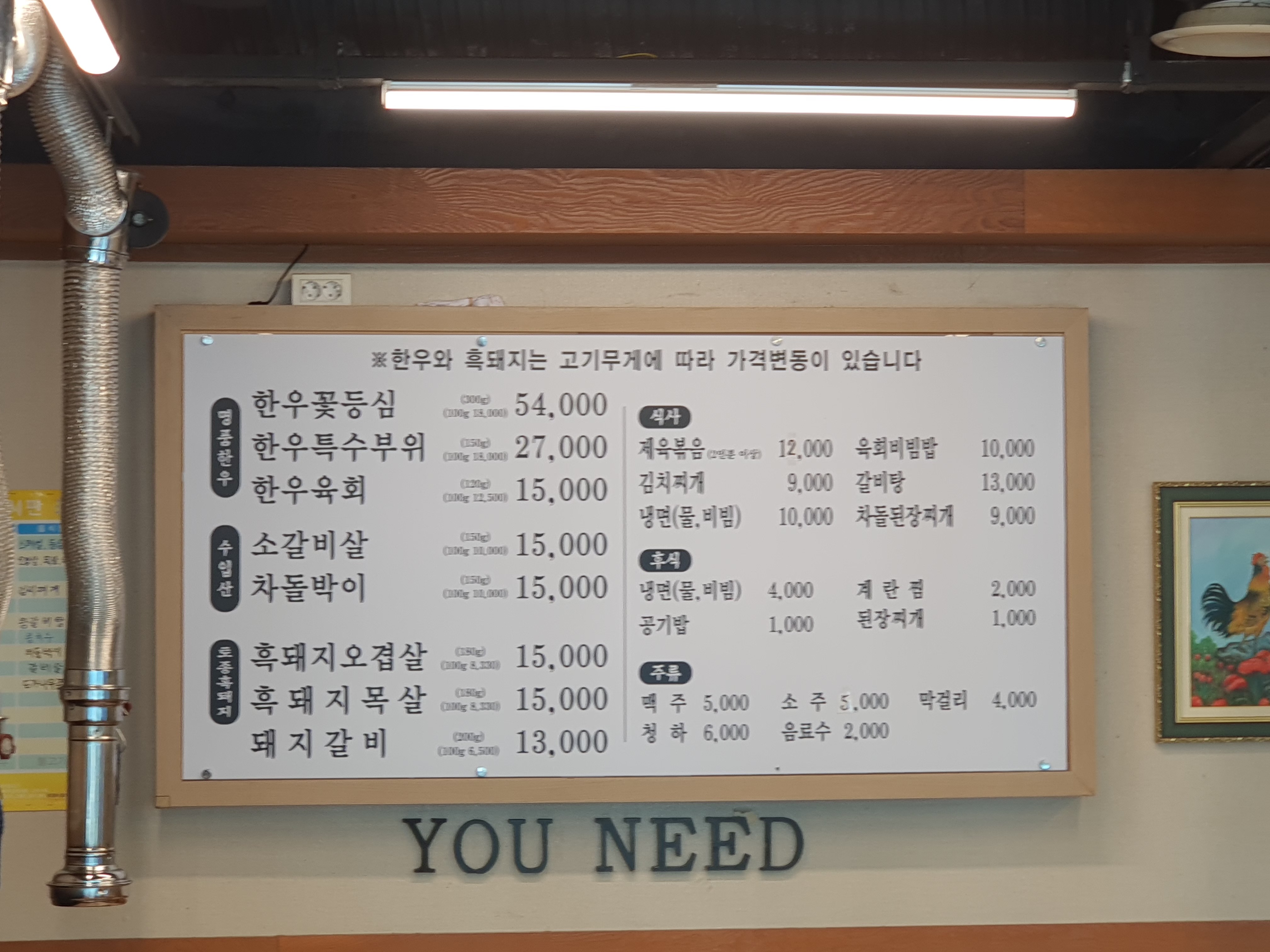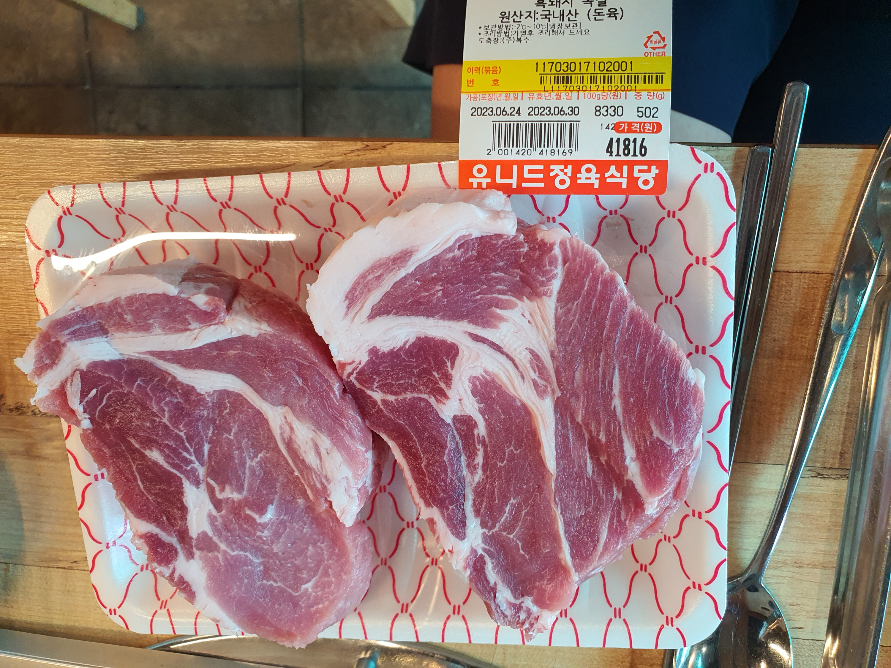 부족한 고기의 양을 목살로 채워요. 정육식당이라 그런지 중량에 맞는 가격이 고기에 붙어 있어요. 물론 목살도 엄청 부드럽고 맛있어요. 목살이 기름이 없어서 퍽퍽하다는 편견이 있으면 버려야 돼요. 고기가 좋기가 정말 좋아요. 이 좋은 고기를 좋은 숯에서 좋은 석쇠로 구웠으니 더 할 나위가 없어요. 완벽해요.