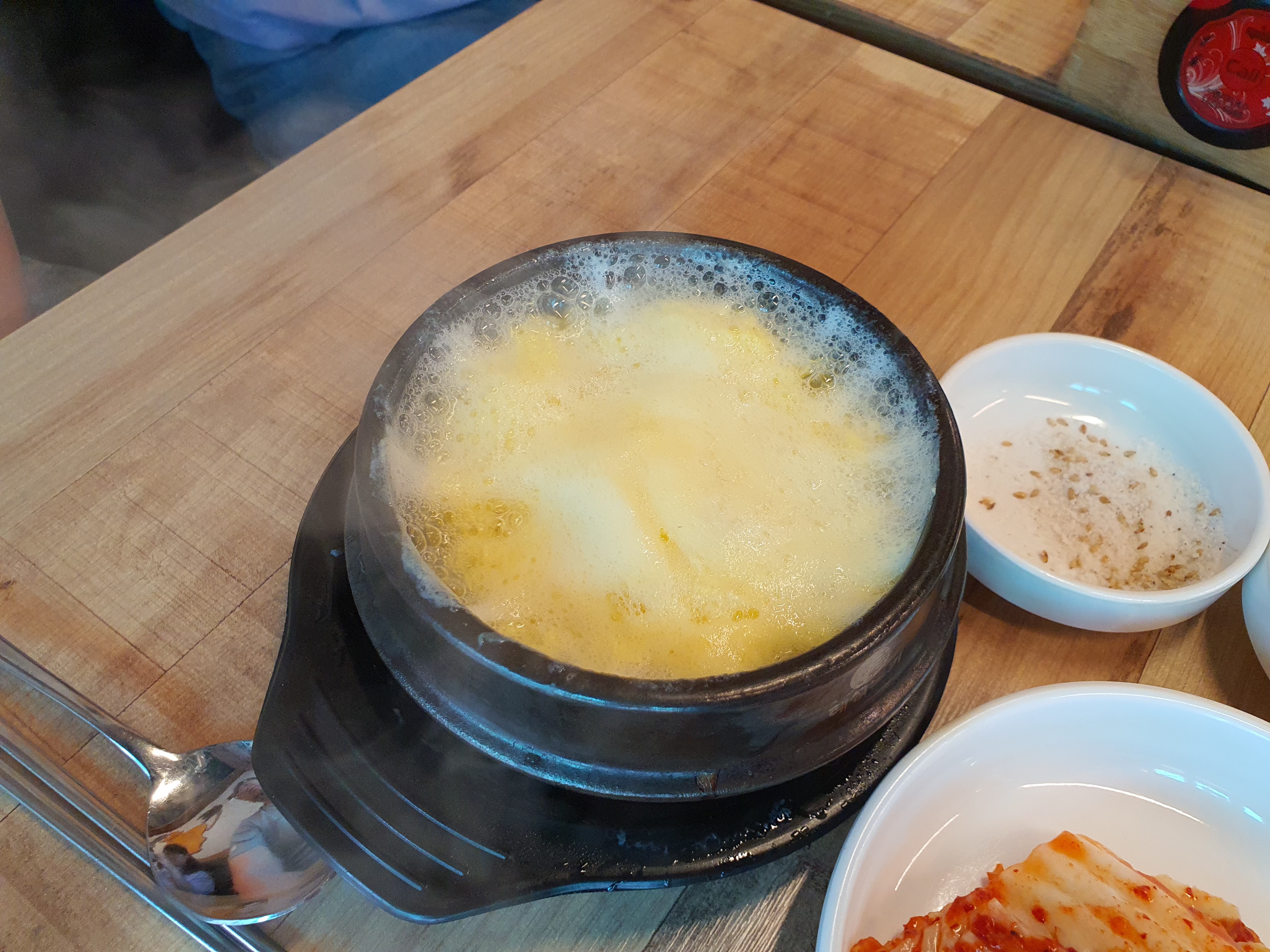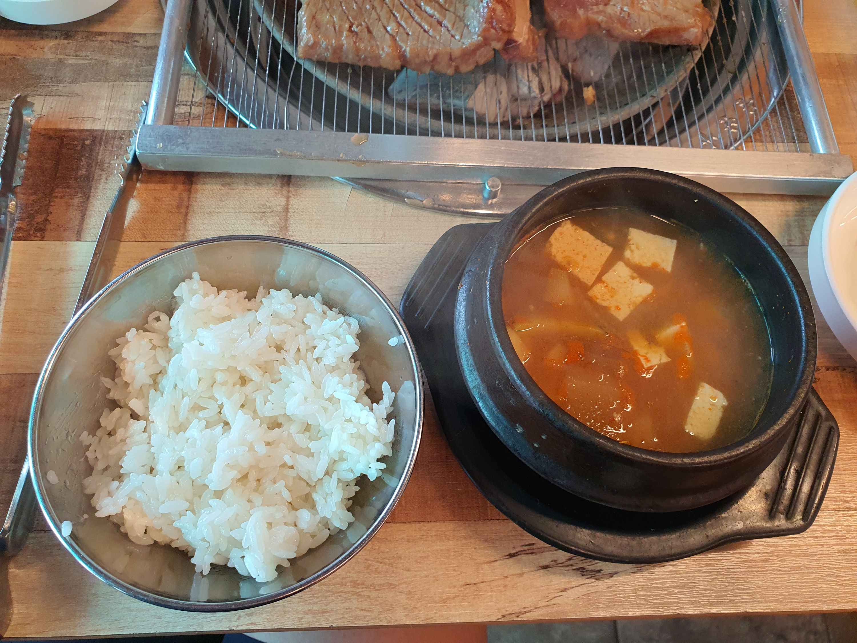 단백질만으로는 하루 영양소가 부족해요. 탄수화물도 먹어야 돼요. 그래야 건강해요. 된장찌개와 밥도 시켰어요. 밥을 생각보다 많이 주셨어요. 된장찌개도 맛있어요. 원래 고깃집에서 아이들은 된장찌개에 들어있는 두부를 좋아하는데 이 날은 아이들도 고기가 5인분 밖에 없다는 사실을 알아서 그런지 고기만 먹었어요. ㅠㅠ