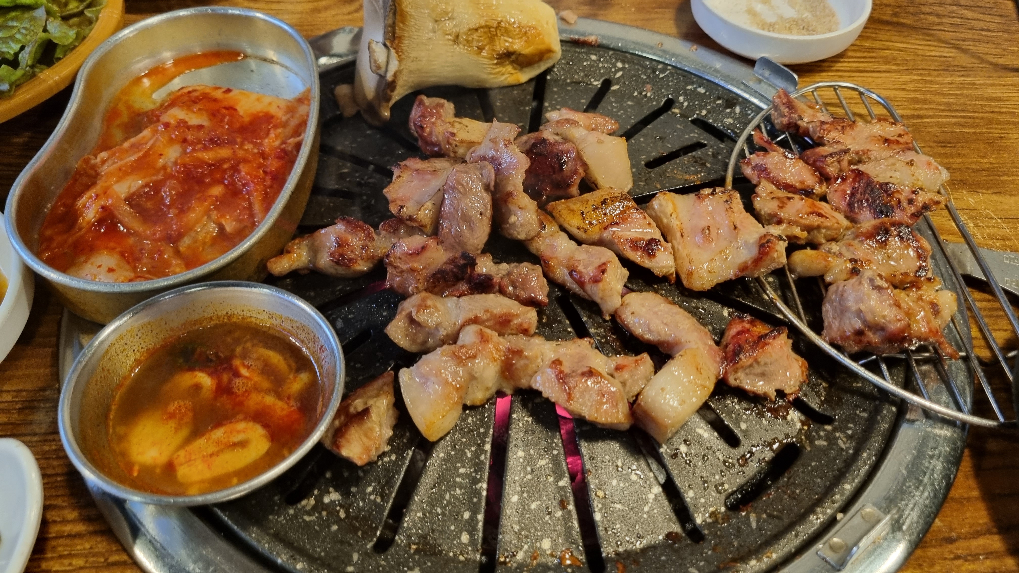 보기만해도 기분이 좋아요. 너무 좋아요. 이 돼지갈비의 맛이 또 생각나요. 숯 위에 올려진 석쇠는 사각형의 얇은줄 석쇠예요. 느꼈어요. 이 집 찐이다!