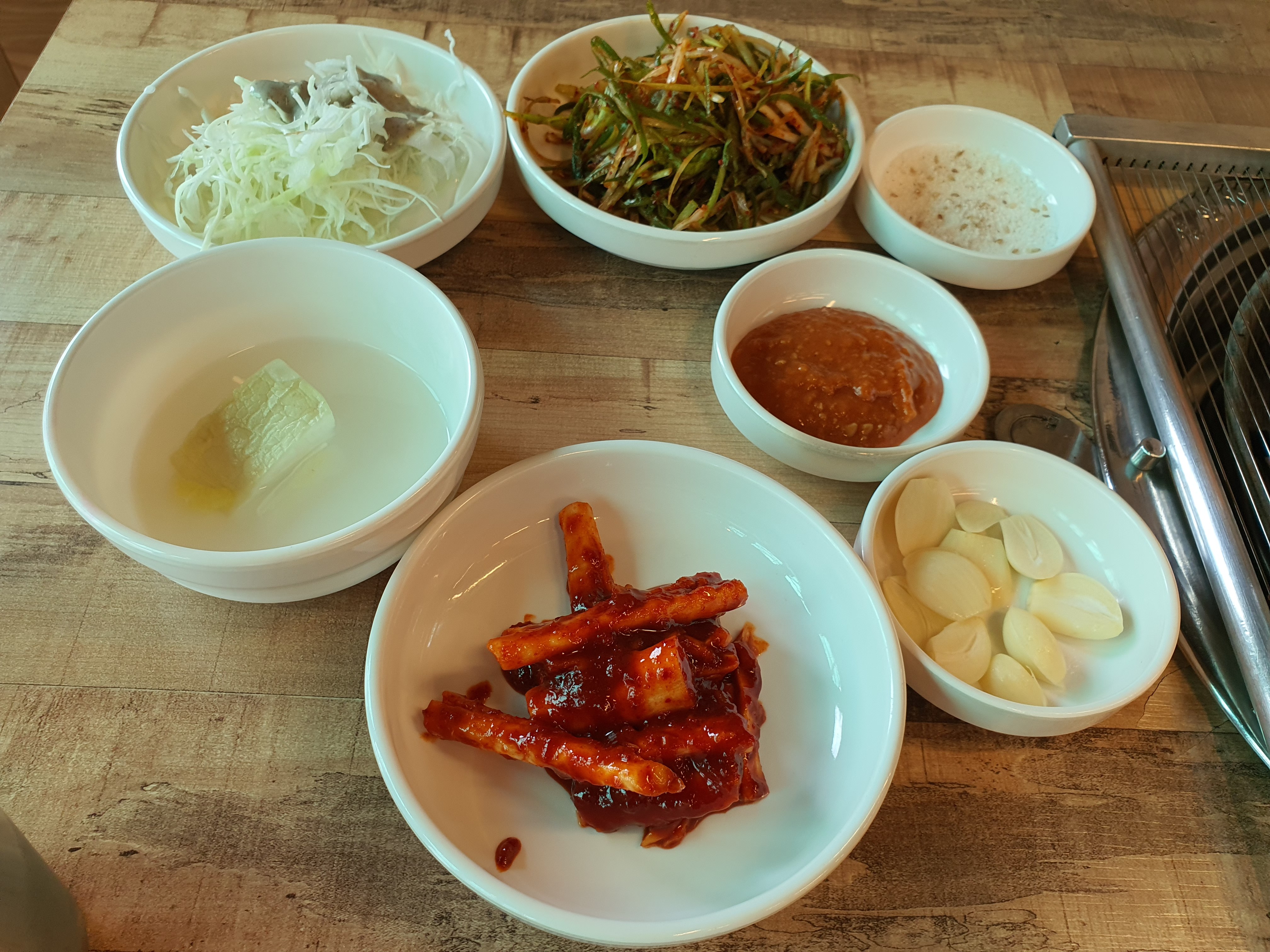 밑반찬을 주셨어요. 고기 먹기 딱 좋은 반찬만 있어요. 이이들이 좋아하는 계란찜도 나와요. 원래 필자의 아이들은 고기보다 계란찜을 좋아해요. 하지만 여기서는 예외예요. 계란찜 안 먹고 돼지갈비 먹어요.