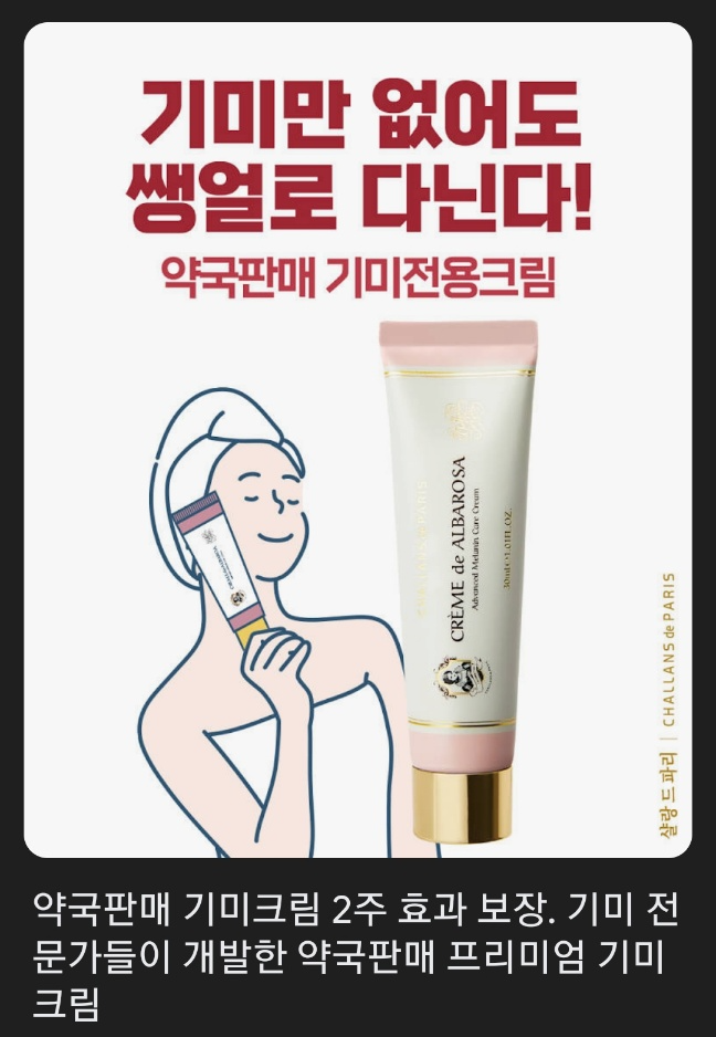 하필이면 고민하던 찰나에 이 제품 광고가 필자의 휴대폰에 보여요. 약국판매 기미크림 2주 효과 보장. 기미 전문가들이 개발한 약국판매 프리미엄 기미 크림이래요. 약국 판매라고 하니깐 왠지 신뢰감이 생겨요.