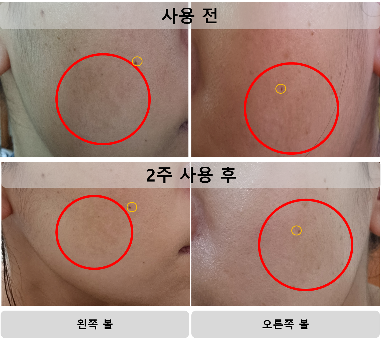 2주가 지났어요. 광고에 현혹되지 마세요. 육안으로 봤을때 정말 효과 1도 없어요. 개인 차이도 있을 것이고 현미경으로 보면 효과가 있을지는 모르겠어요. 사진 찍는 환경에 따라서 약간의 차이가 있을 수 있어요. 하지만 필자는 오히려 사용 전 사진이 어두운 환경에서 찍은 사진이고 2주 사용 후 사진은 형광등 아래서 찍은 사진이에요. 위의 사진에서 노란색 동그라미는 기준점이에요. 최대한 각은 각도에서 찍으려고 노력했어요.
