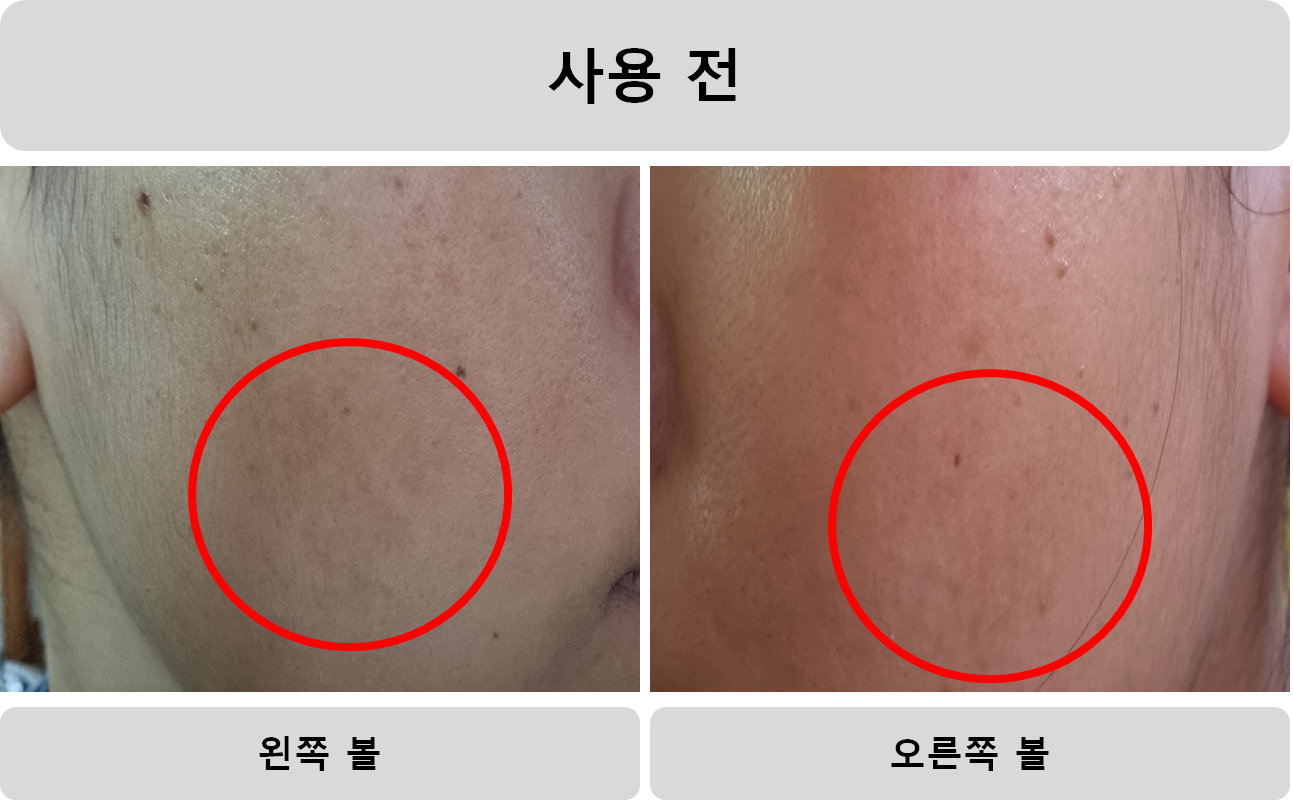 사용 전이에요. 약간 빛의 차이가 있어서 왼쪽과 오른쪽 색이 달라요. 검버섯이나 점처럼 보이는 것들은 기대도 하지 않아요. 그냥 볼에 있는 거무스름한 기미만 없어지면 좋겠다는 기대를 했어요.