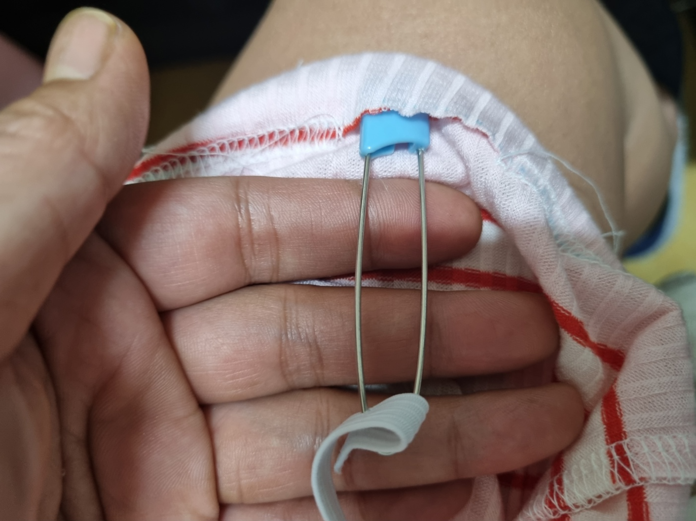 고무줄을 옷핀에 꽂아서 고무줄을 넣어요. 옷핀을 사용하면 생각보다 쉽게 고무줄을 넣을 수 있어요.