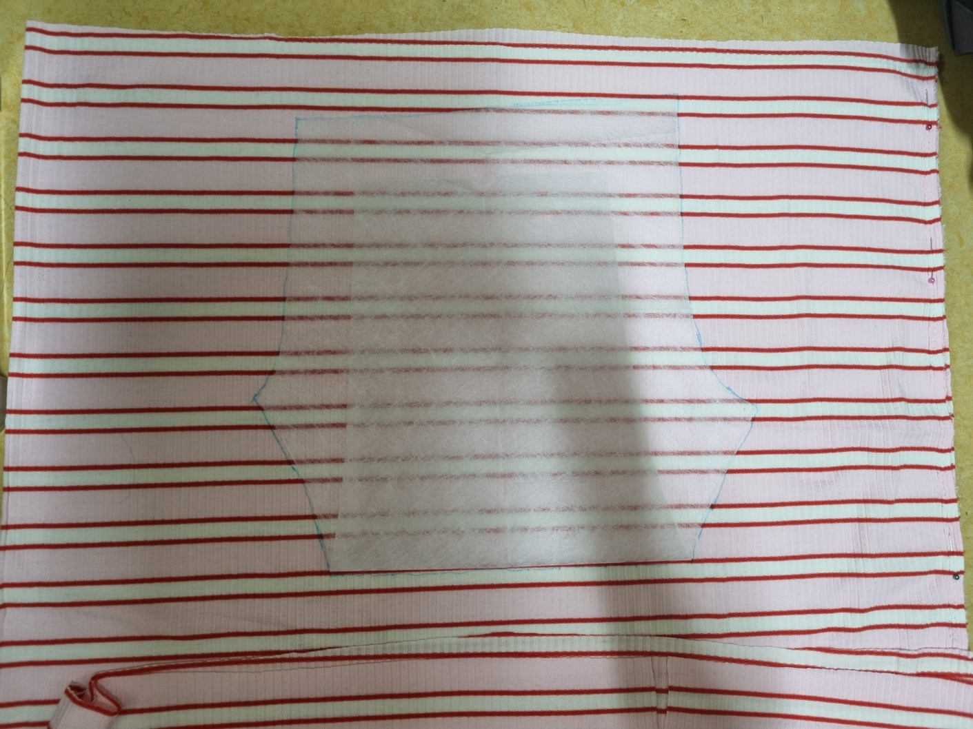 신축성 원단을 준비했어요. 다행히 집에 그려둔 120사이즈의 레깅스 패턴이 있어요. 원단에 패턴 올리고 따라 그려요. 패턴이 긴바지용 레깅스라 패턴을 접어서 사용했어요.