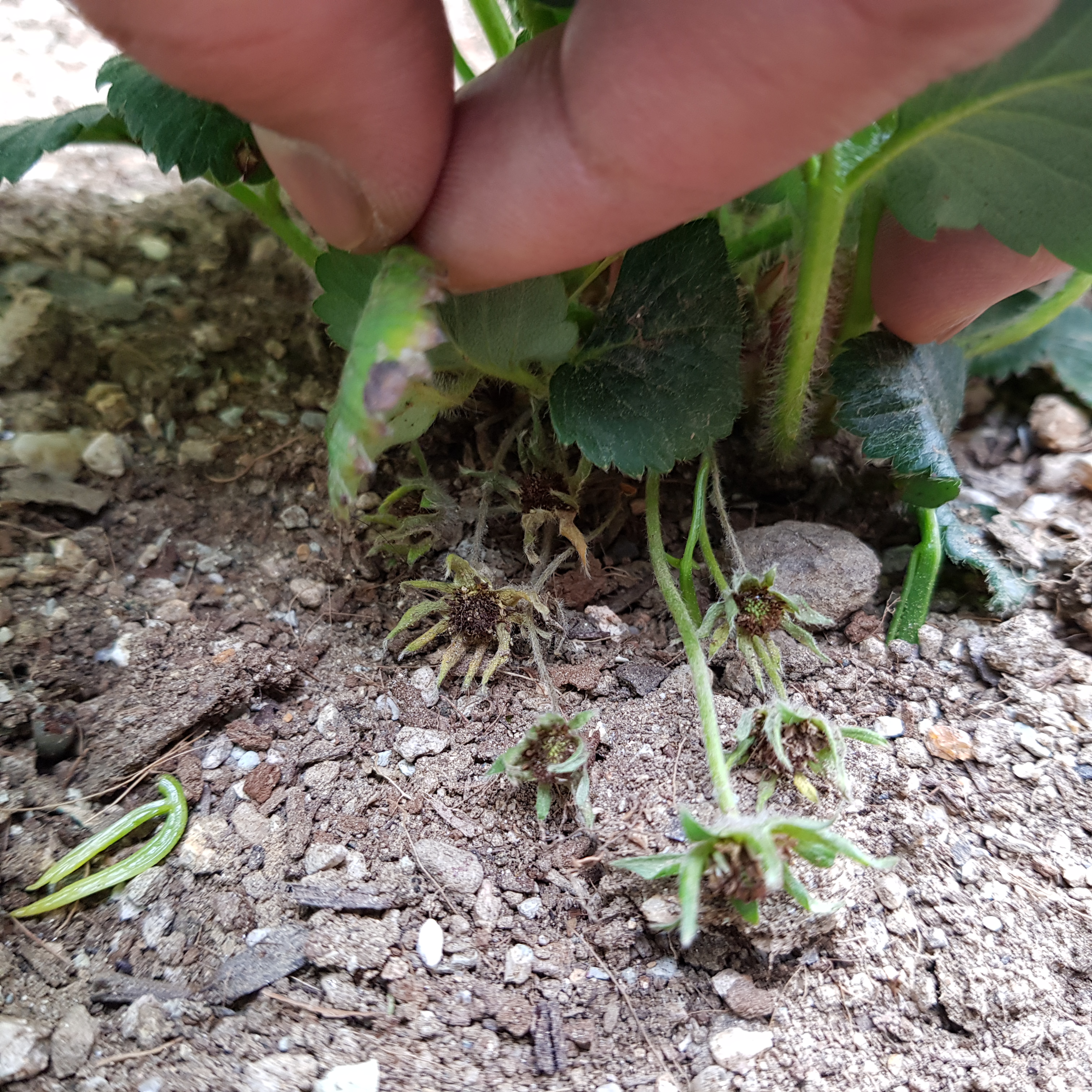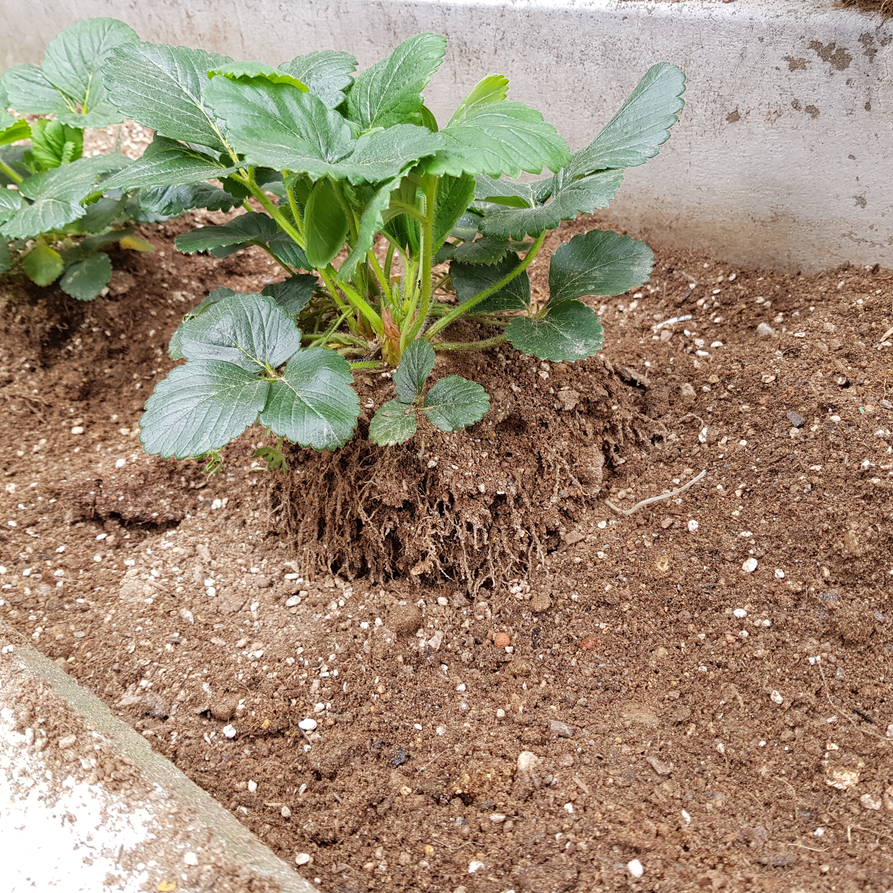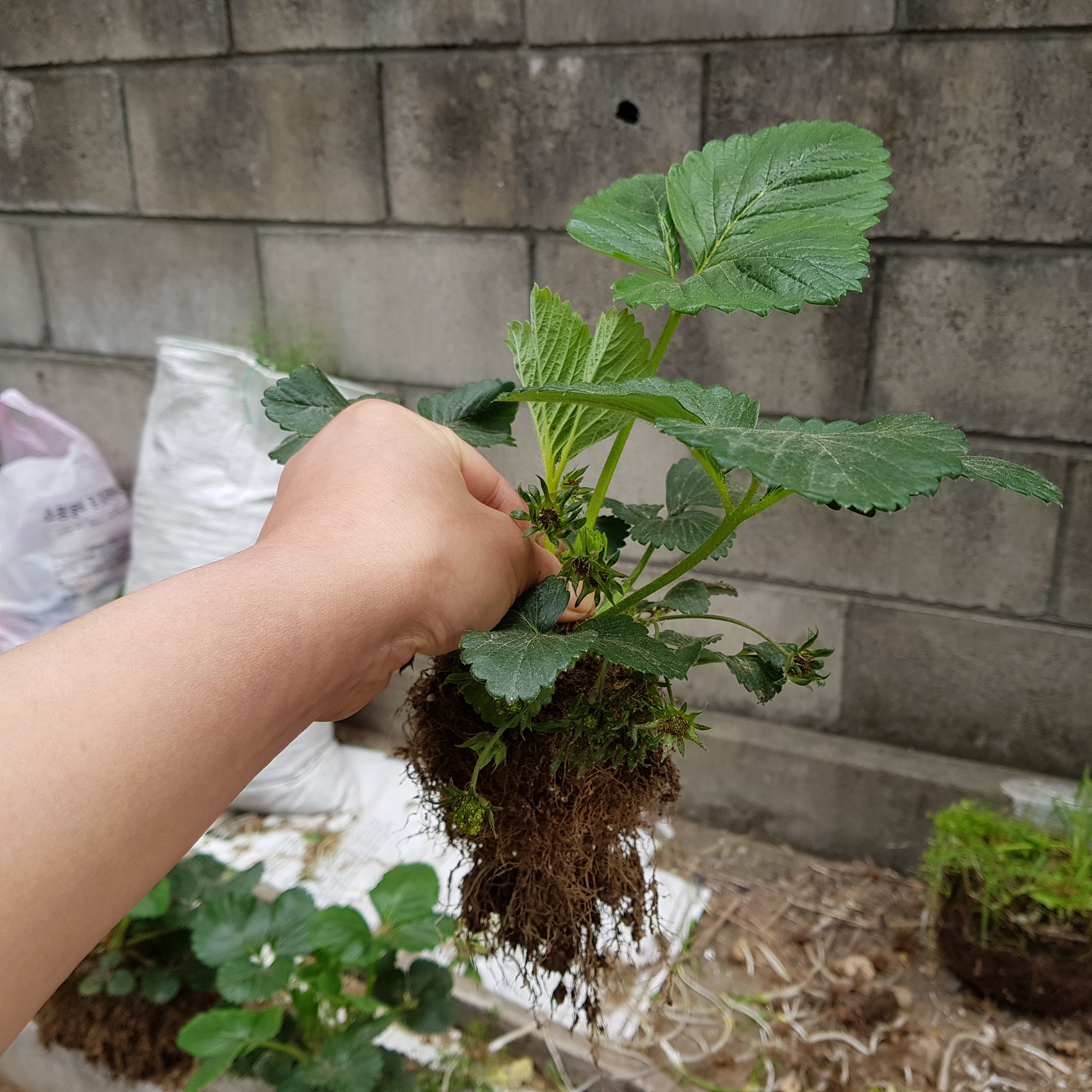 일단 간격이 너무 적은 딸기 모종 7, 8, 9, 10번 딸기를 뽑기로 결정했다. 뿌리가 상하지 않게 뽑을 수는 없지만 최대한 다치지 않게 모종삽으로 푹 떠서 살살 당겼다.