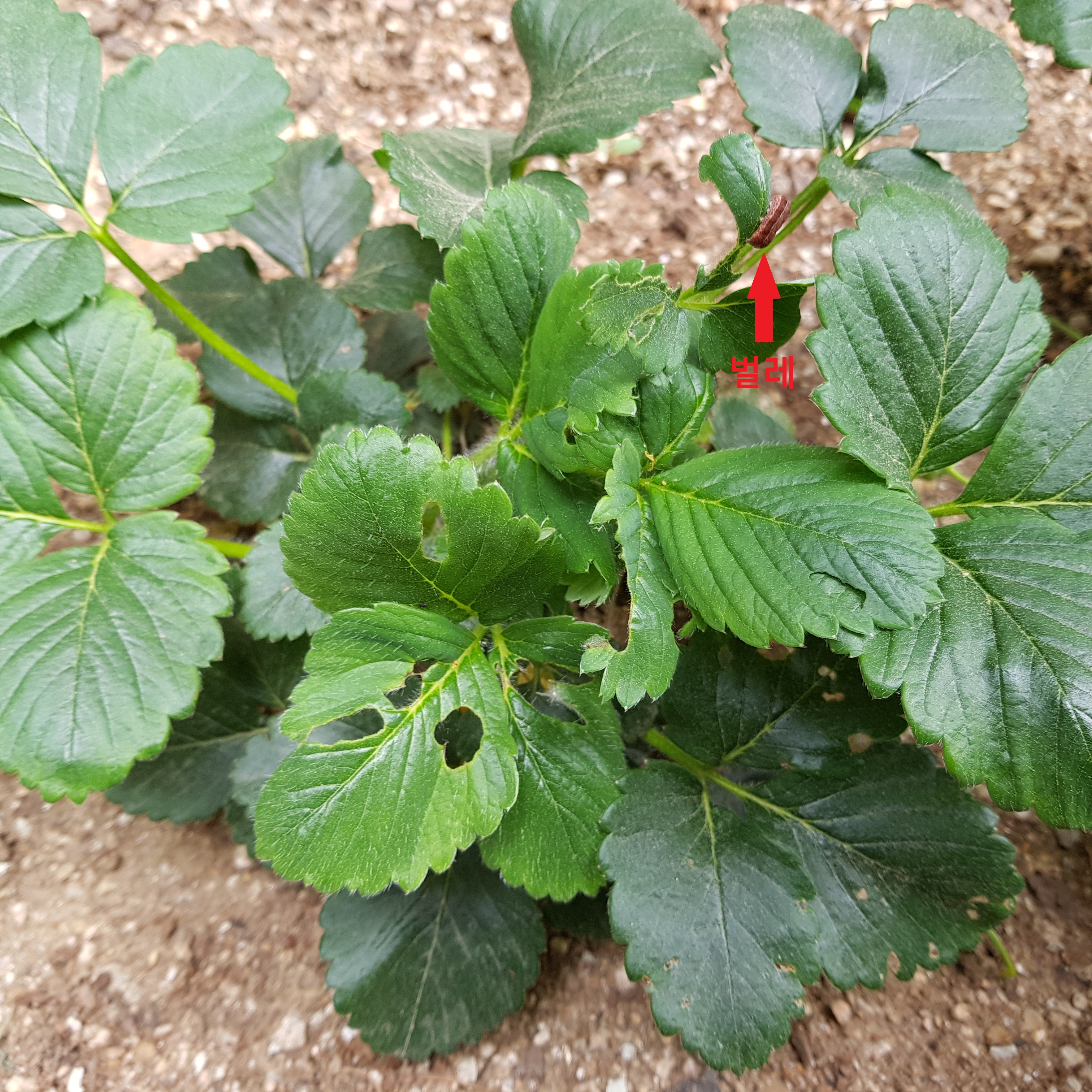 4번 딸기를 보는 순간 기절할뻔했다. 잎에 왜 이렇게 구멍이 많이 생겼을까 자세히 들여다보는데 벌레가 꿈틀거리고 있었다. 저 벌레가 뭔지는 자세히 모르겠지만 저것이 딸기 잎을 먹으면서 구멍을 송송 만들어 놓는 거 같다. 정말 건들기도 싫었지만 어쩔 수 없이 제거했다.
