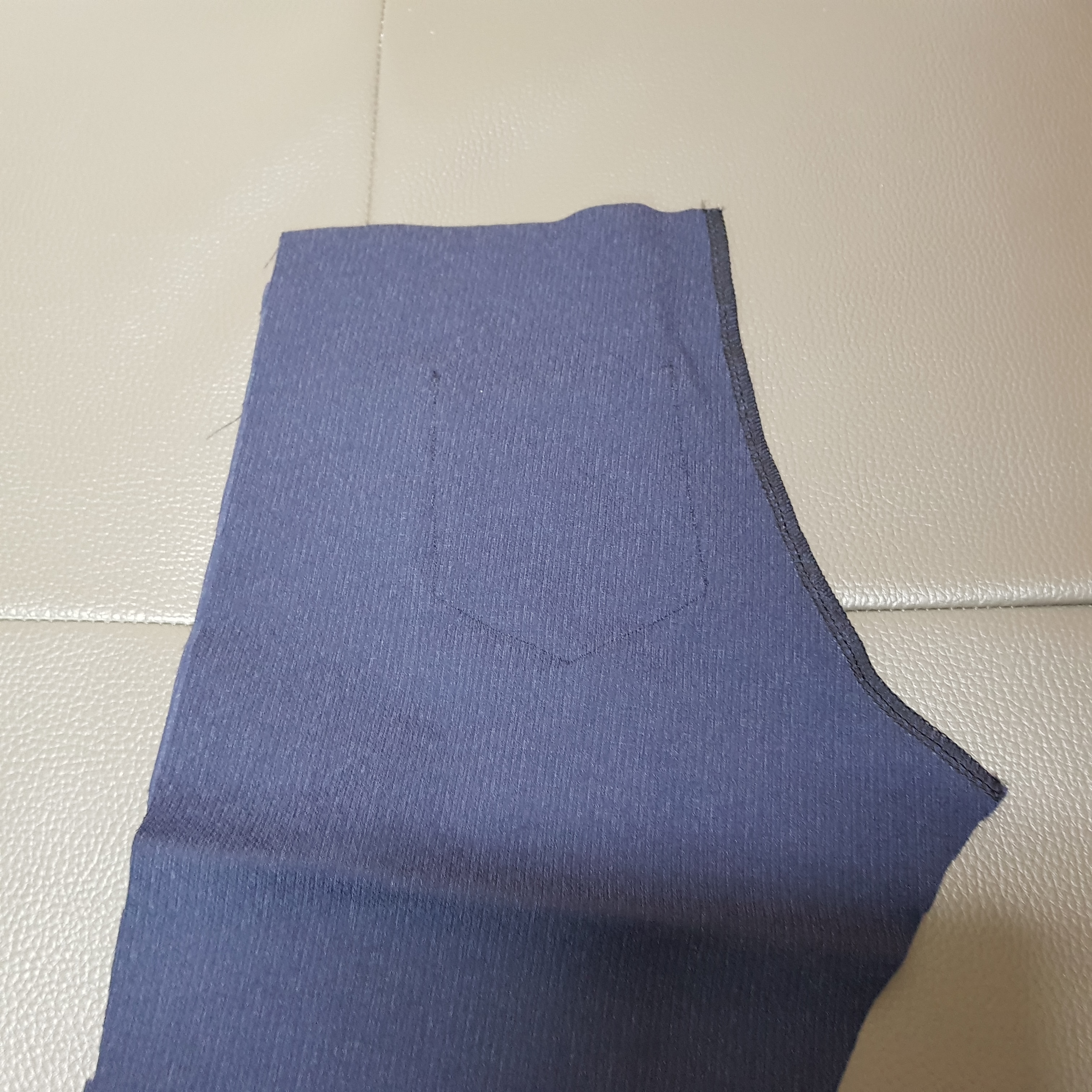 앞 팬츠의 뒤쪽에서 주머니 안감을 대고 테두리를 재봉한다. 원래 옆선 쪽 주머니에도 재봉해야 되지만 옆선 재봉할 때 주머니도 같이 재봉하면 되니깐 굳이 하지 않았다. 아래 사진은 앞팬츠의 안쪽이 보이는 것이다.