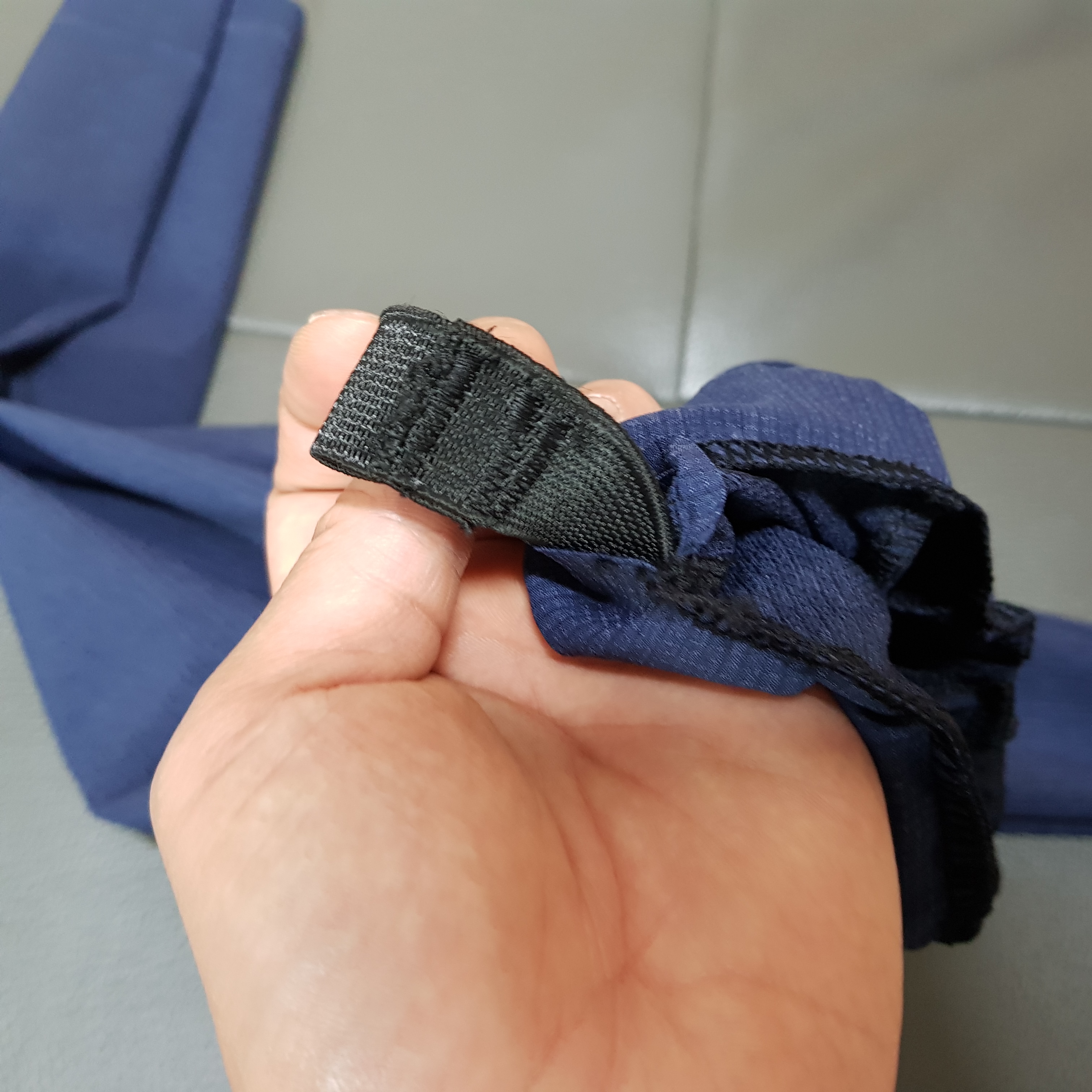 허리 벨트 감을 달 때 고무줄 구멍을 남기고, 고무줄을 넣은 뒤, 고무줄을 이어주고 팬츠의 고무줄 구멍을 재봉한다.