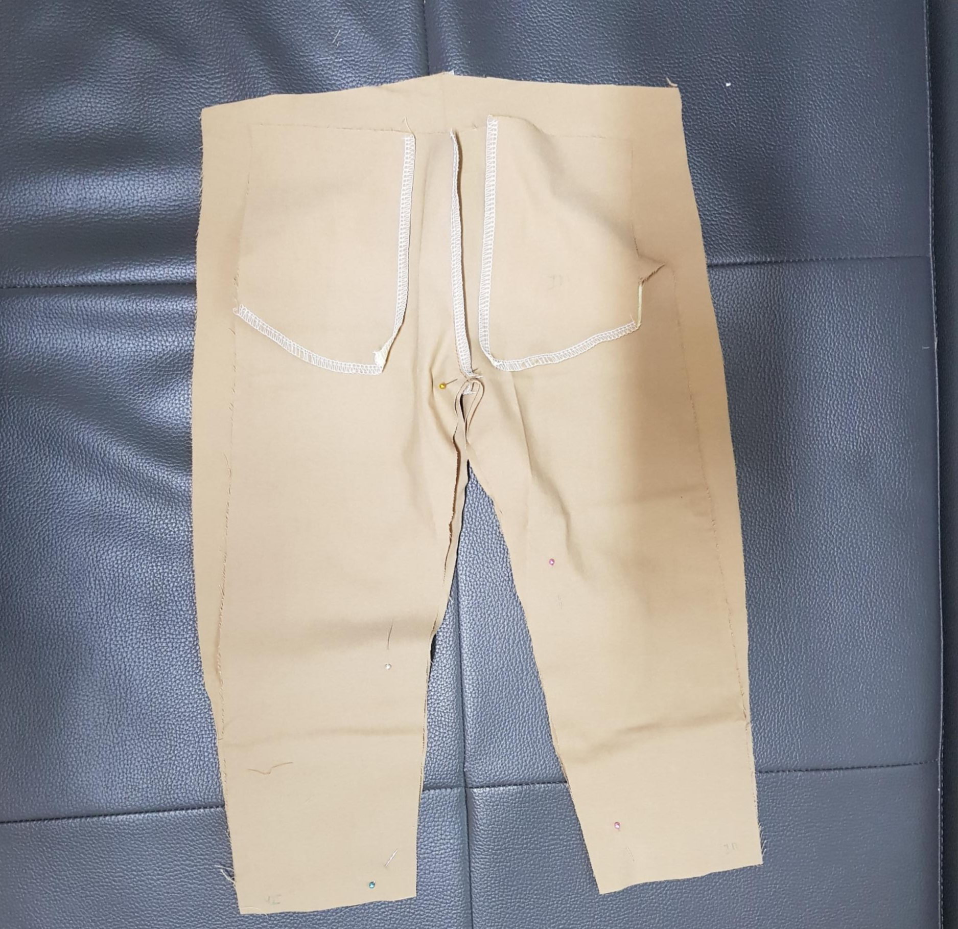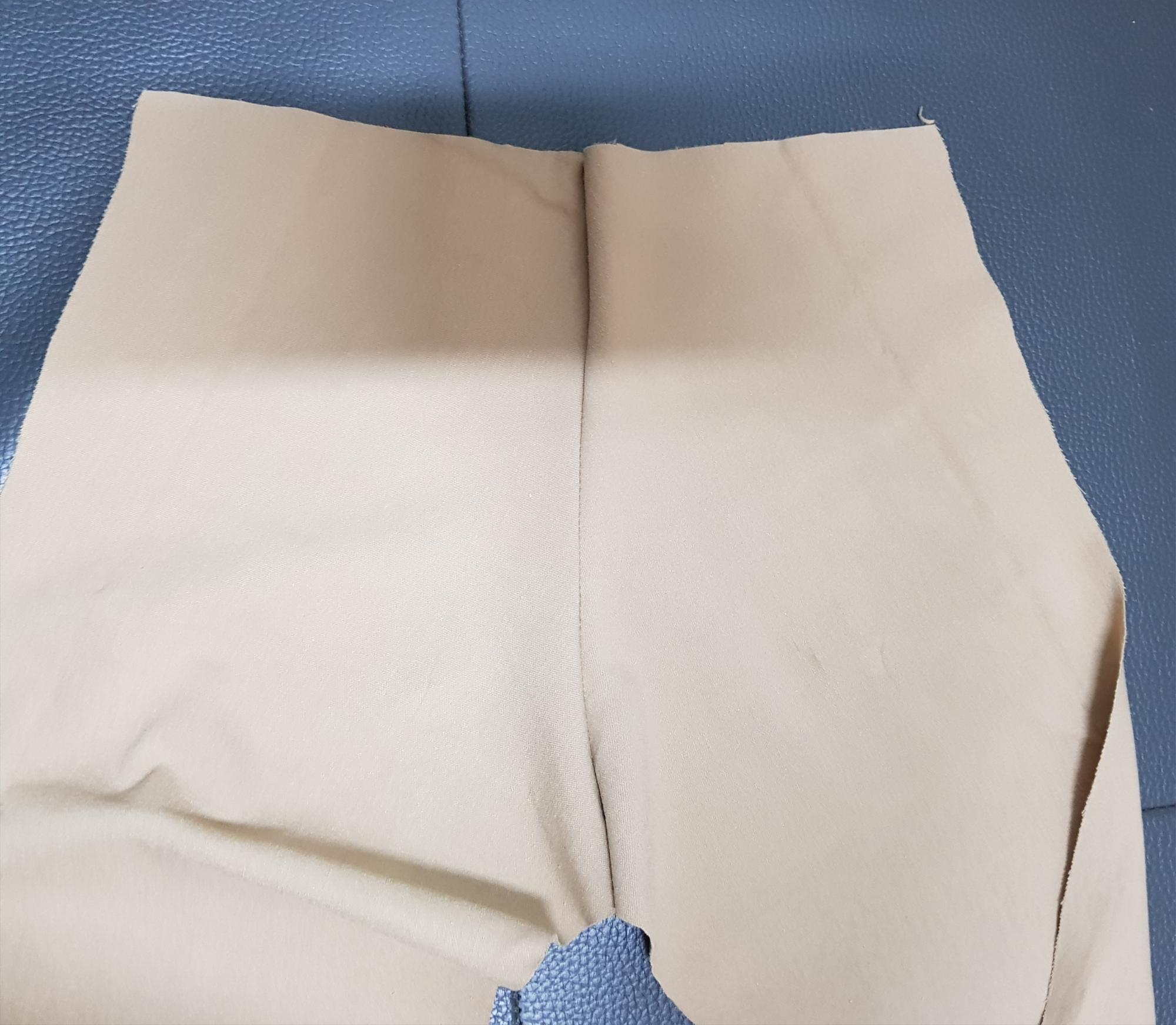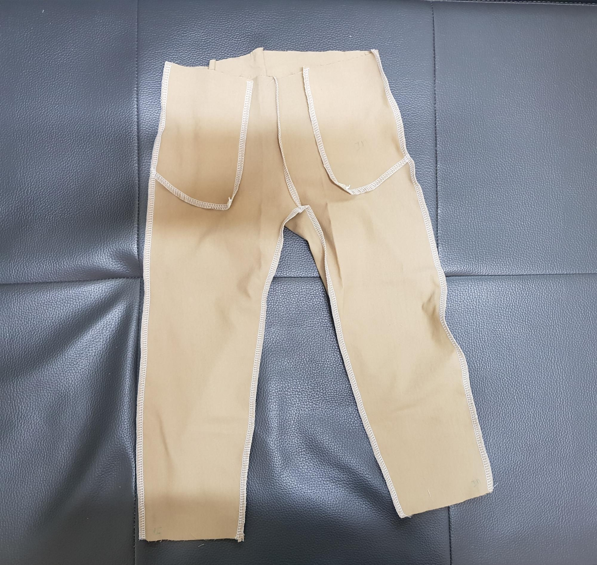 아래 사진과 같이 바지 뒤판을 겉끼리 맞대어 밑위를 재봉한다. 밑위를 재봉하기 전에 뒷주머니를 달면 좋지만 원단도 모자라고 뒷주머니 만드는 시간이 오래 걸려서 생략했다.