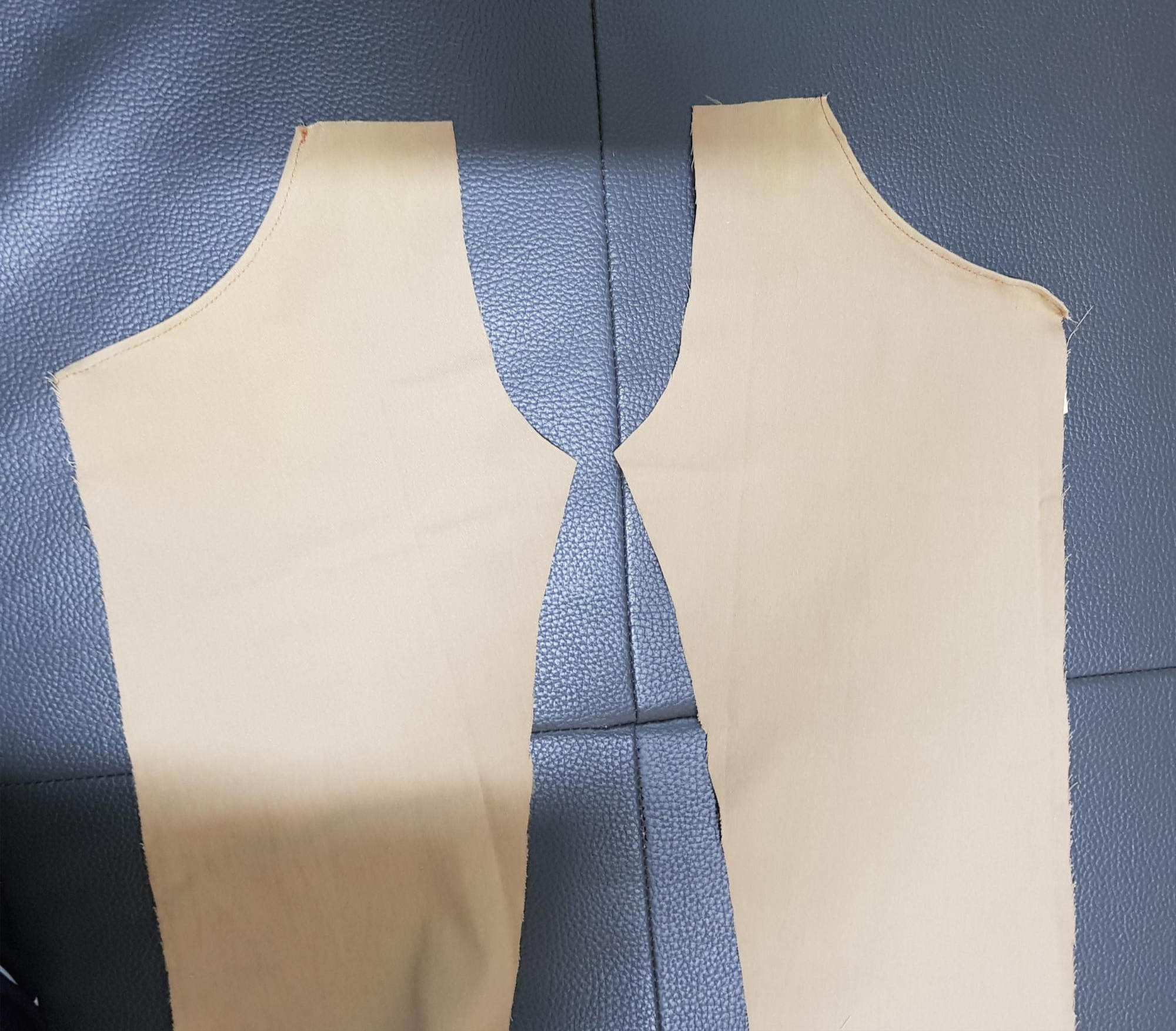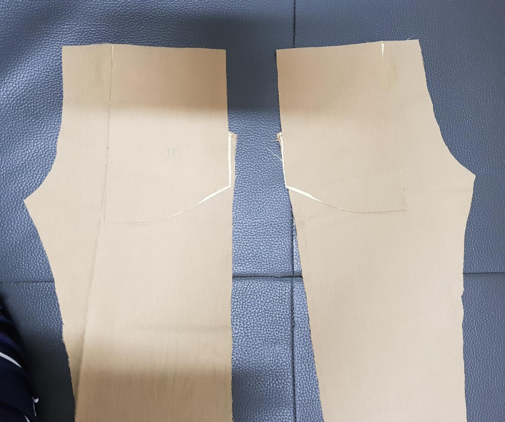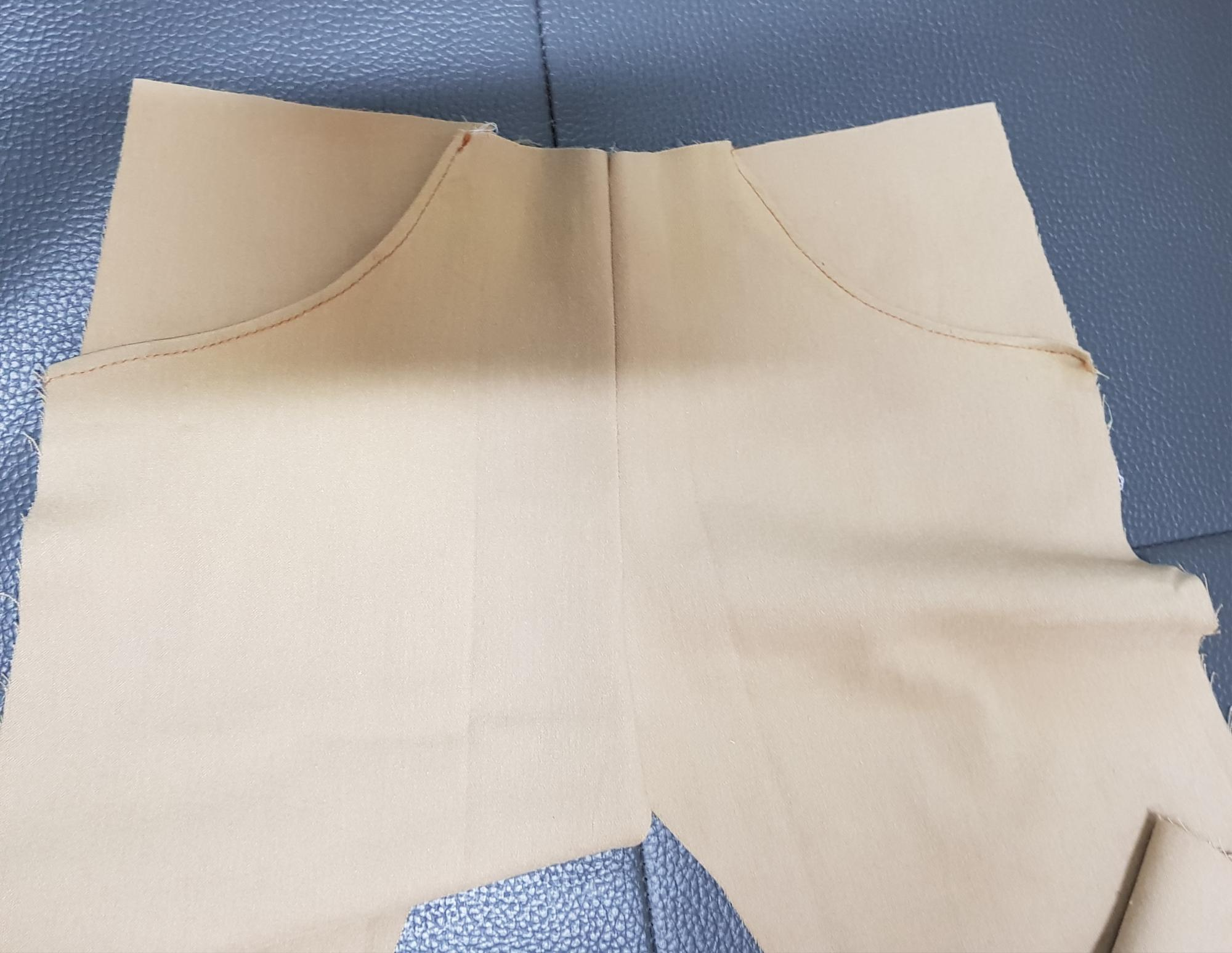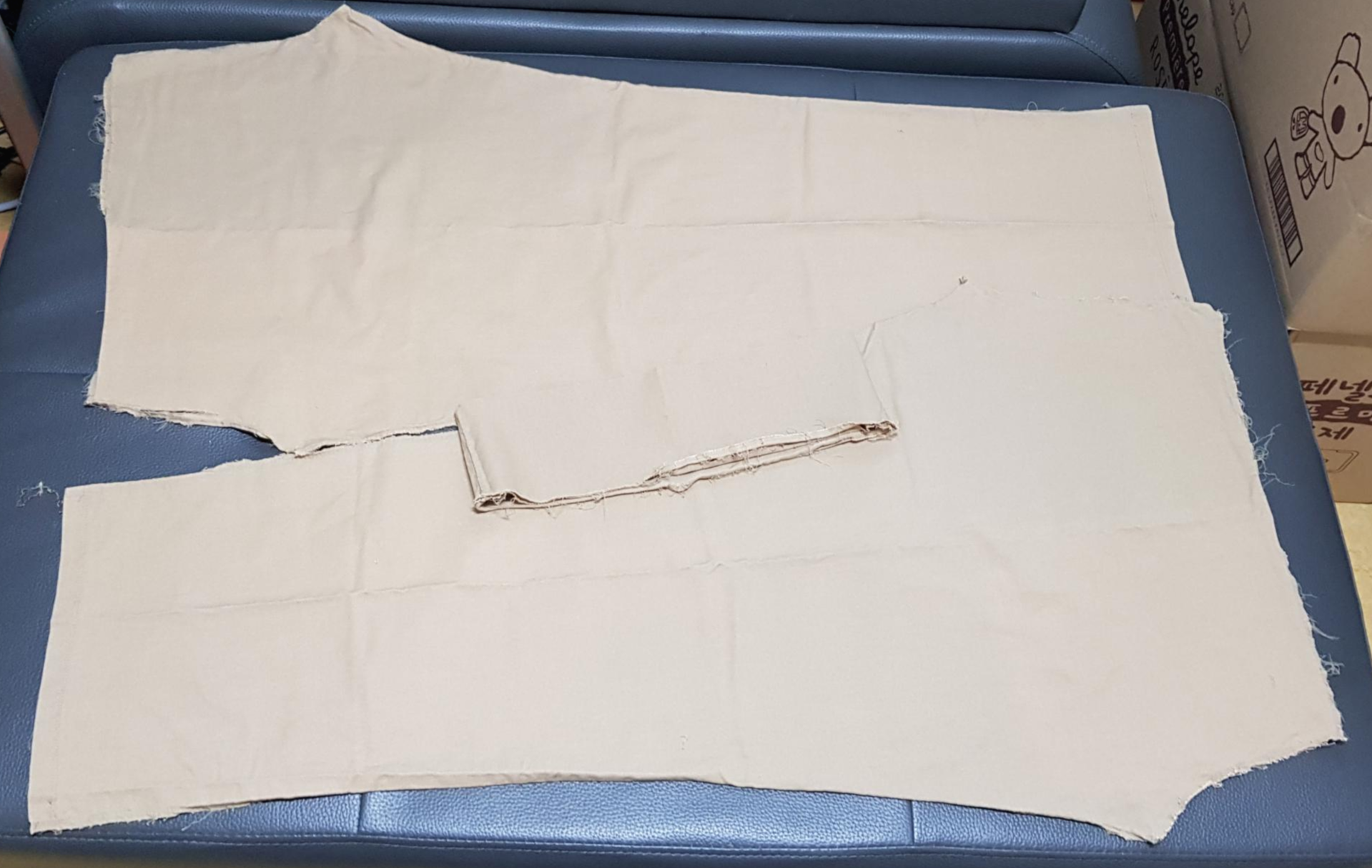 아래 사진과 같이 바지 뒤판을 겉끼리 맞대어 밑위를 재봉한다. 밑위를 재봉하기 전에 뒷주머니를 달면 좋지만 원단도 모자라고 뒷주머니 만드는 시간이 오래 걸려서 생략했다.