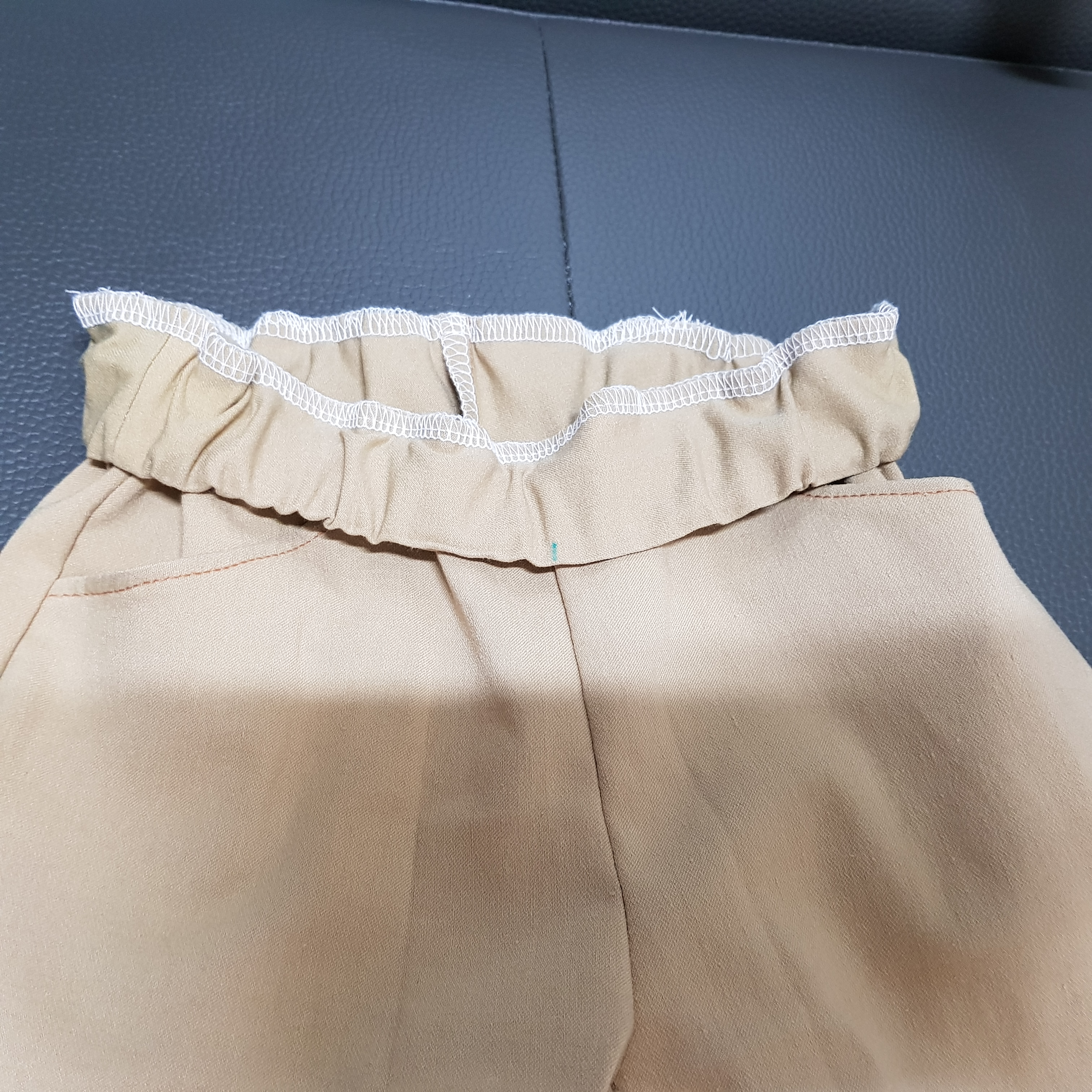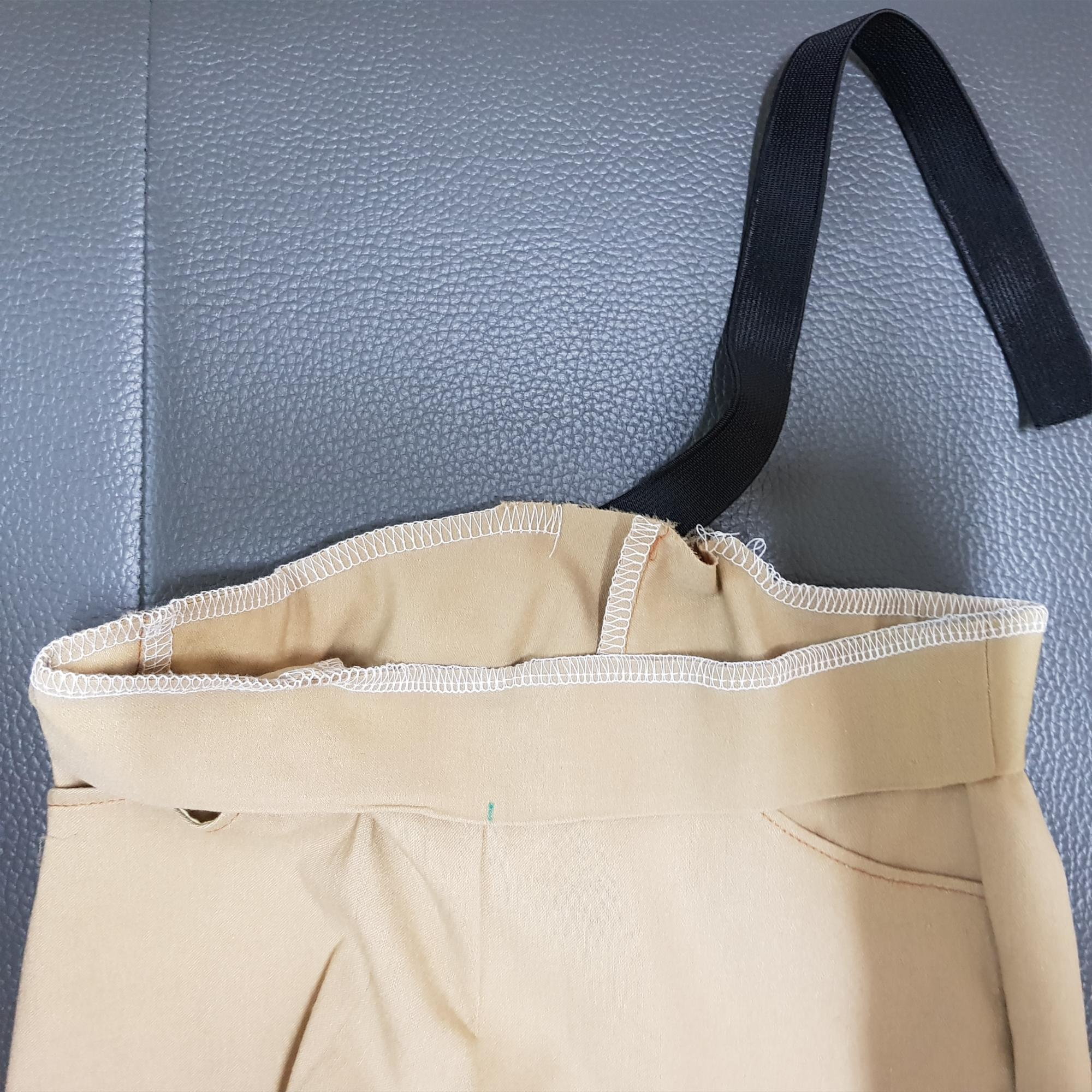 바지와 허리 벨트 감에 고무줄 넣을 구멍을 남기고 재봉하고 고무줄 구멍에 납작 고무줄을 넣어준다.