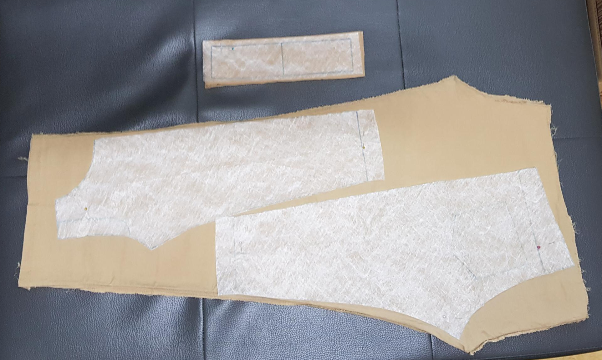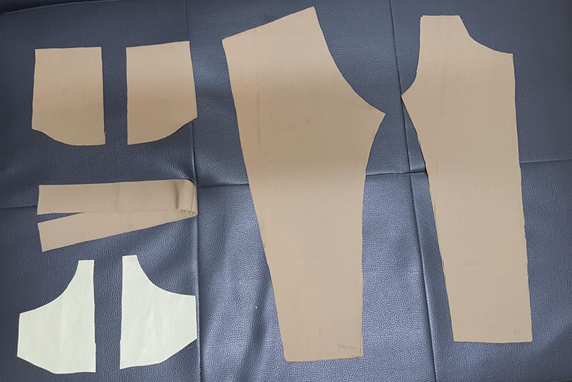 아래 사진은 패턴을 따라서 재단한 사진이다. 주머니 안감은 남은 원단으로 만들 수 있었지만 안주머니는 원단이 모자라서 어쩔 수 없이 다른 원단을 사용하였다. 주머니 안감 2장, 허리 벨트 1장, 안주머니 2장, 바지 뒤판 2장, 바지 앞판 2장이다.