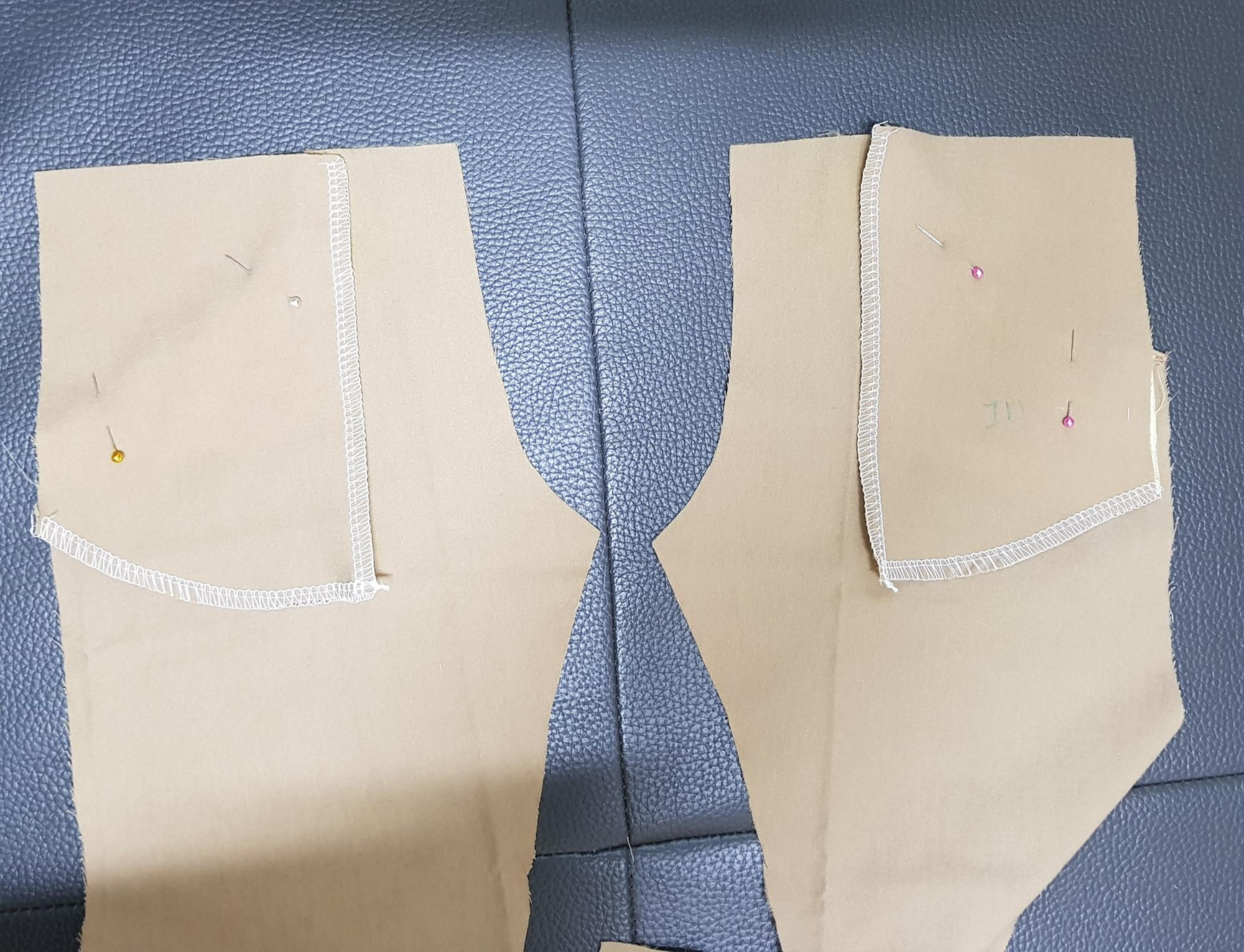 아래 사진과 같이 옆선을 재봉했다. 재봉하기 전에는 바지 앞판과 바지 뒤판의 길이가 안 맞을 거 같지만 시침핀으로 고정해 보면 길이가 잘 맞는다.