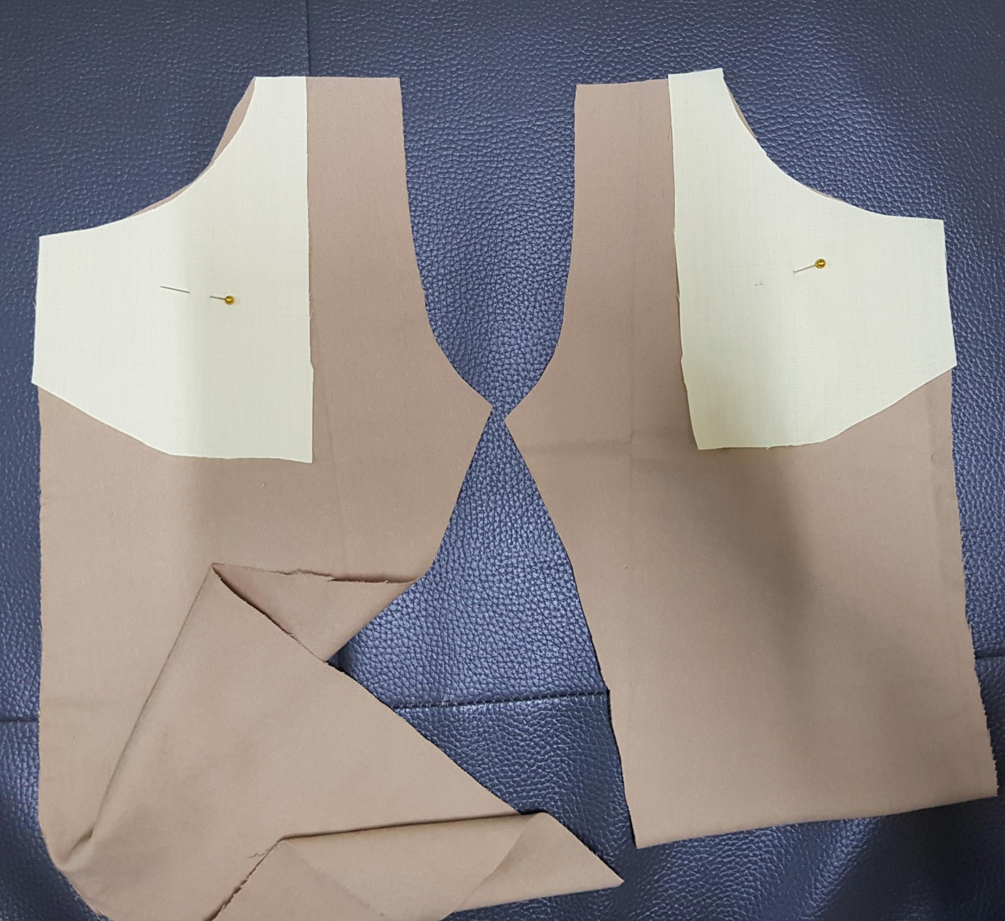 아래 사진은 주머니를 달기 위해 안주머니를 바지 앞판의 겉에 시침핀으로 고정하였다.