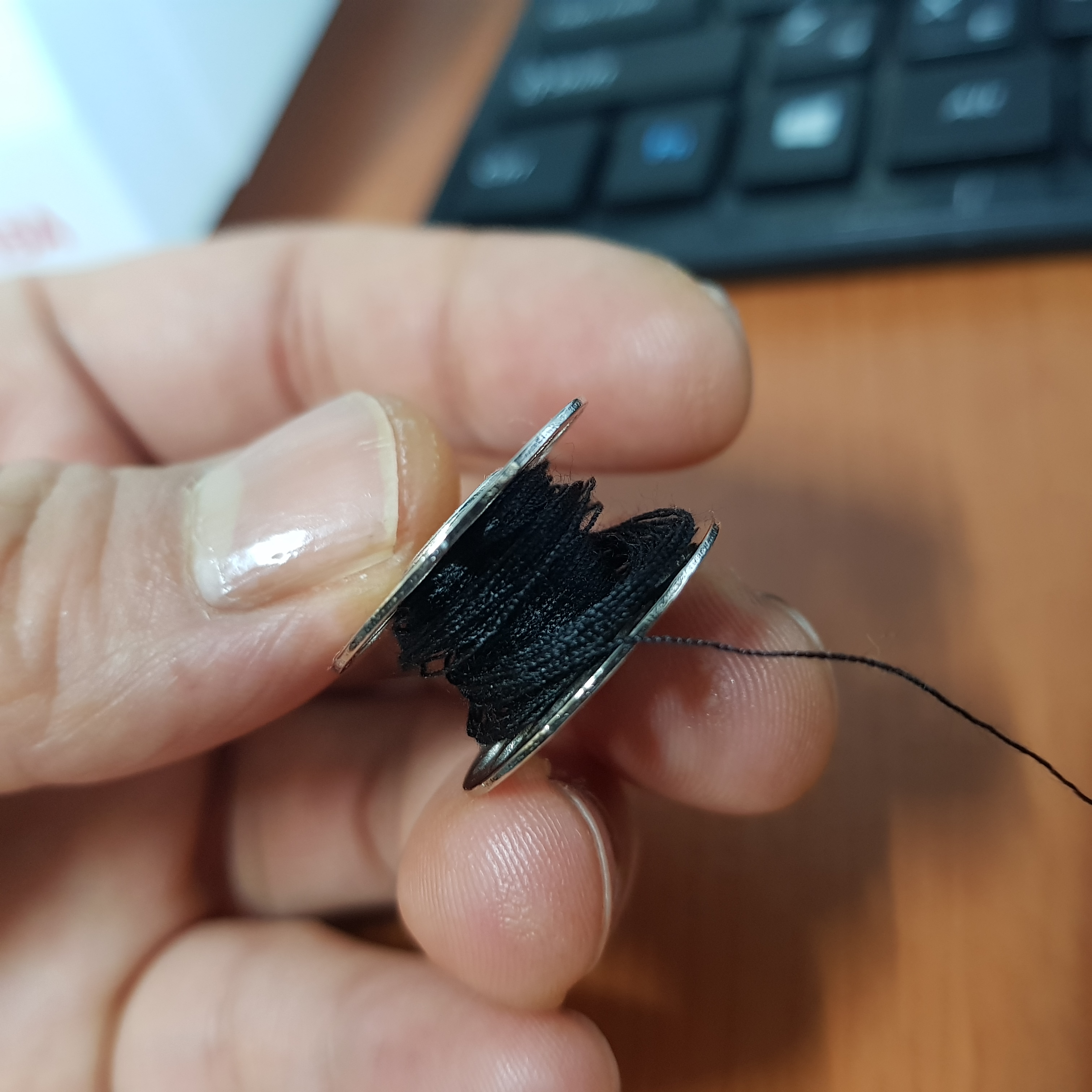 이건 정말 미친다. 혼스 미니 재봉틀의 실패 꽂이는 미싱실을 끼우기엔 너무 작다. 그래서 따로 실패 꽂이를 구매하던가 스스로 만들어 써야 한다. 실패 꽂이를 잘못 만들면 실이 풀리는 과정에서 잘 안 풀리던가 한 번에 왕창 풀리면서 실이 끊어지기도 하고 엉키기도 한다. 실이 너무 자주 끊어져서 투덜대던 중 신랑이 재봉틀 하는 과정을 쭉 지켜보면서 언제 실이 끊어지는지, 언제 실이 확 풀리는지, 언제 안 풀리는지 확인하고 수차례 실패 꽂이 만들기를 반복했다. 신랑이 만들어준 실패 꽂이를 사용한 이후로 실이 끊어지는 횟수가 훨씬 줄어들었다. 아래의 사진에서 두 번째 실패 꽂이를 아직도 유용하게 사용 중이다.