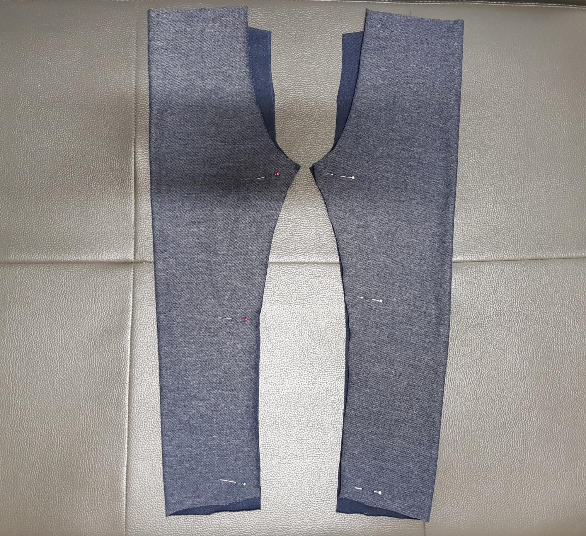 아래 사진은 원단을 겉끼리 맞대고 밑 위를 재봉하기 위해 시침핀으로 고정한 사진이다.