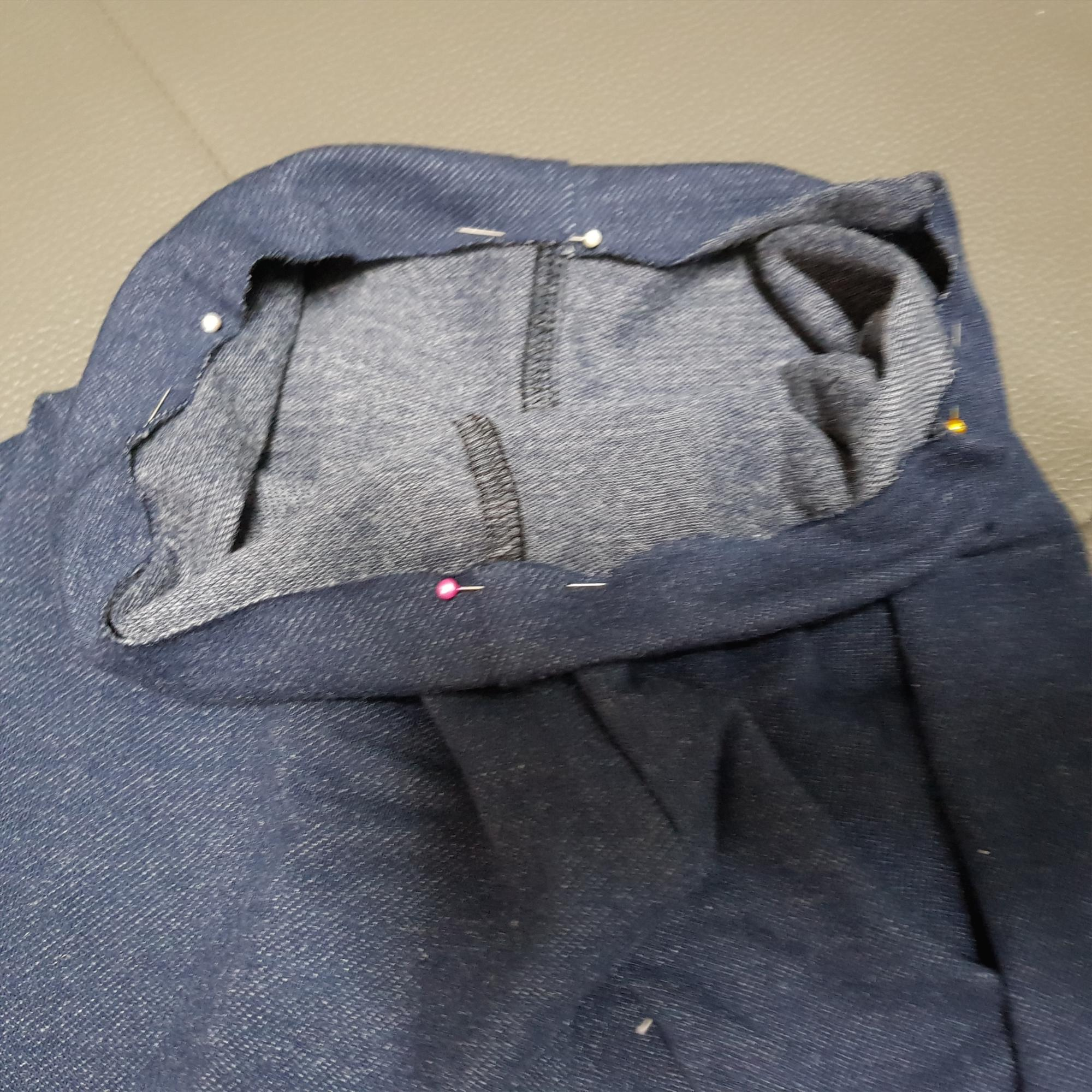 아래 사진은 허리를 재봉하기 전에 시침핀으로 고정한 사진이다. 허리 벨트를 만들지 않고 원단만 접어서 만드니깐 편하고 좋다.