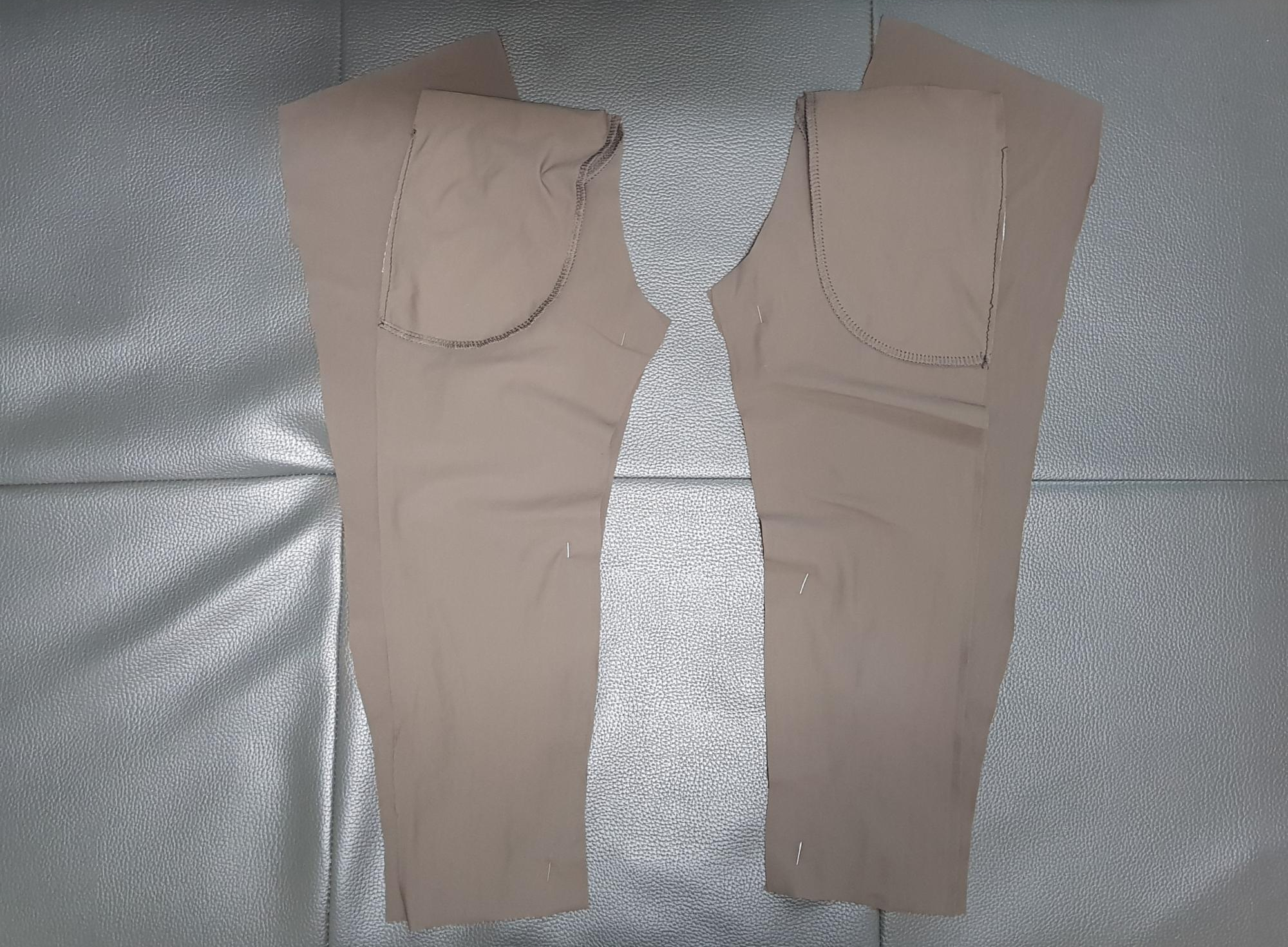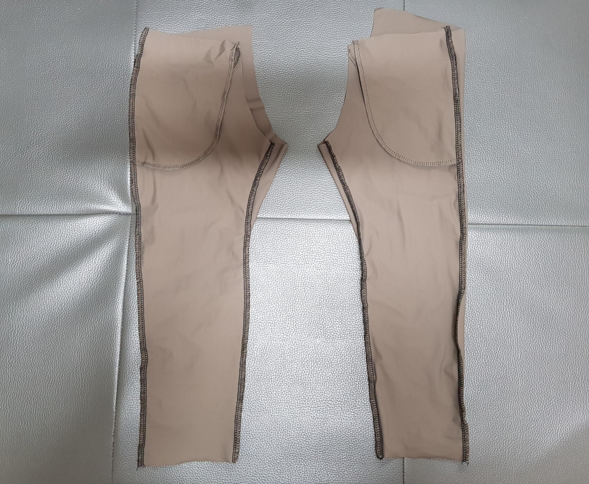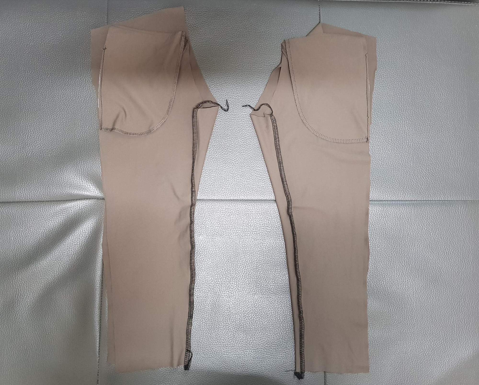 만들어진 오른쪽 다리와 왼쪽 다리를 겉끼리 맞대어 뒤집는다. 그리고 밑 위를 재봉한다.