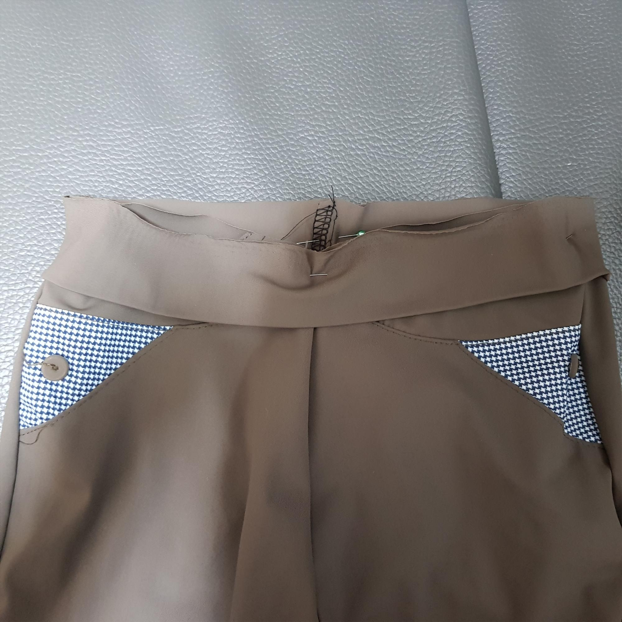 고무줄을 넣고 고무줄 끝을 재봉한다. 그리고 고무줄 구멍을 재봉하여 허리 벨트를 마무리한다.