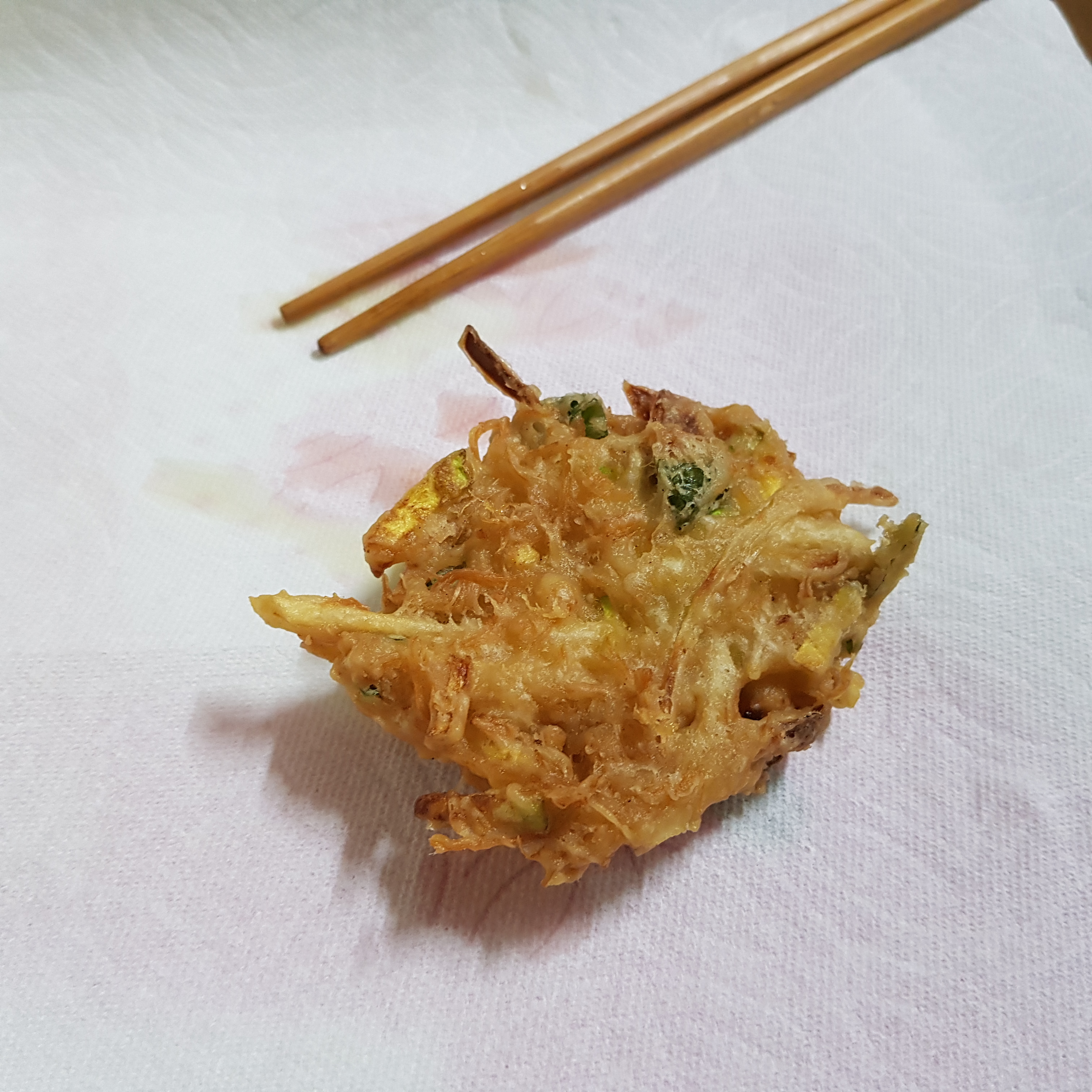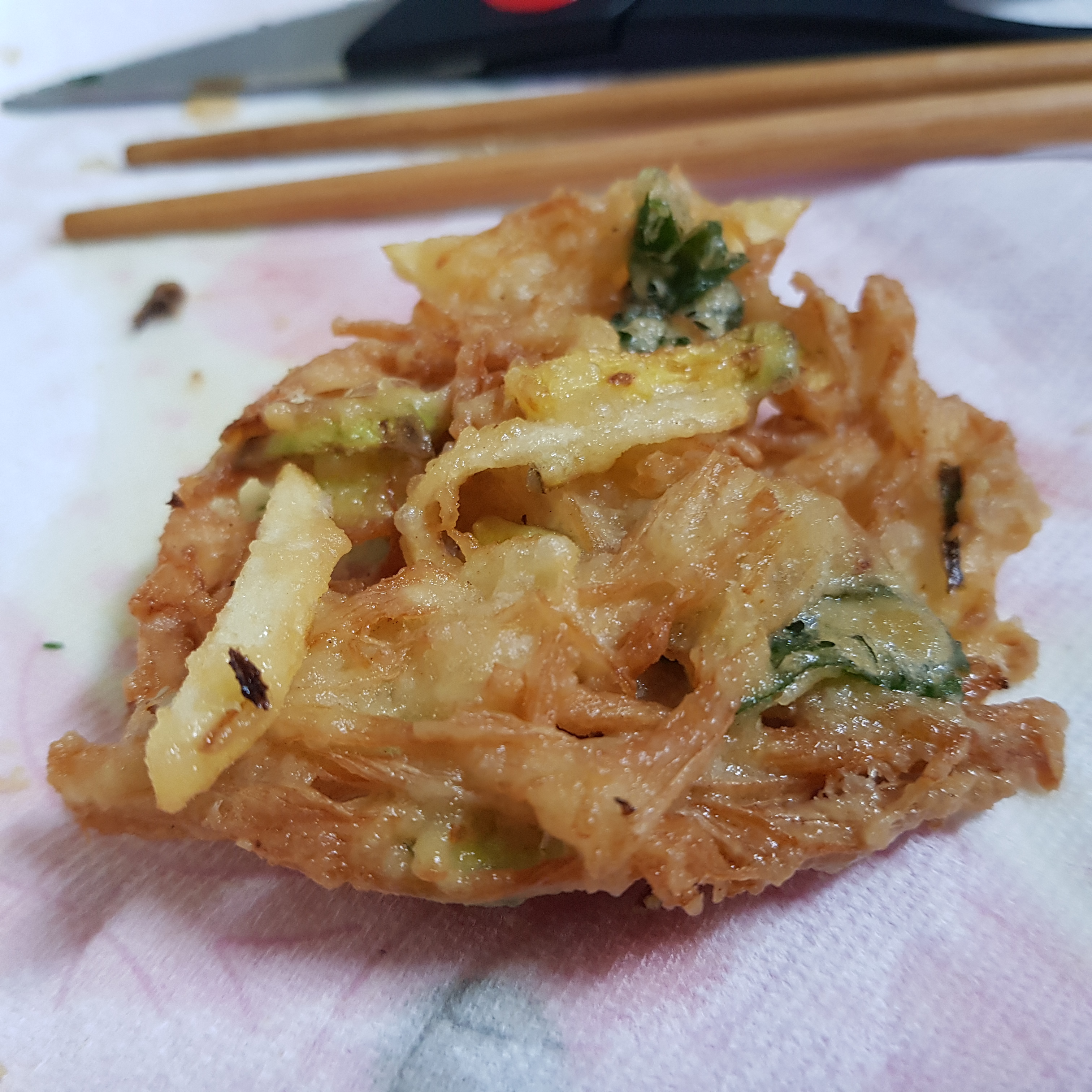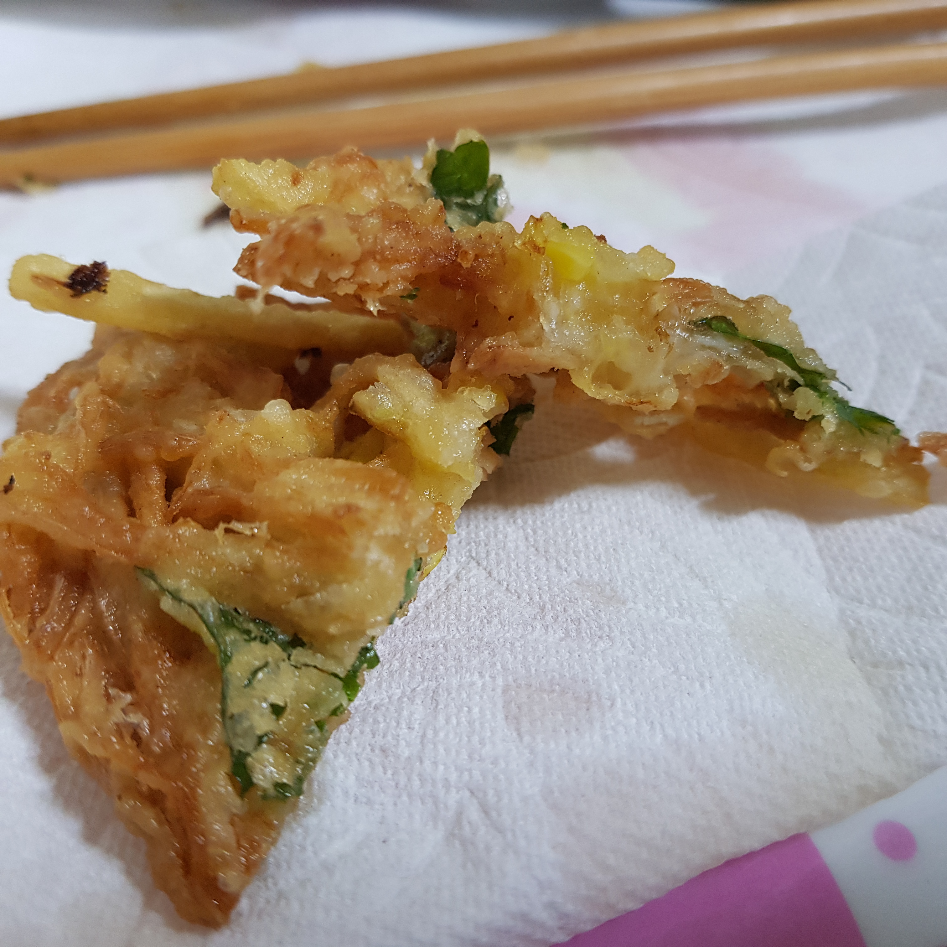 성공적인 야채튀김이다. 바삭거리고 기름에 튀겨서 맛도 좋다. 좀 싱겁긴 한데 간장 찍어 먹으면 될 거 같다. 야채튀김이란 걸 아이가 알면 안 먹을 테니 그냥 튀김이라고 해야지ㅋㅋㅋ