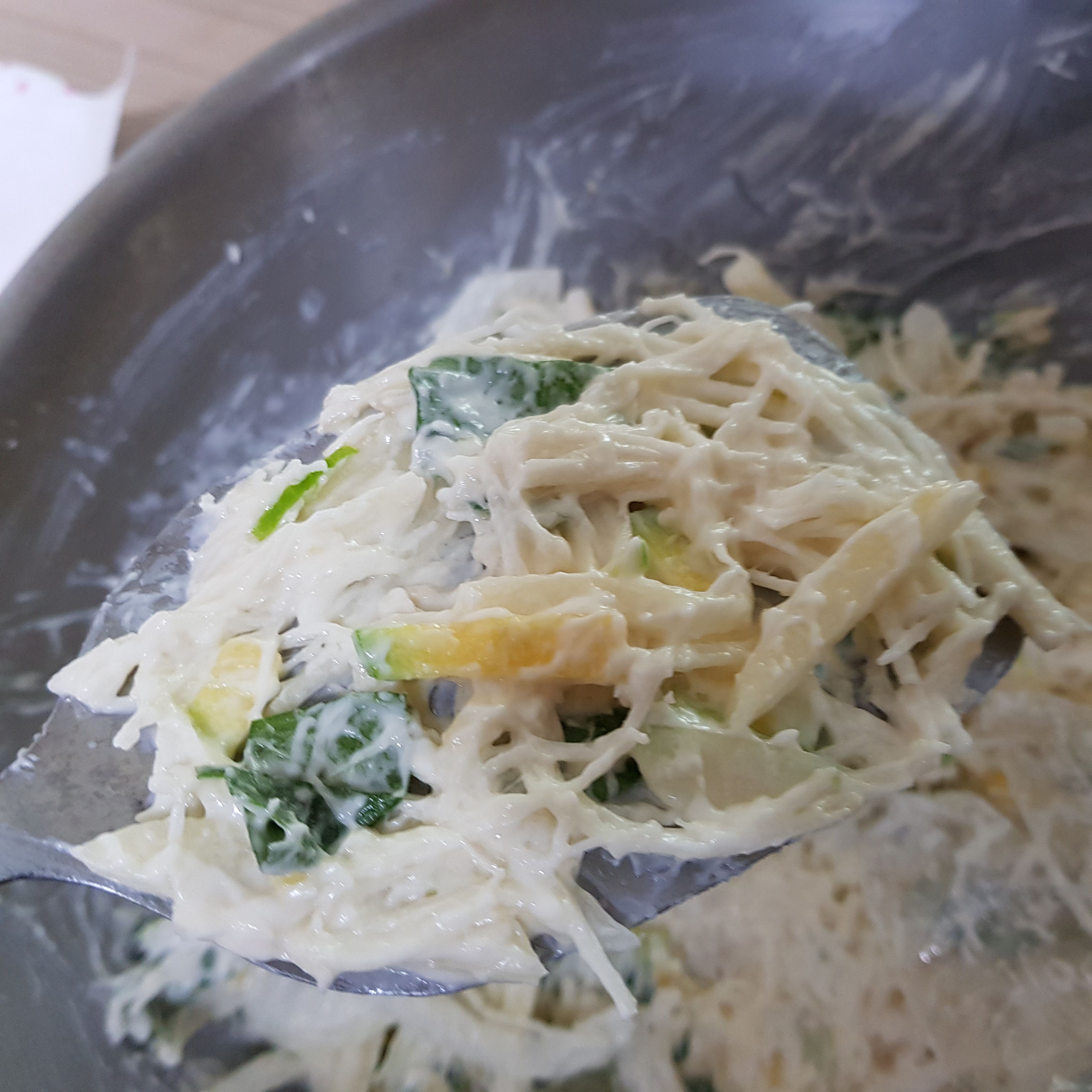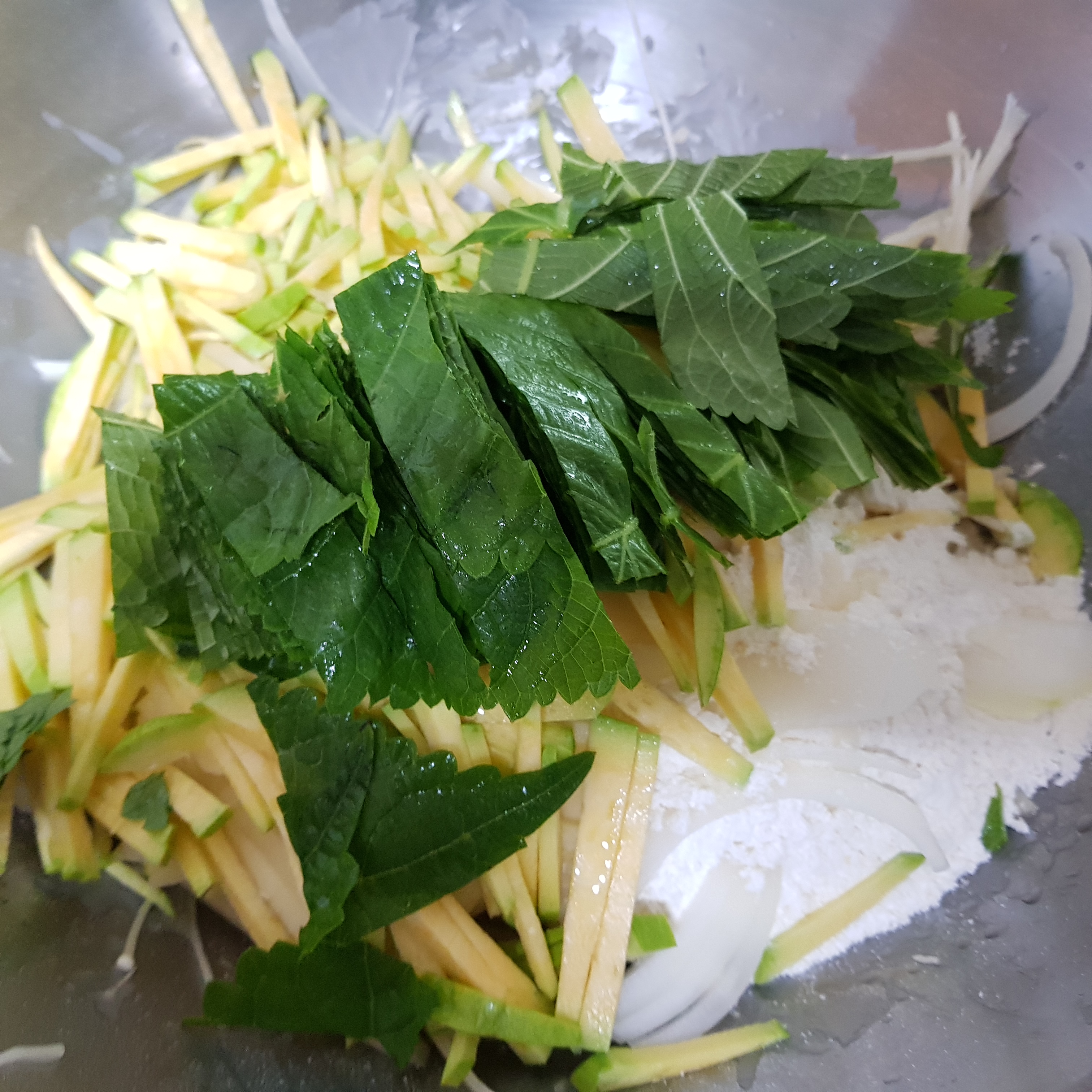 조금만 튀겨서 팽이버섯 튀김을 맛봤다. 식감이나 맛이나 아이가 좋아할 맛이 아니다. 아무리 좋은 레시피로 만든다고 해도 누가 만드냐에 따라서 천차만별의 맛을 내는 거 같다. 이런 게 손 맛이라고 하는 걸까?? 식용유 반죽이 익숙하지 않아서 그런지 바삭하지도 않고 맛도 별로다. 그래서 야채튀김으로 급하게 변경했다. 튀김가루 3컵 넣고, 양파와 감자 넣고, 호박, 깻잎 넣고, 물 두 컵 넣고 튀김 반죽을 했다.