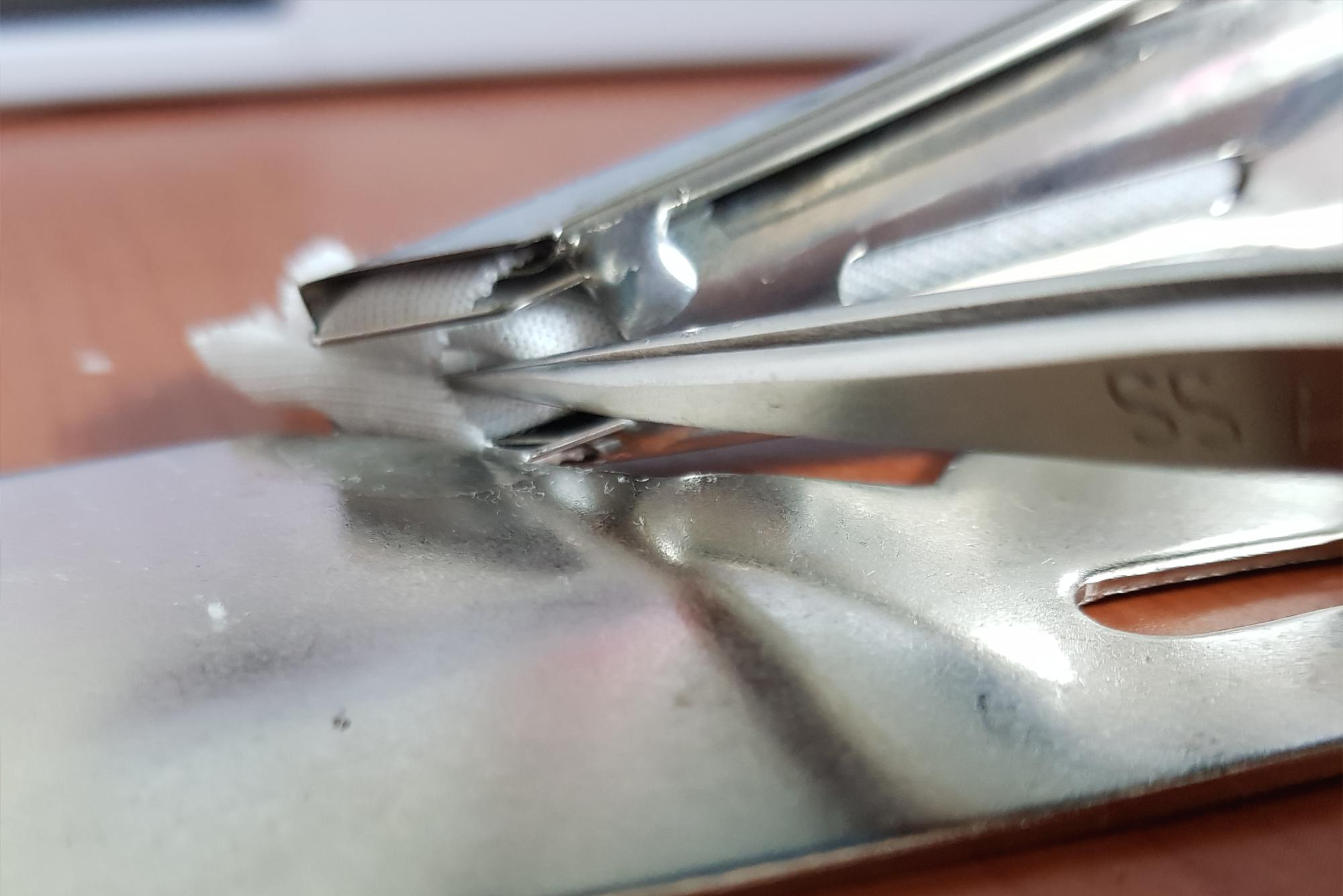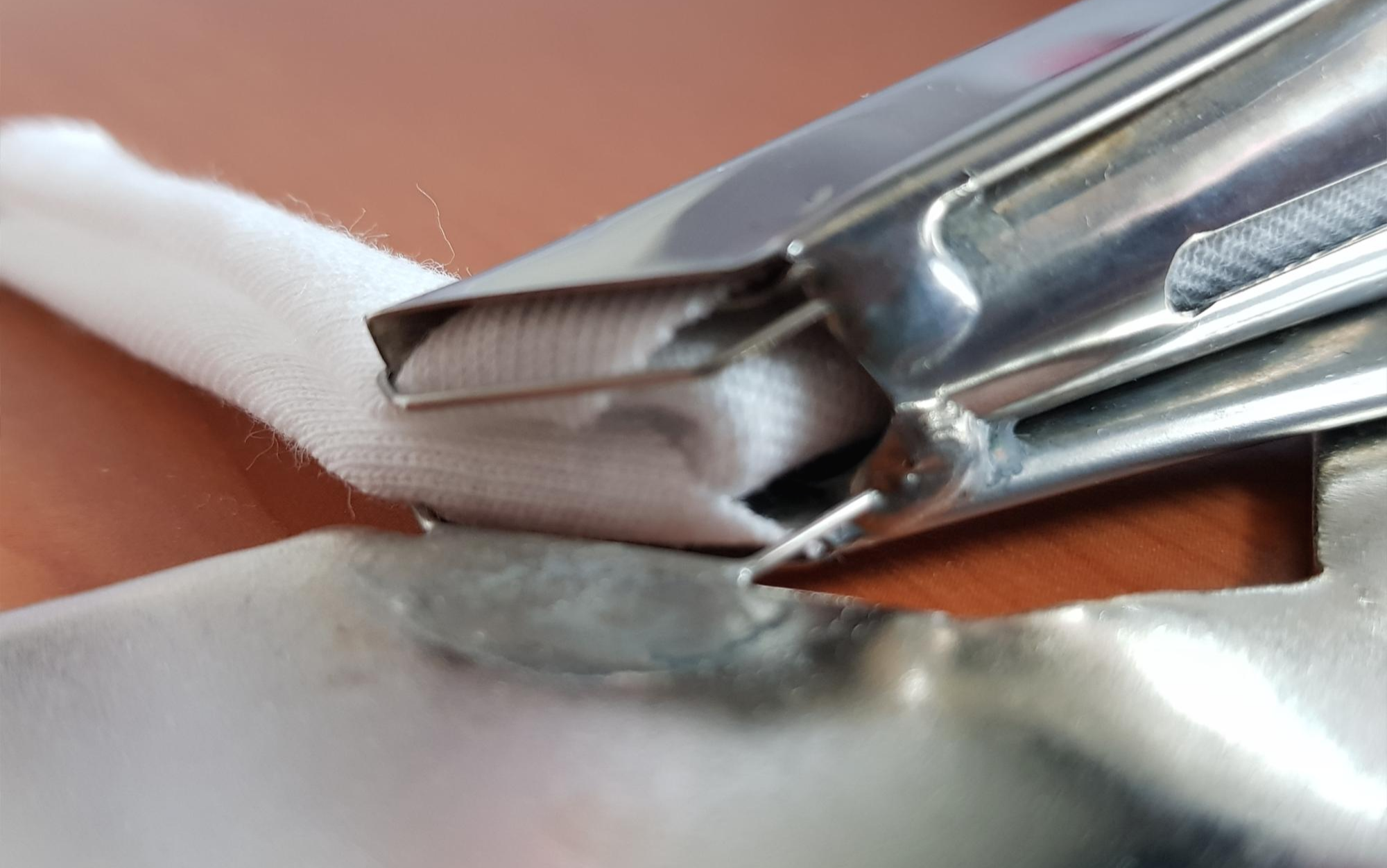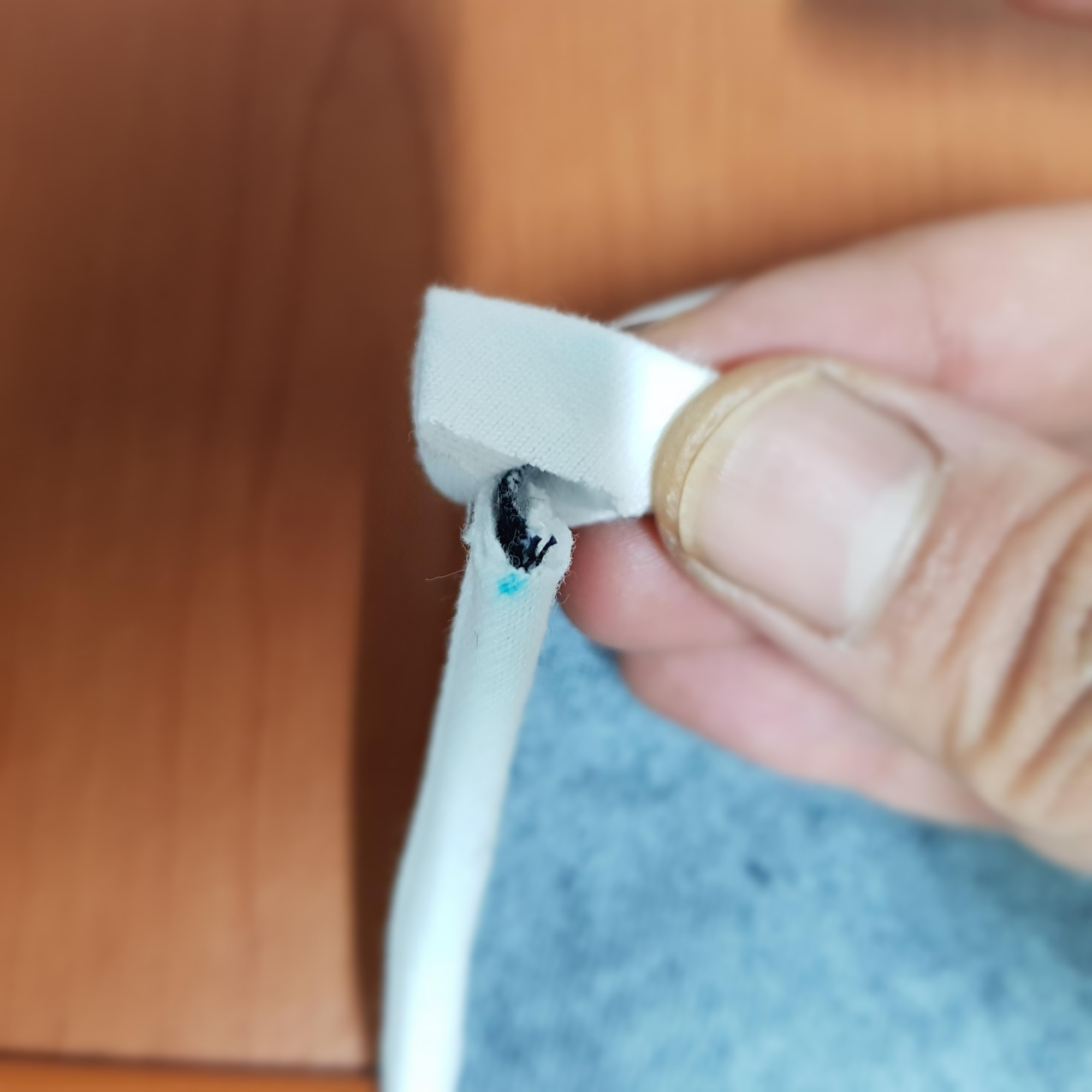 ③ 핀셋으로 바이어스 원단을 밀어 넣는다.