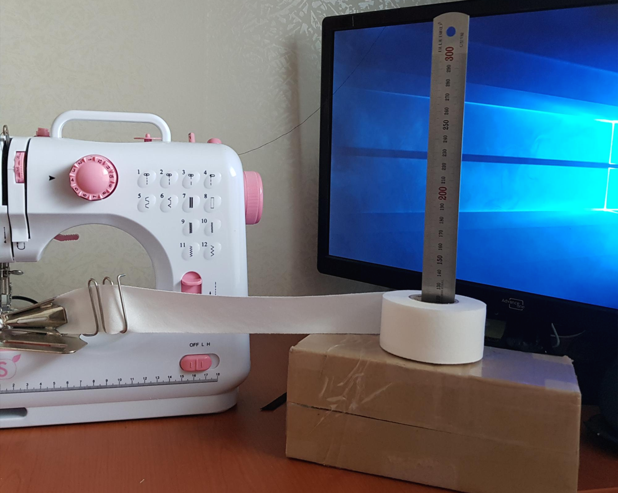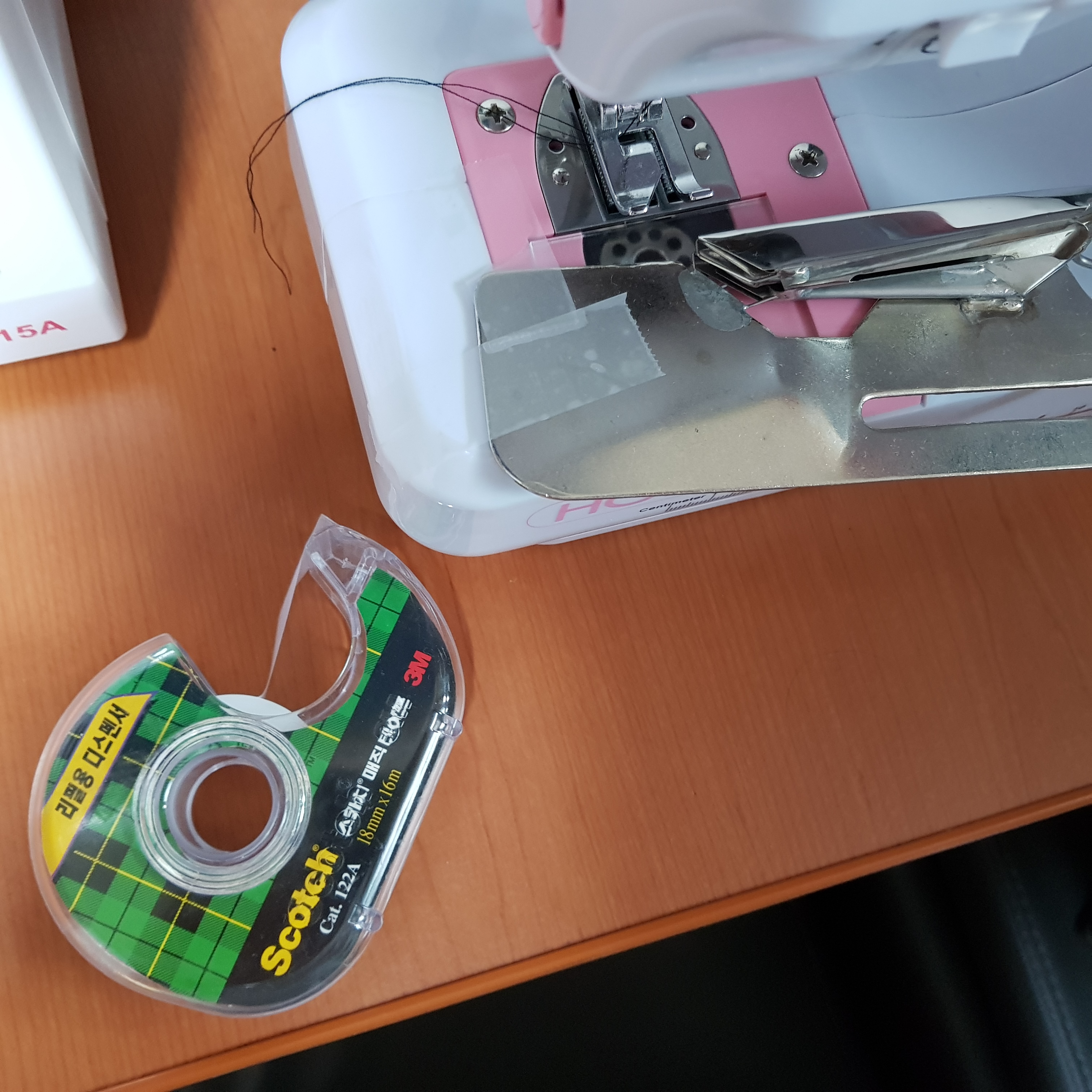 일단 아래 사진과 같이 테이프를 이용해서 바이어스 랍빠를 혼스 미니재봉틀에 붙였다. 랍빠가 흔들리지 않도록 고정해야 한다. 재봉하다 랍빠 흔들리면 박음질이 삐뚤빼뚤해서 엄청 짜증 난다. 랍빠를 고정할 때 원단이 나오는 랍빠 앞부분이 혼스 미니재봉틀의 바늘보다 살짝 왼쪽에 고정하는 것이 재봉하기 편하다. 재봉실이 바이어스 원단 밖으로 나가는 것을 방지하기 위해서다.