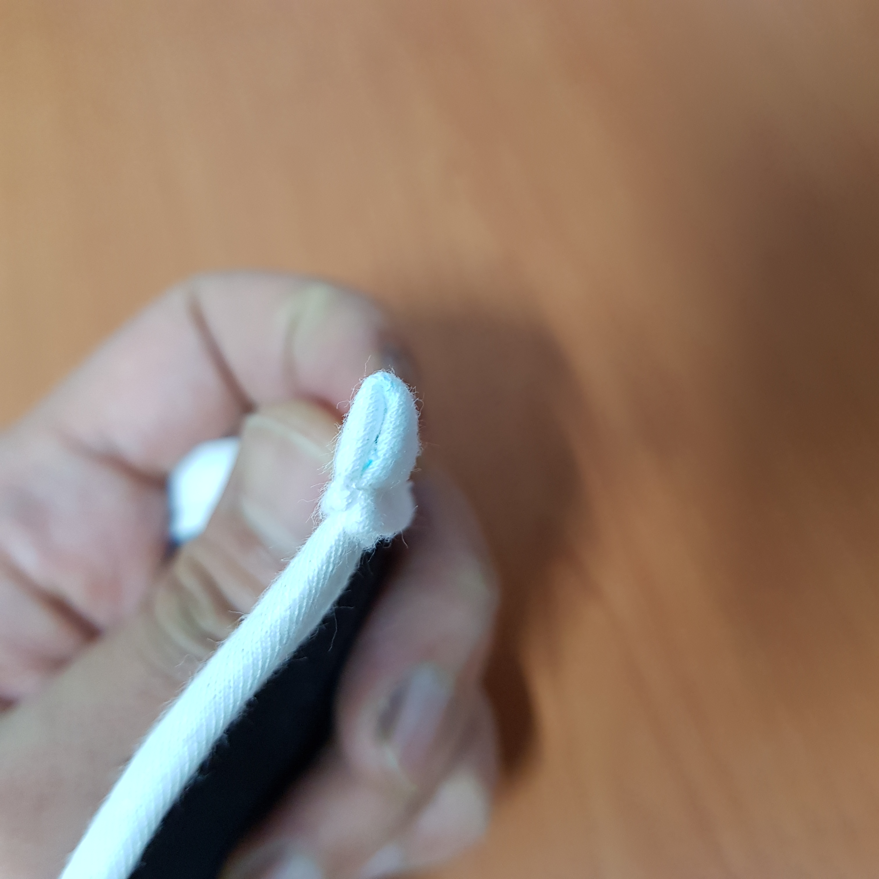 랍빠에 바이어스 원단 끼우기 연습을 해야한다. 어렵진 않지만 할 때마다 "어떻게 하는 거지?" 하면서 생각하게 된다. 처음에 무작정 바이어스 원단을 랍빠에 밀어 넣었더니 아래 사진과 같이 됐다. 뭔가 이상한데 뭐가 이상한지도 모르겠다.