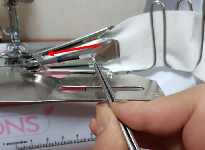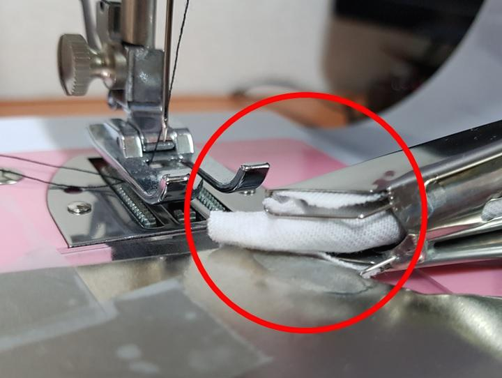 ⑥넉넉히 당겨서 혼스 미니 재봉틀 노루발에 넣는다.