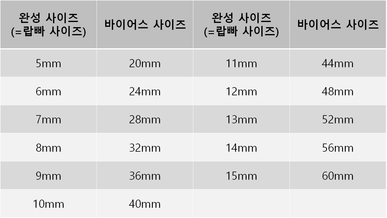 랍빠의 크기는 다양하다. 5mm, 6mm, 8mm, 10mm 등등(5677910111213145). 내가 구매한 10mm 랍빠는 완성사이즈가 10mm이다. 그러므로 바이어스는 40mm를 사용해야 한다. 가장 보편적으로 사용하는 크기가 10mm 같다. 아이들 내복에 바이어스가 모두 10mm이다.