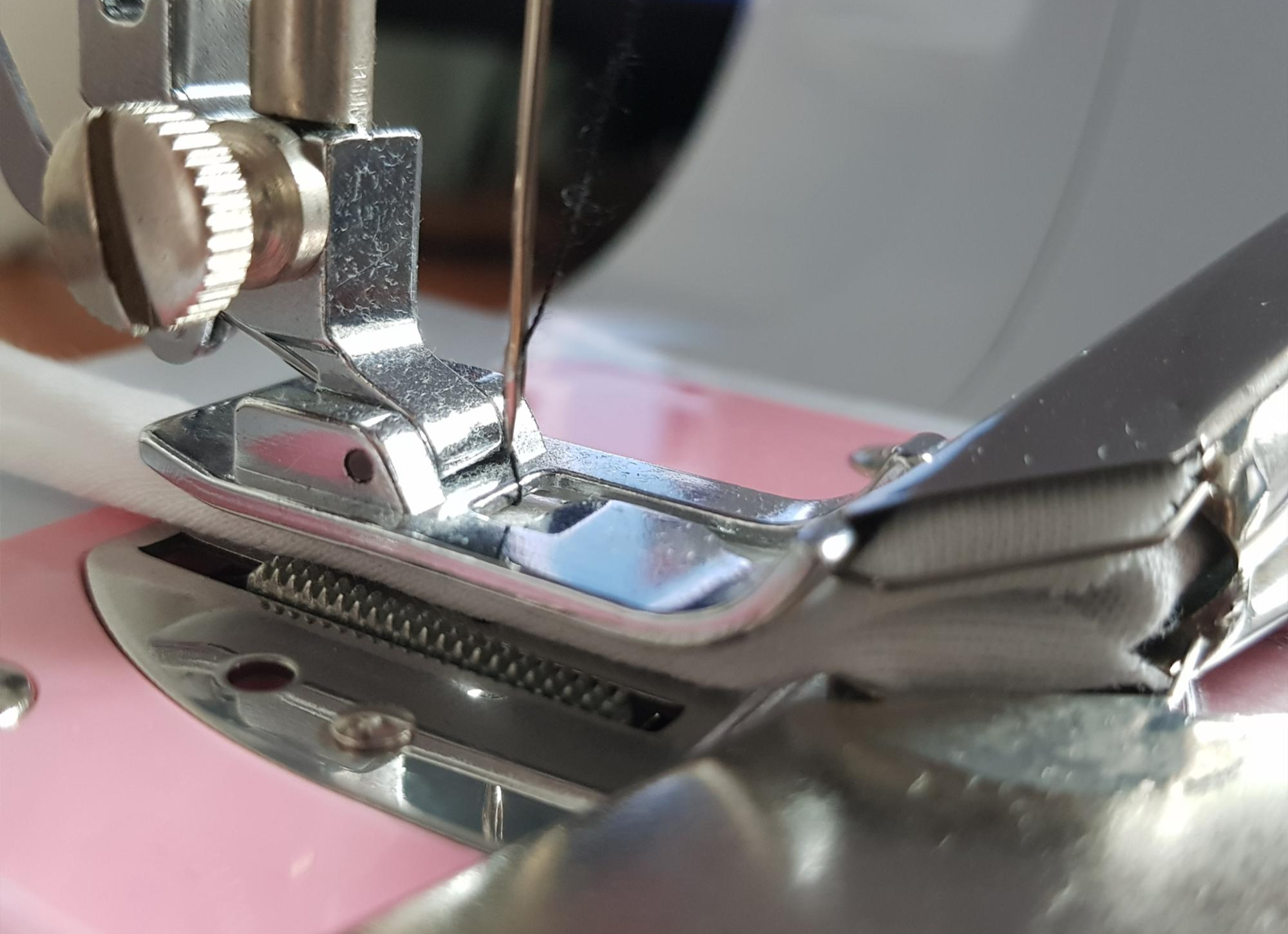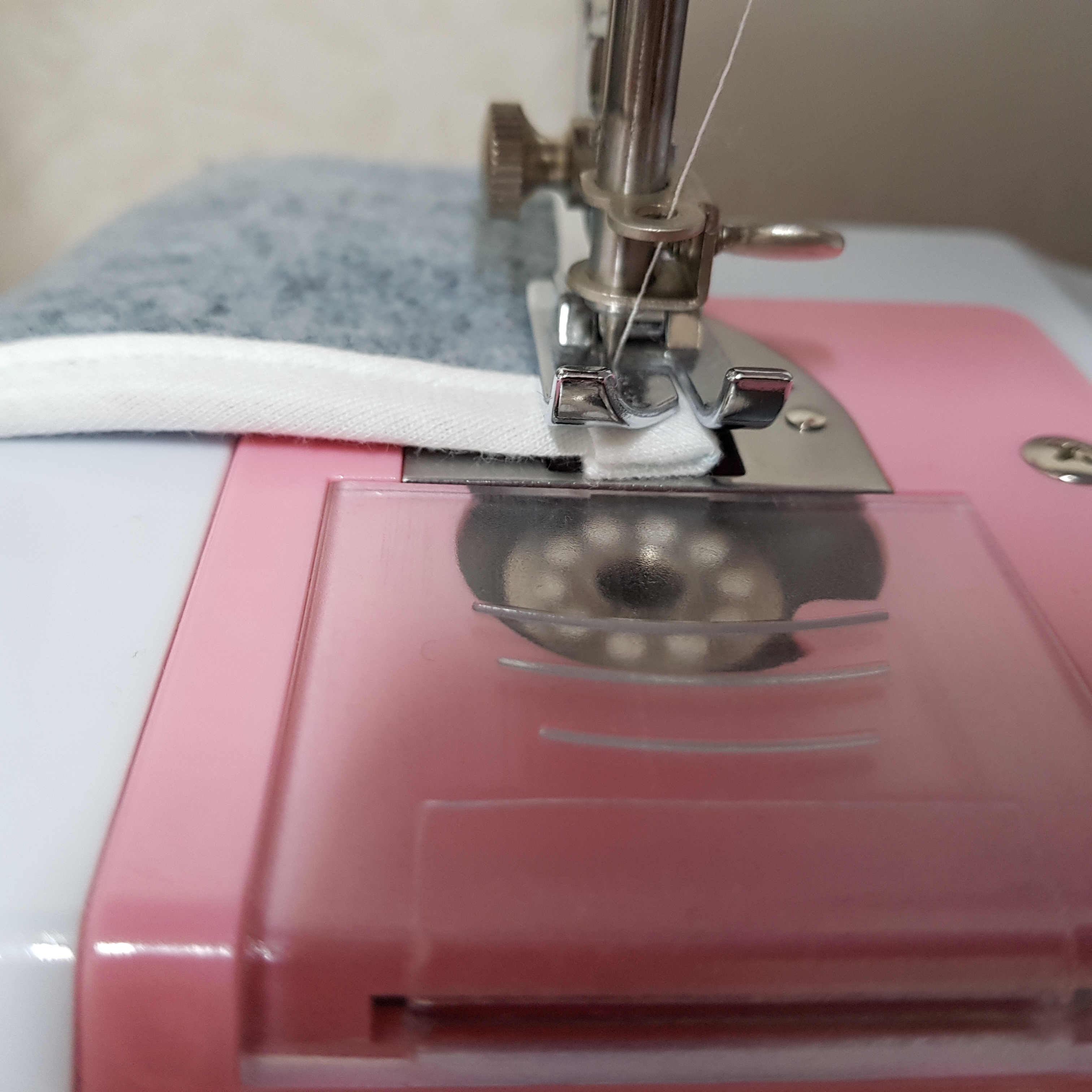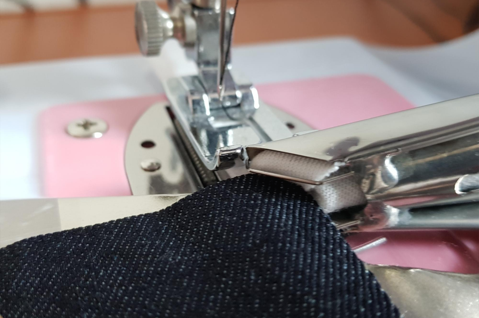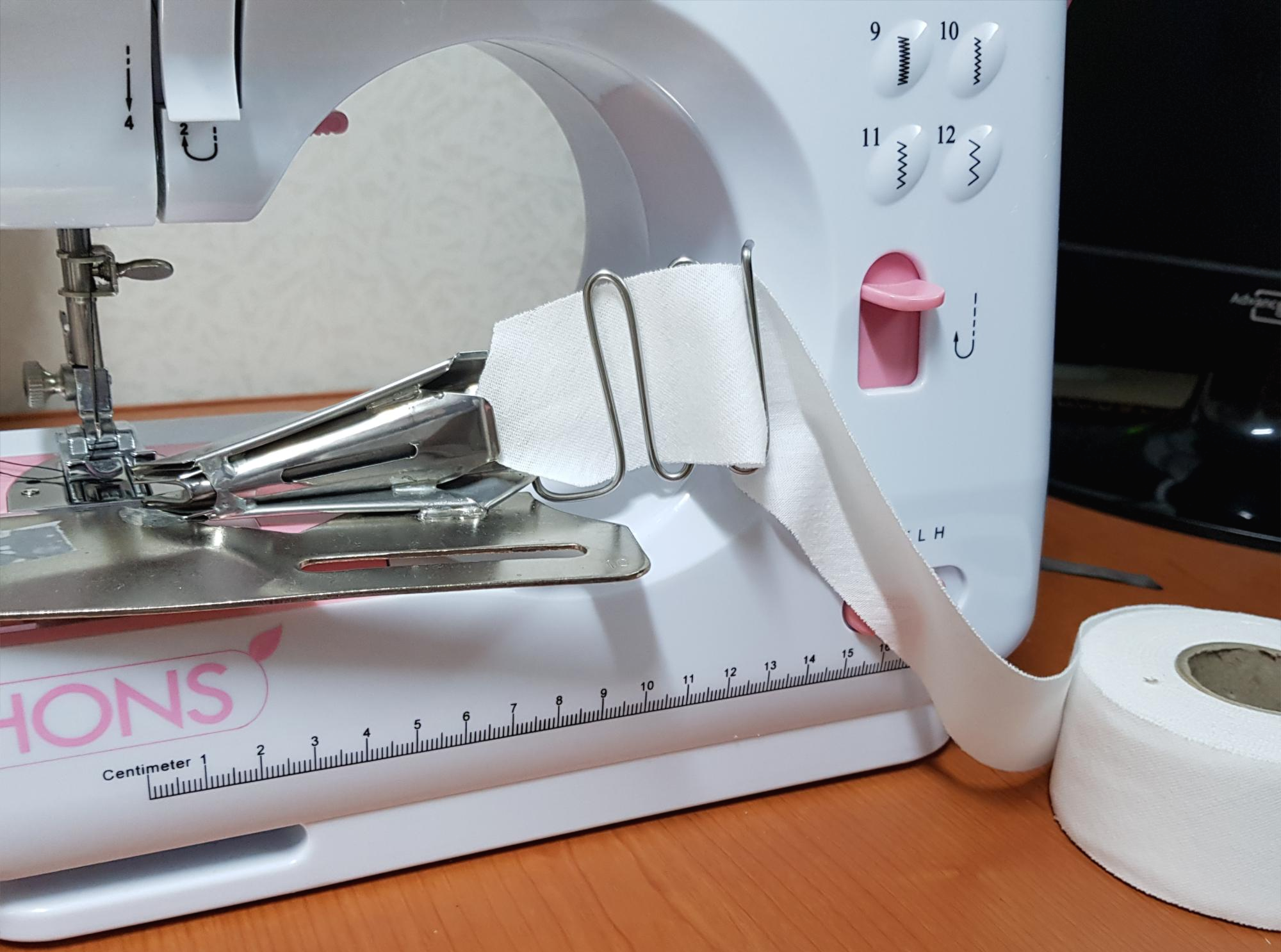 혼스 미니재봉틀은 크기가 워낙 작아서 랍빠를 혼스 미니재봉틀에 고정하기 전에 랍빠에 바이어스 원단을 끼우고 랍빠를 고정하는 것이 편하다.