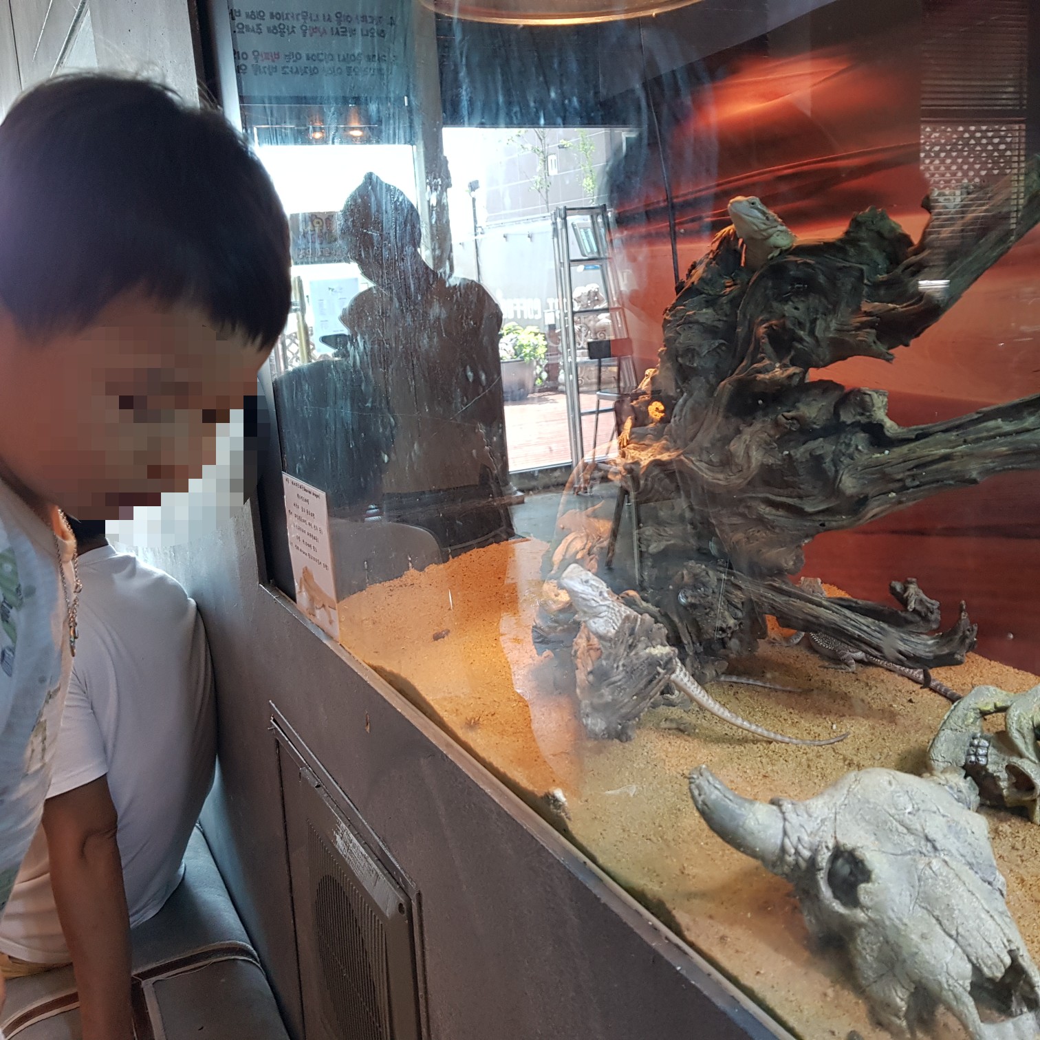 주문한 음료가 나오길 기다리며 두리번두리번거리는데 벽에 수족관처럼 보이는 것이 있다. 아이와 가봤다. 도마뱀!! 3종류의 도마뱀이 있다. 아이가 도마뱀 쪽으로 얼굴을 가까이 들이민다. 신기한 건지 겁이 없는 건지... 나는 파충류가 징그러운데. 나는 안 보련다!!!!