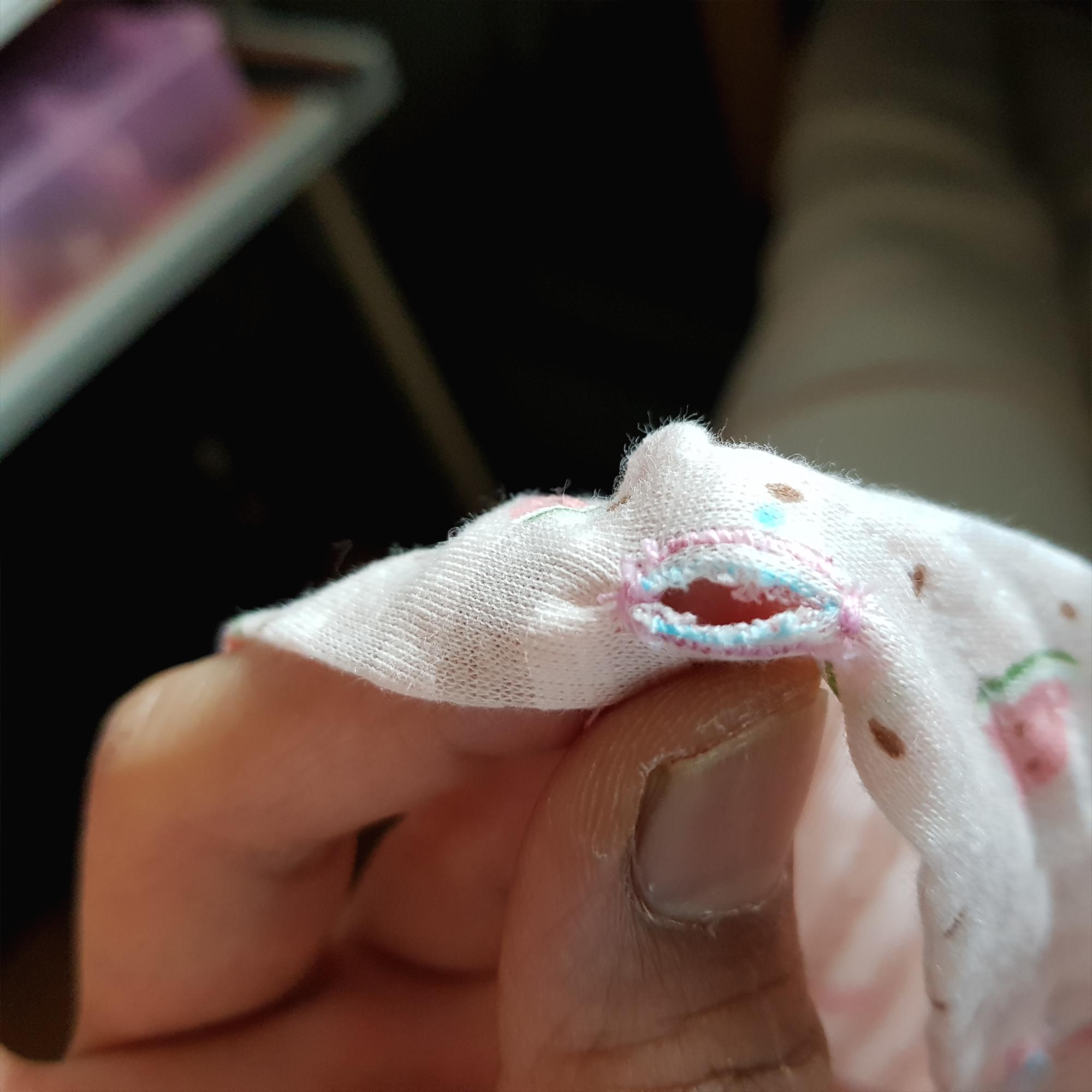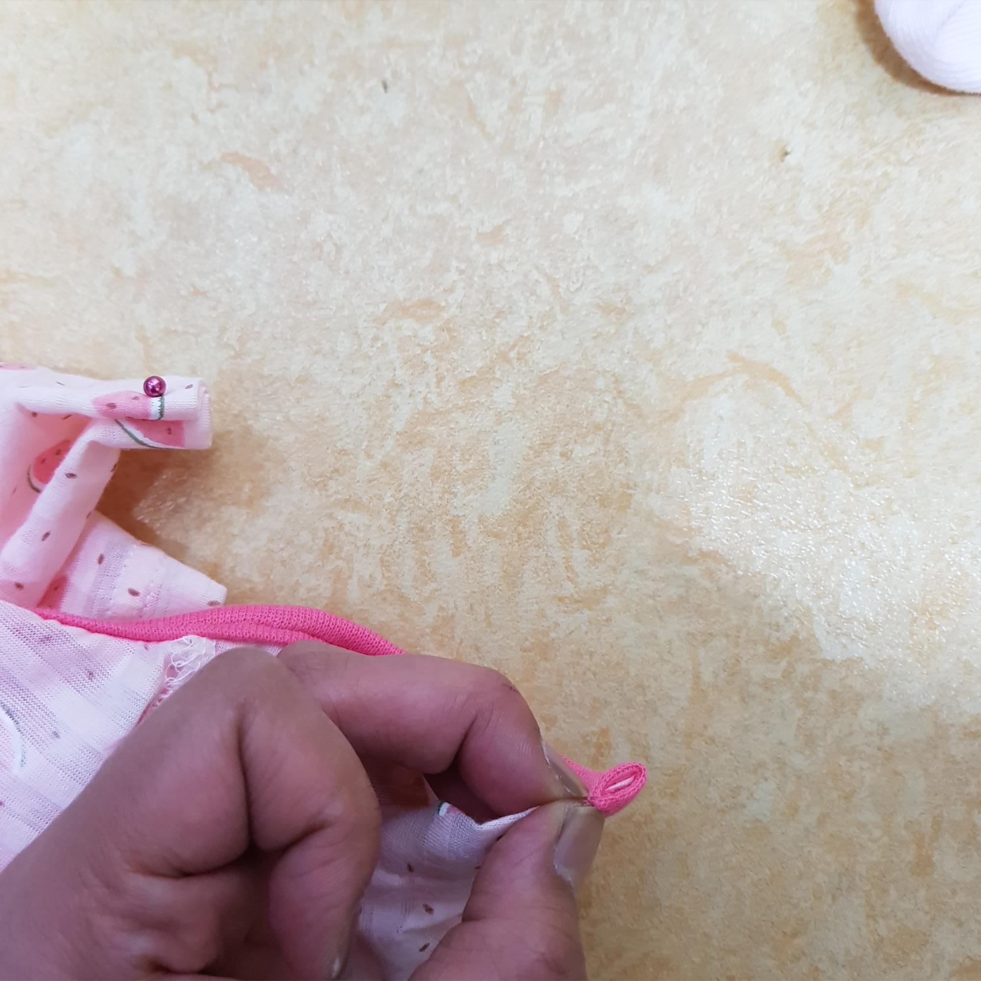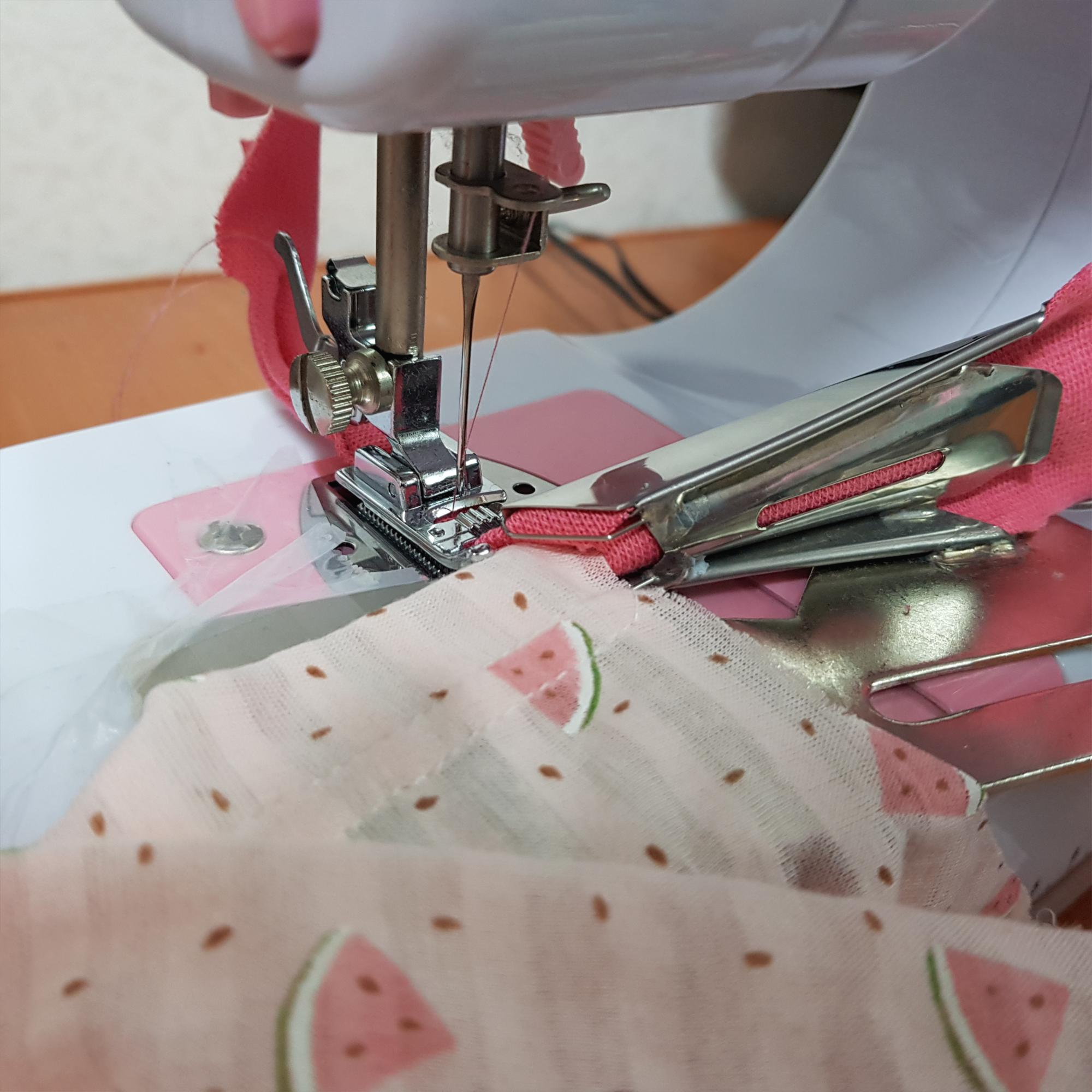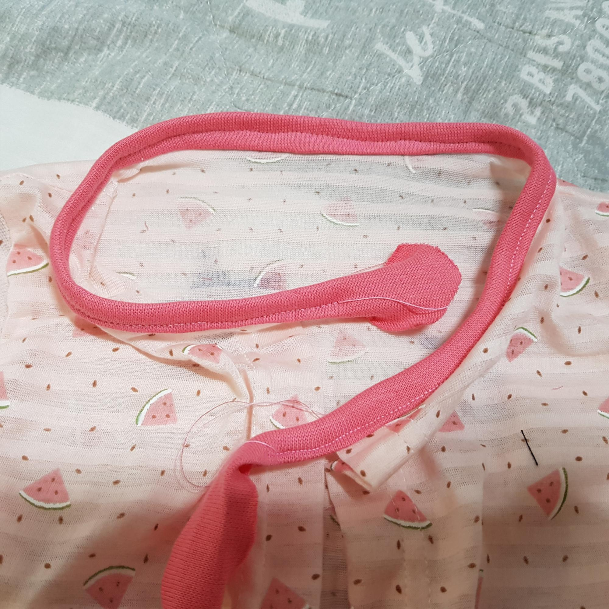 아래 사진과 같이 혼스 미싱으로 바이어스 랍빠를 이용해 목둘레에 바이어스를 달았다. 재봉선이 삐뚤빼뚤해서 예쁘지 않다. 맘에 들지 않는다.