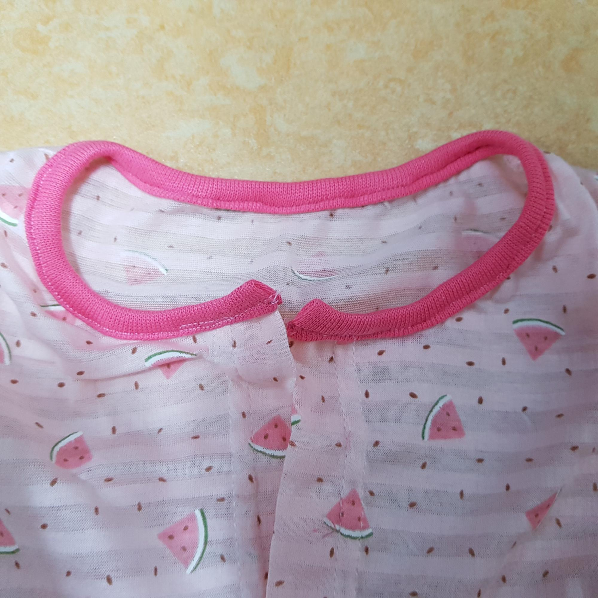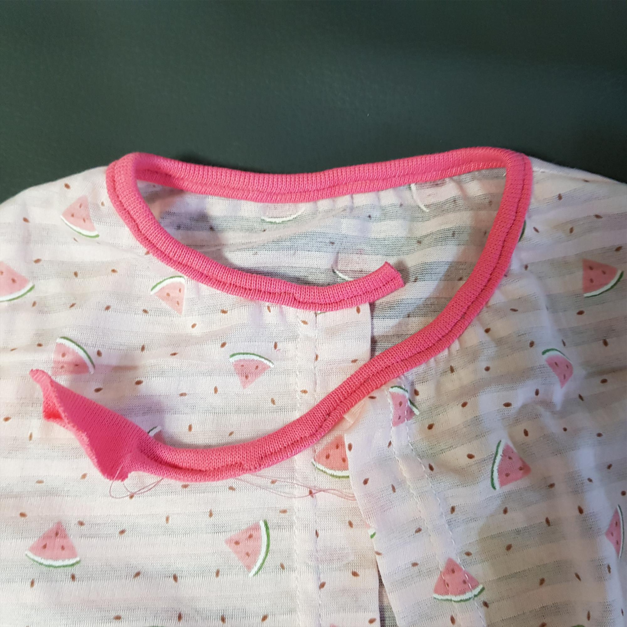 너덜너덜 한 부분을 가위로 자르고 바이어스 랍빠를 이용해서 다시 달았다. 3차 시도도 역시 삐뚤빼뚤 하지만 여기서 만족해야 했다. 또 뜯으면 원단을 버려야 할 것 같았기 때문이다. 아래 사진이 3차 시도 후 목 바이어스 완성한 모습니다. 그나마 원시적인 방법으로 달았을 때 보다 낫다.