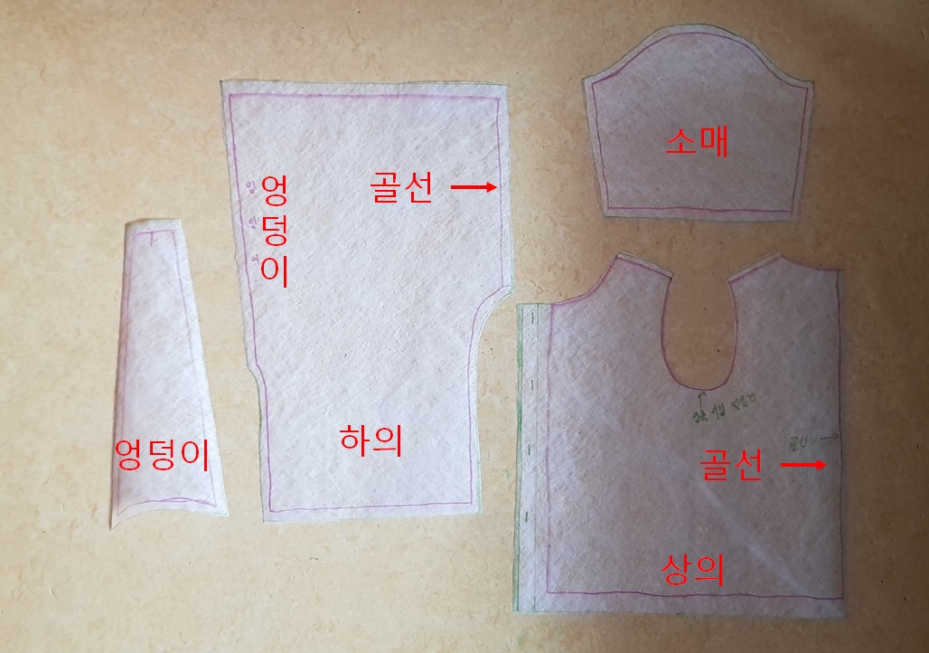 패턴을 그릴 때 골선을 잘 확인했어야 했는데 바지의 골선을 만들지 않았다. 재단하고 알았다. 죈장! 하지만 여분의 원단이 없기 때문에 그냥 만들기로 했다. 그래서 완성 사진에 보면 바지 앞부분에 재봉선이 있다.ㅠㅠ