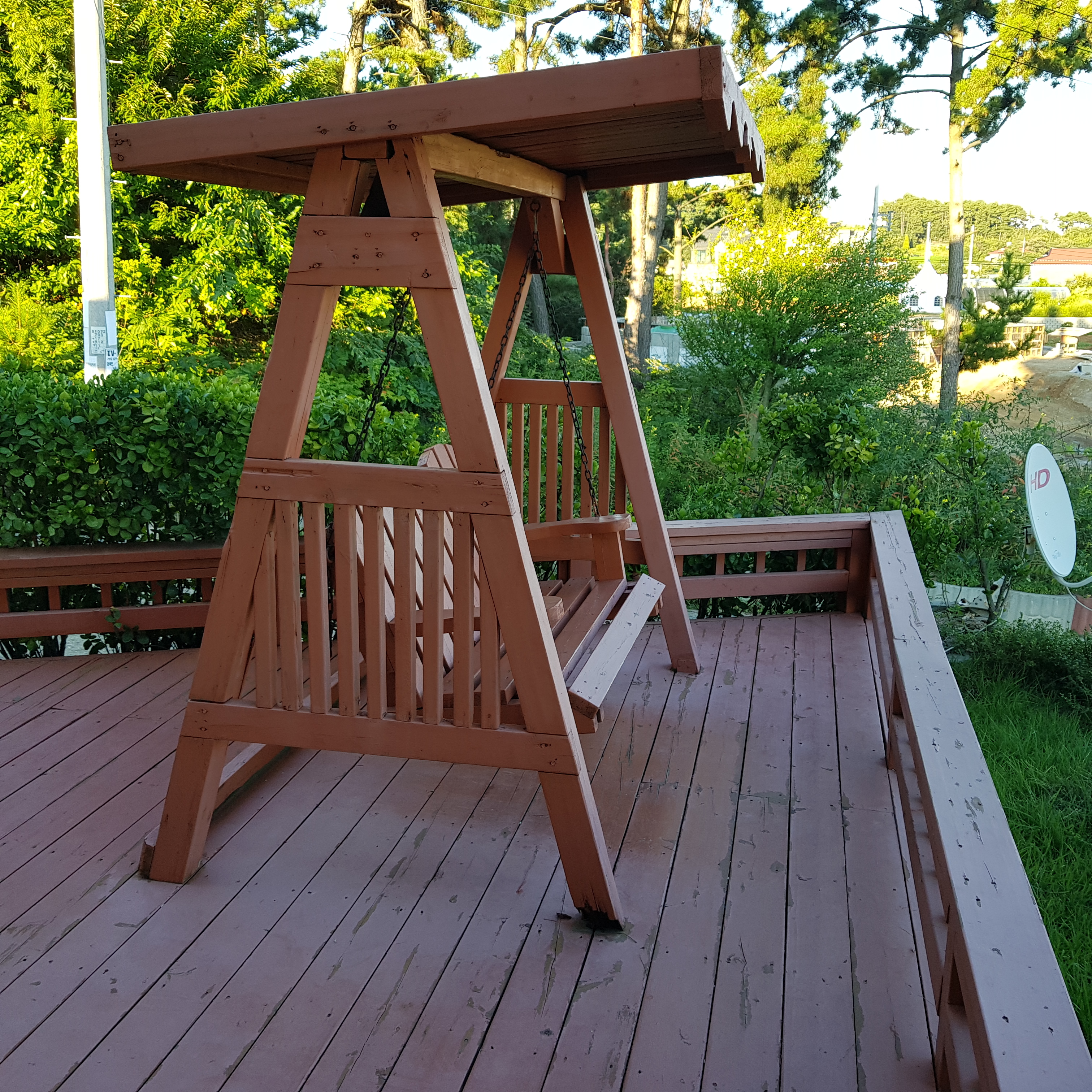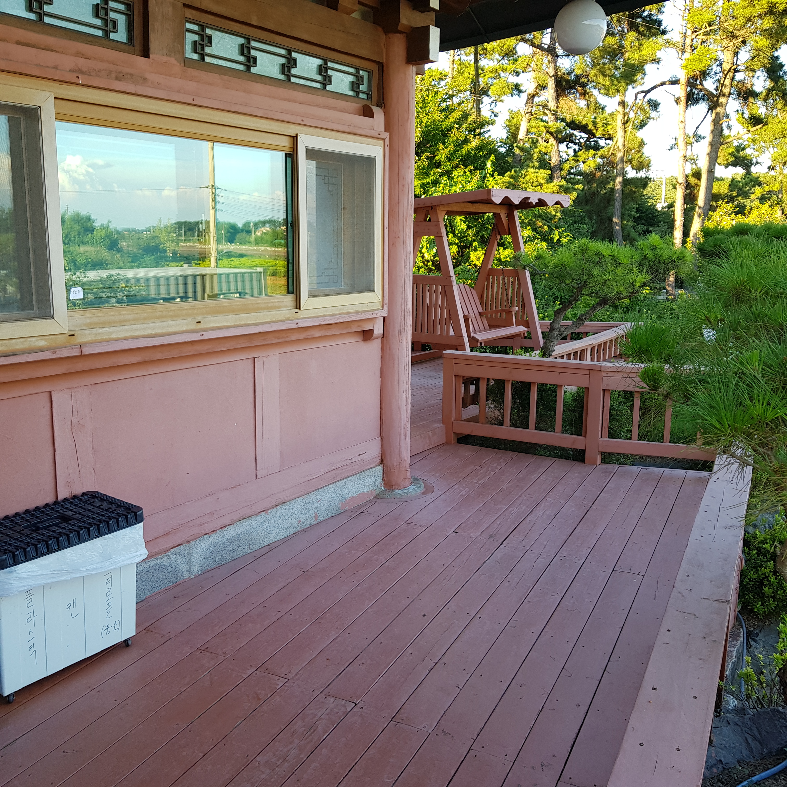 들어가는 입구 왼쪽으로는 수영장이 있고 오른쪽에는 그네가 있다.