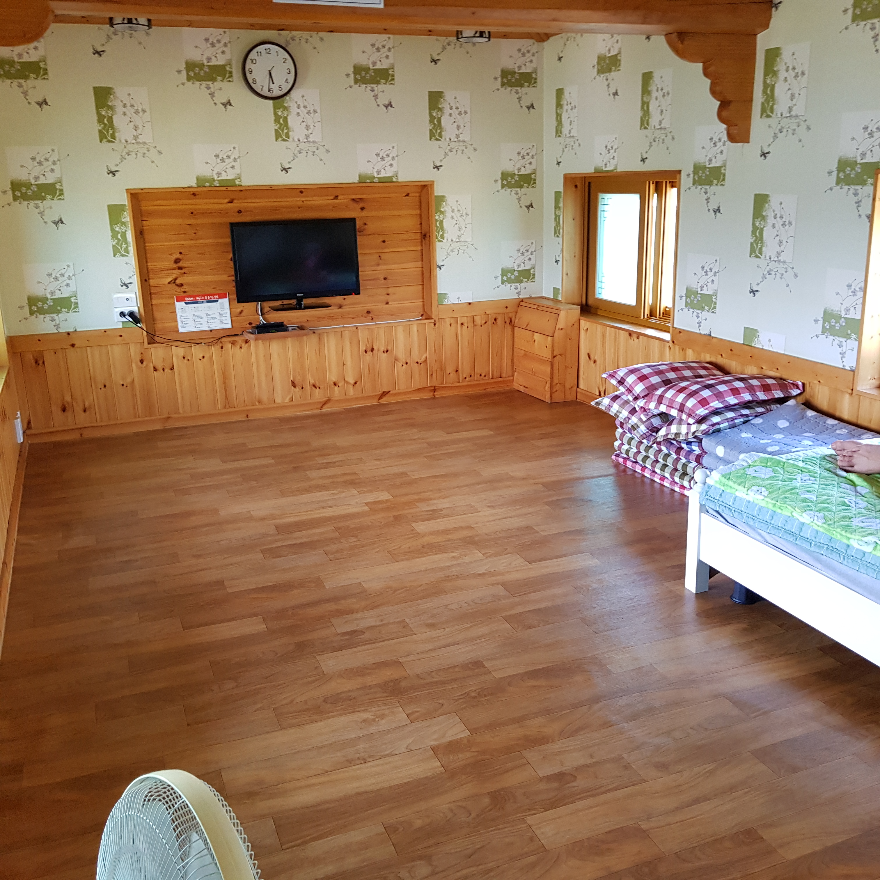2층 큰방이다. 작은 싱글 침대가 하나 있고 이불도 있고 텔레비전도 있다.