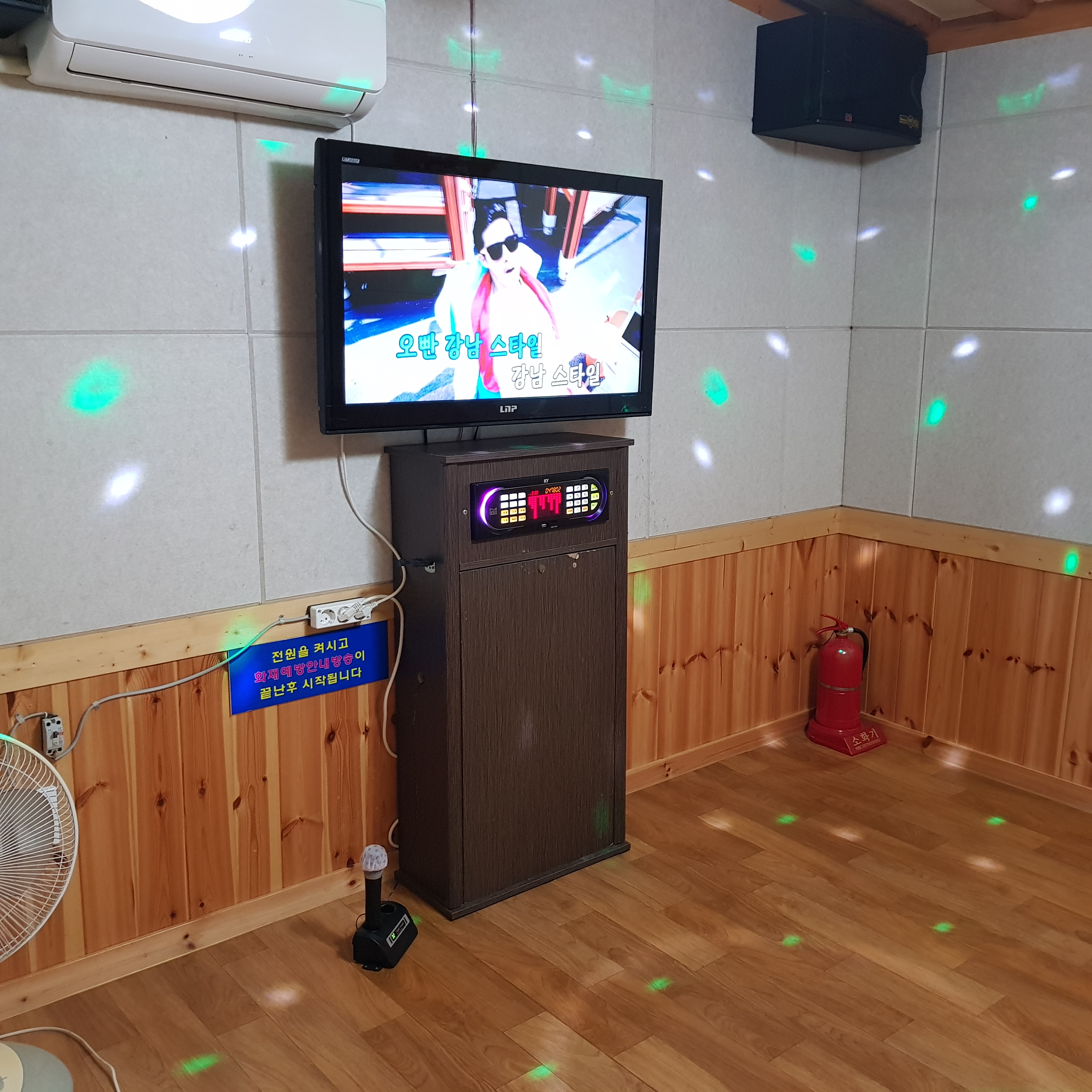 1층에 노래방이다. 노래방에 에어컨도 있다. 다른 방에는 에어컨이 없는데 거실과 노래방에만 에어컨이 있다. 다만 노래방에 사이키 조명을 끄면 에어컨을 작동할 수 없다.