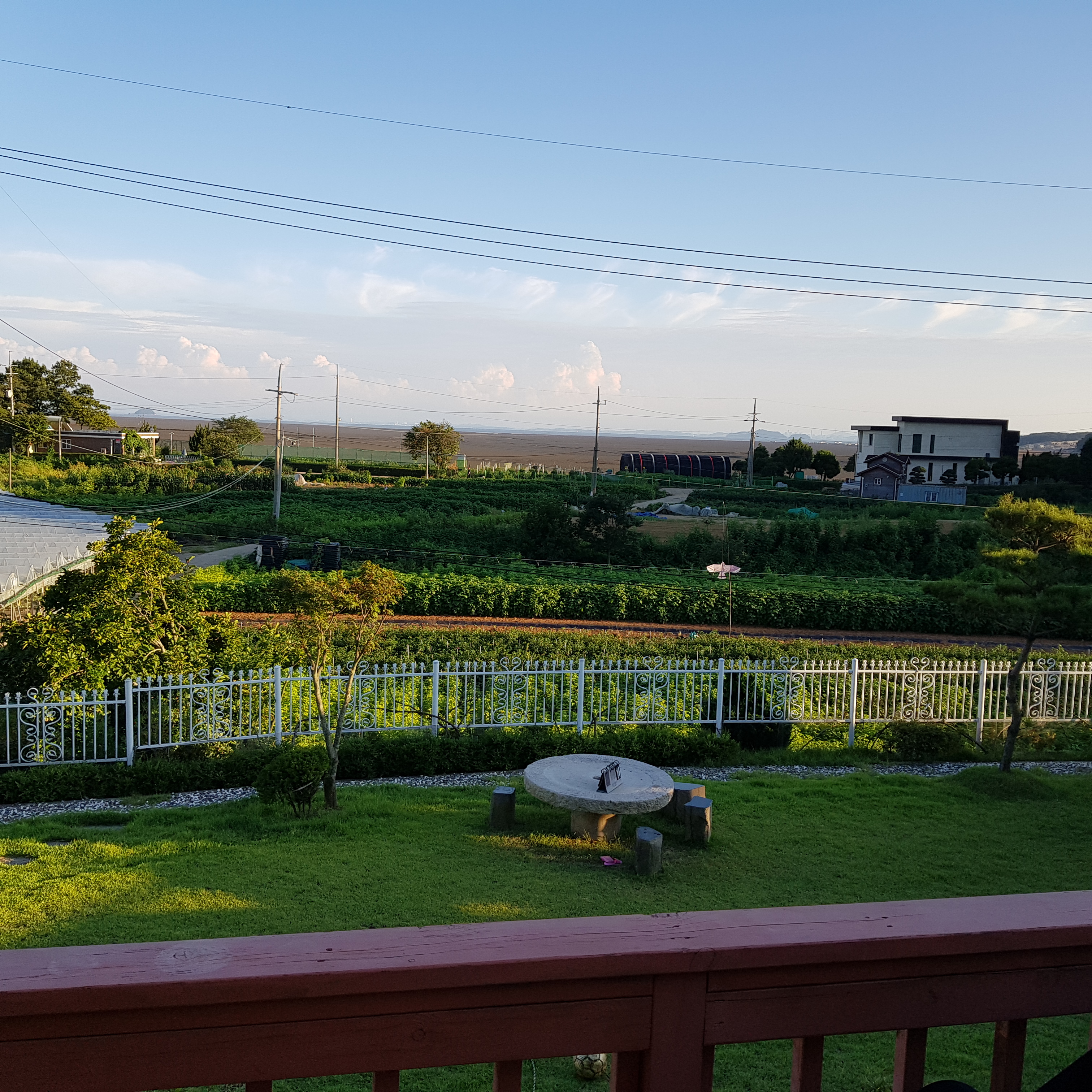 한옥에서 바라보면 저 멀리 바다도 보인다. 아래 사진에선 썰물이라 갯벌만 보이는데 물이 들어오면 멋진 바다 풍경도 볼 수 있다. 이런 집에서 살고 싶다..... 정원도 아름답고 수영장도 있고 아이들이 뛰어놀기도 좋고 공기 좋고....