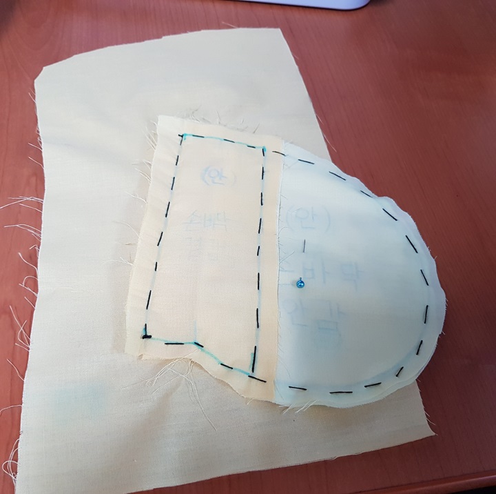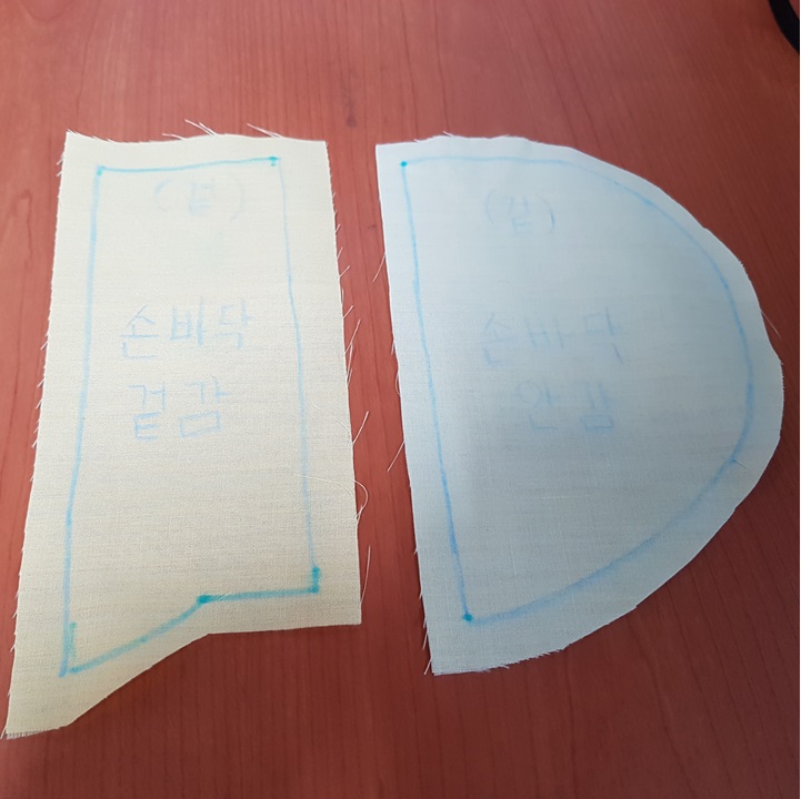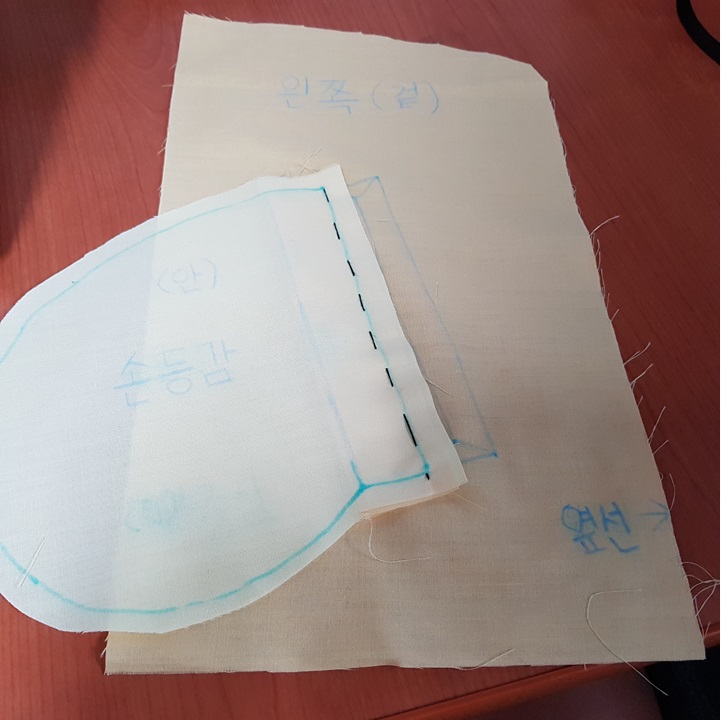 아래 사진에서 검은 점선과 같이 손바닥 안감과 손바닥 겉감을 재봉하여 손바닥감을 만든다.