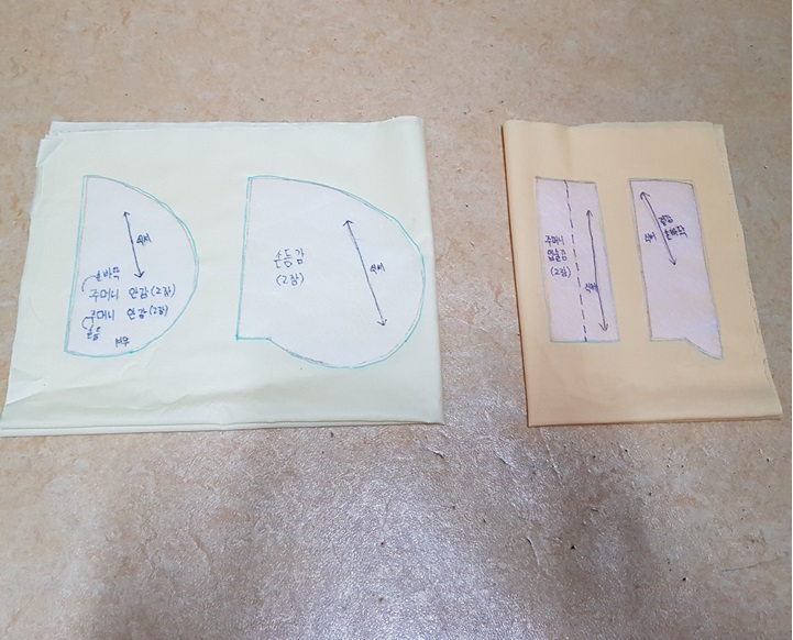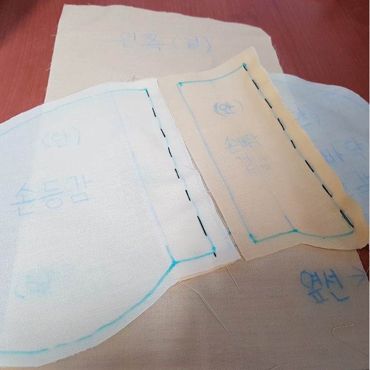 연습할 몸판도 만들고 주머니 감들은 시접 1cm 정도 남기고 재단했다.